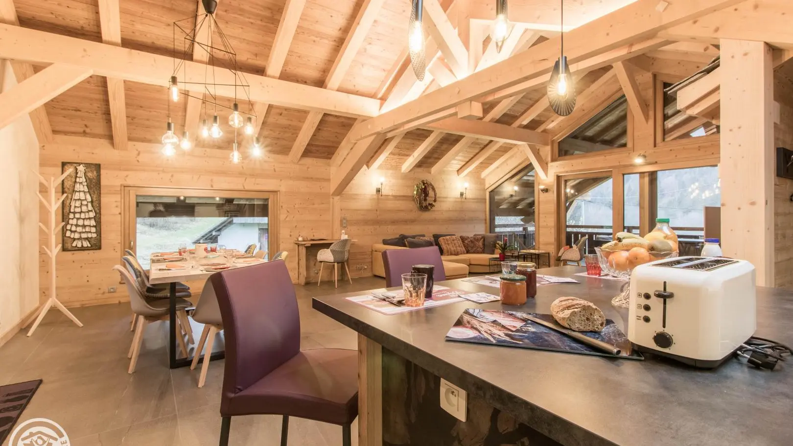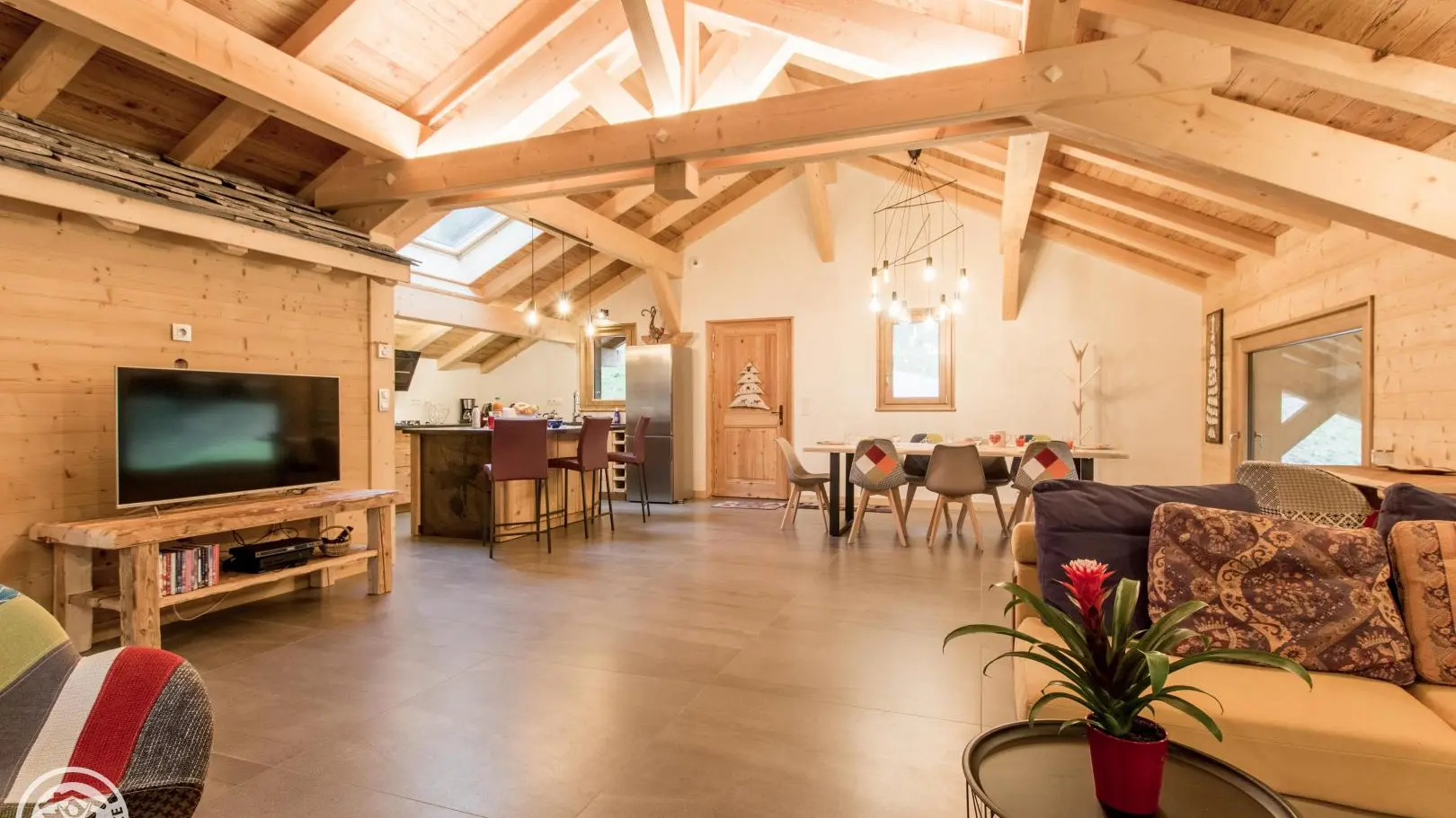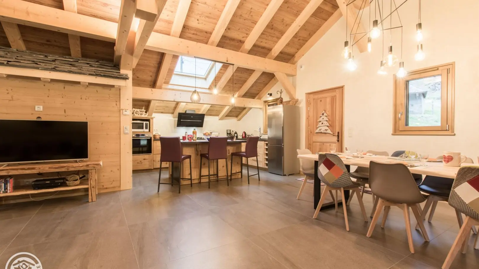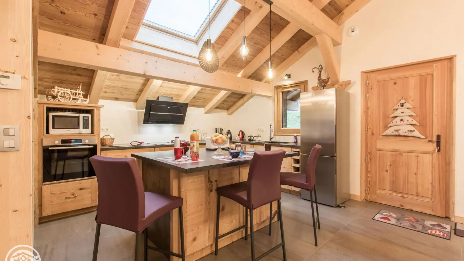 1 ° piano dello chalet: bella cucina attrezzata aperta sul soggiorno e sulla sala da pranzo, grande bovindo che dà accesso al terrazzo balcone coperto. 1 WC indipendente.