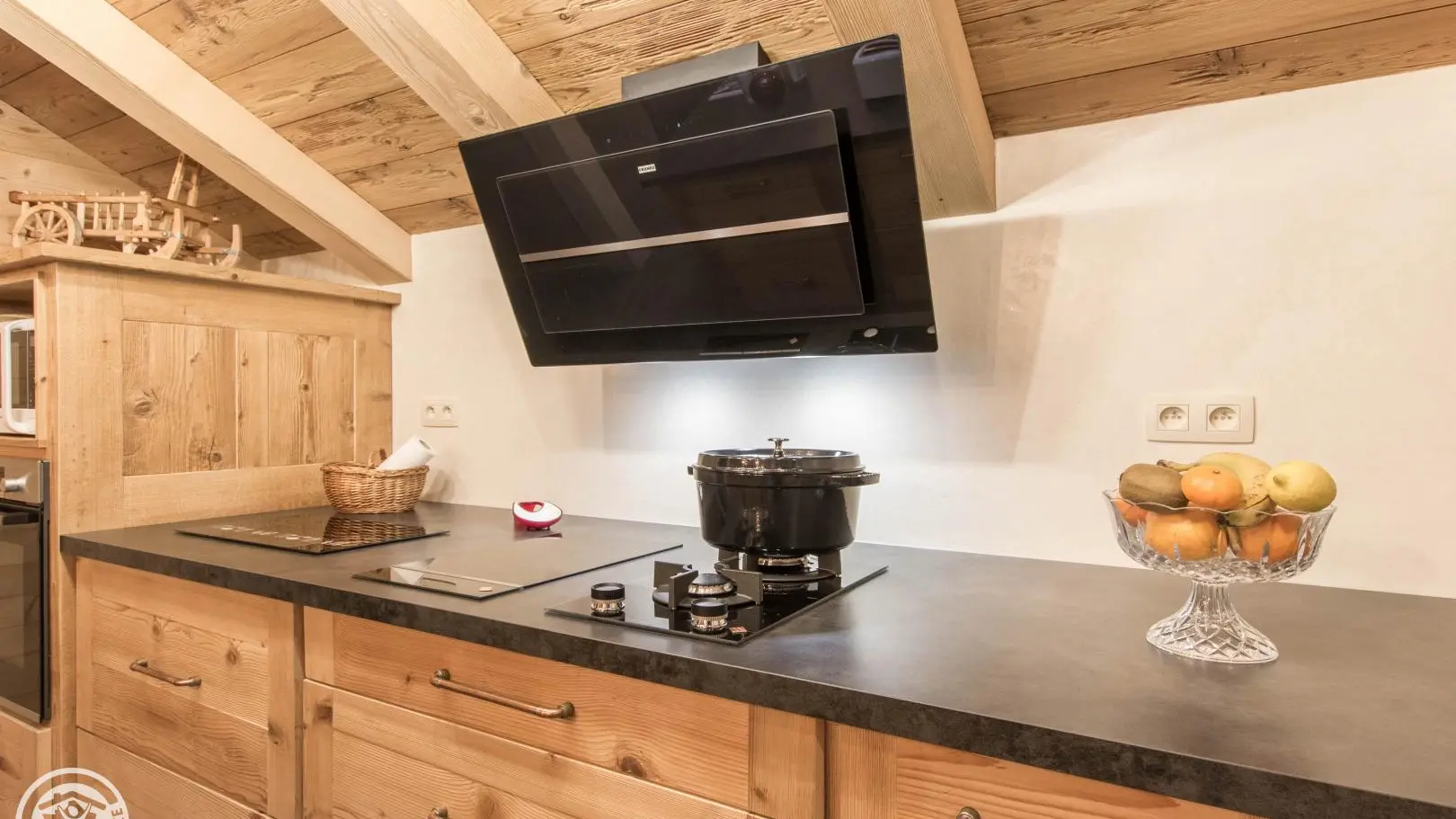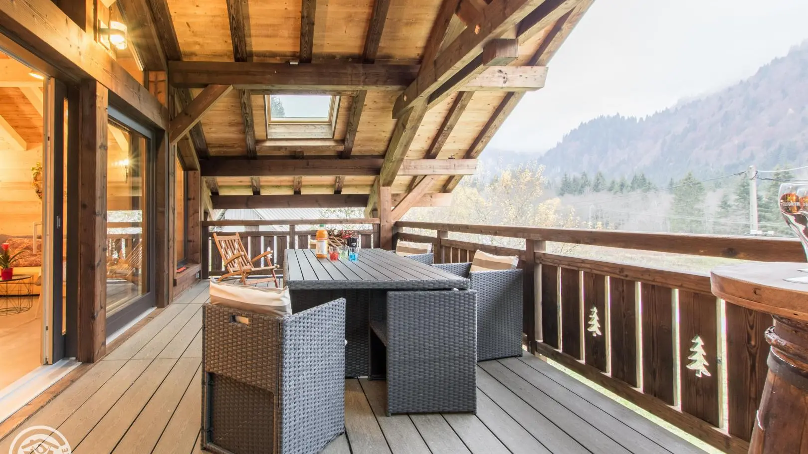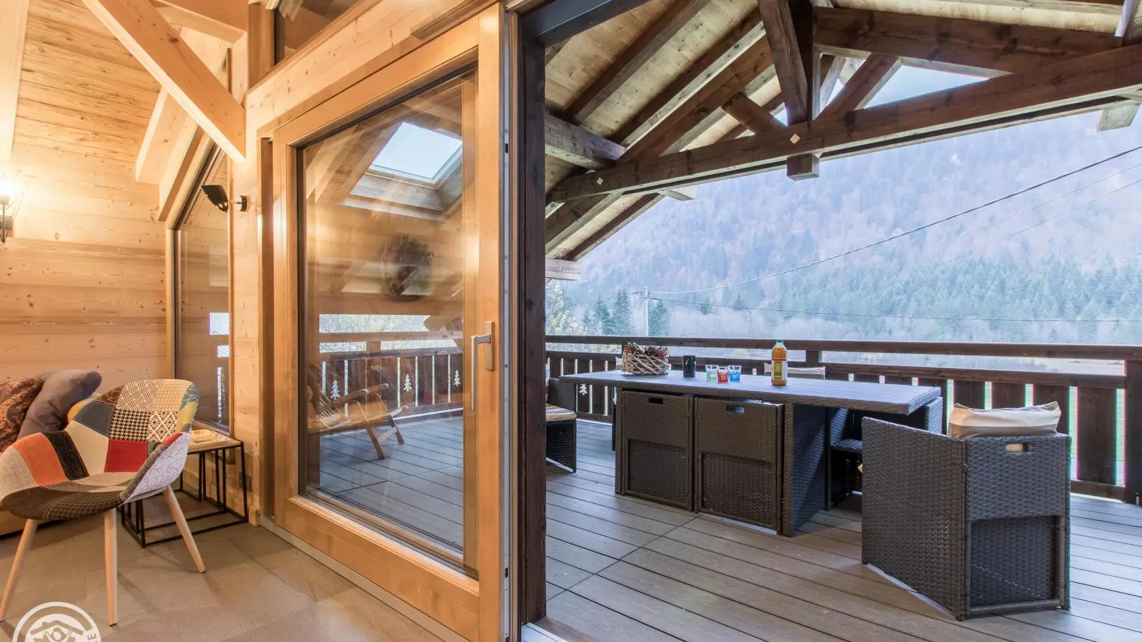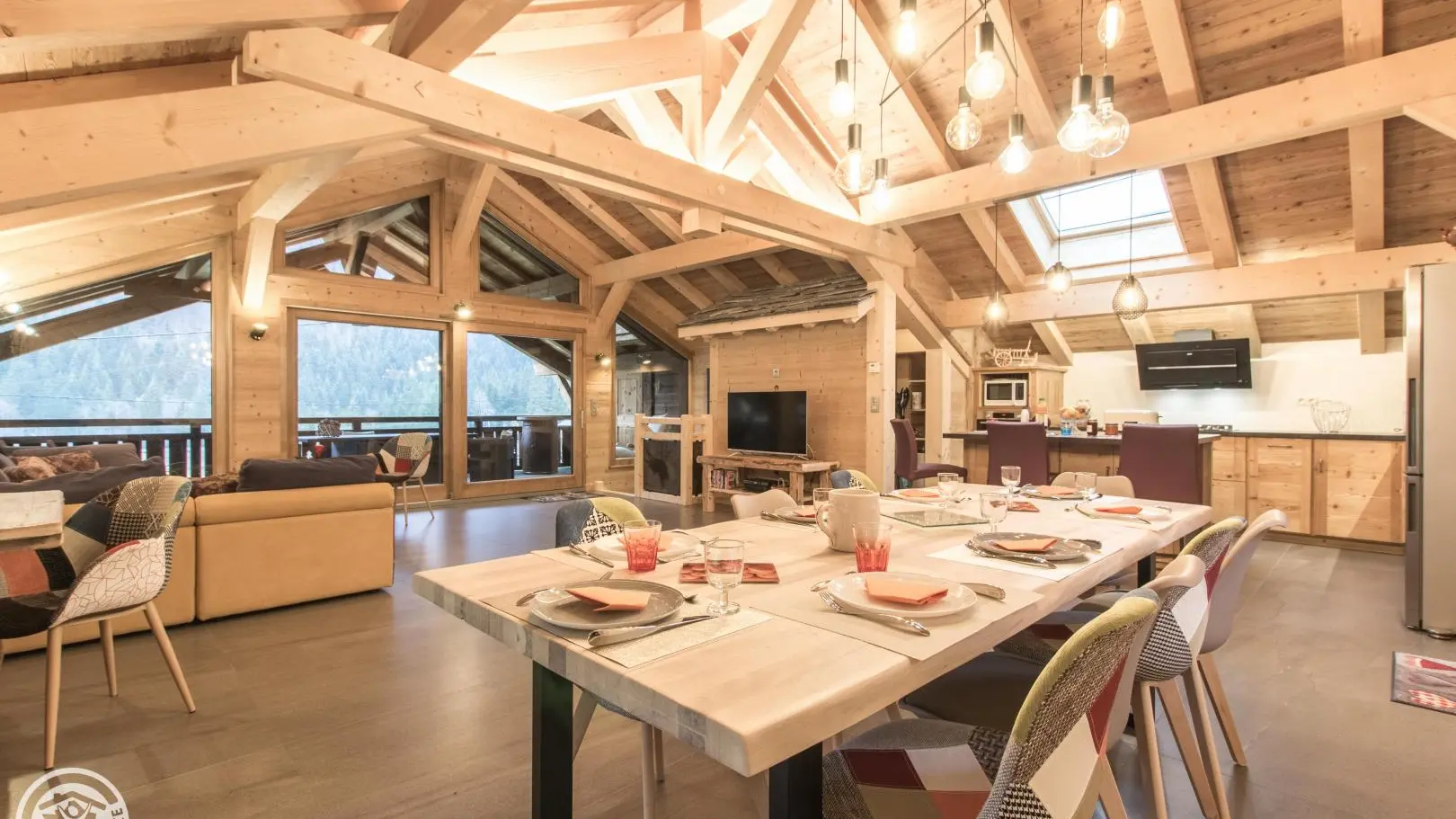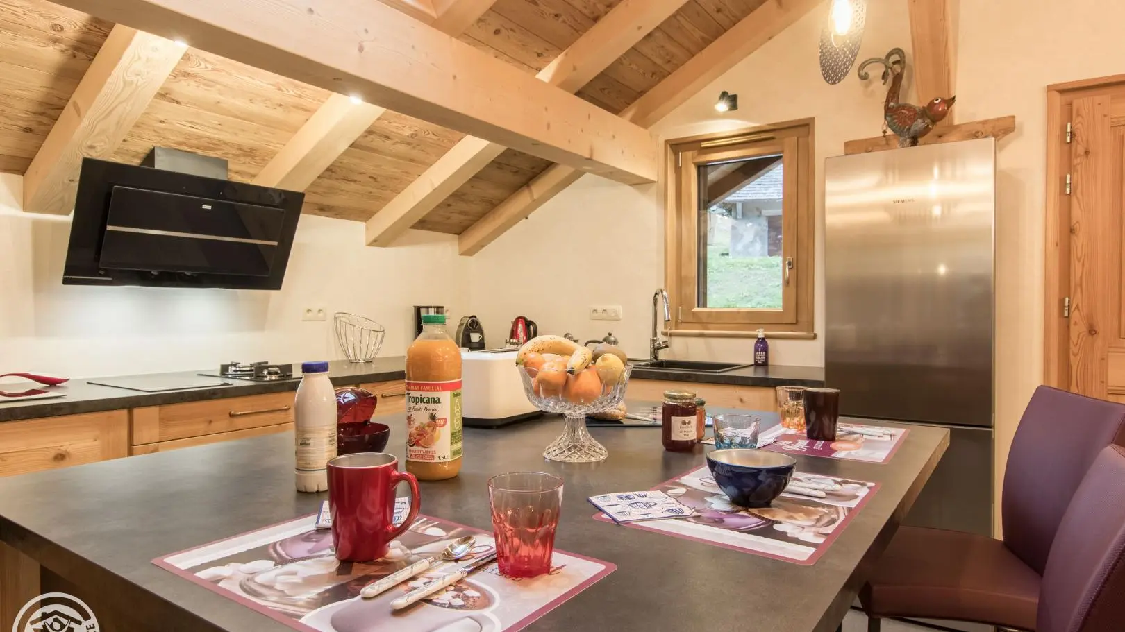 1 ° piano dello chalet: bella cucina attrezzata aperta sul soggiorno e sulla sala da pranzo, grande bovindo che dà accesso al terrazzo balcone coperto. 1 WC indipendente.