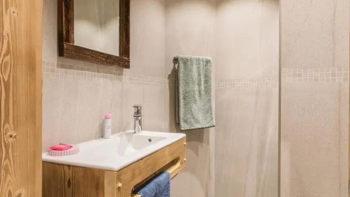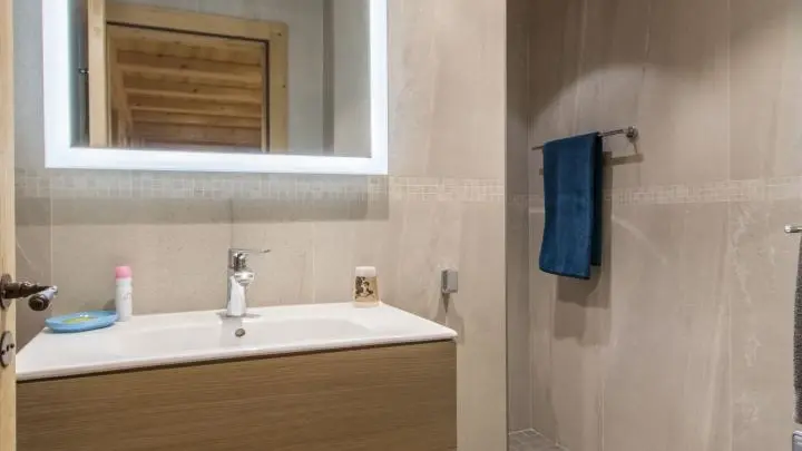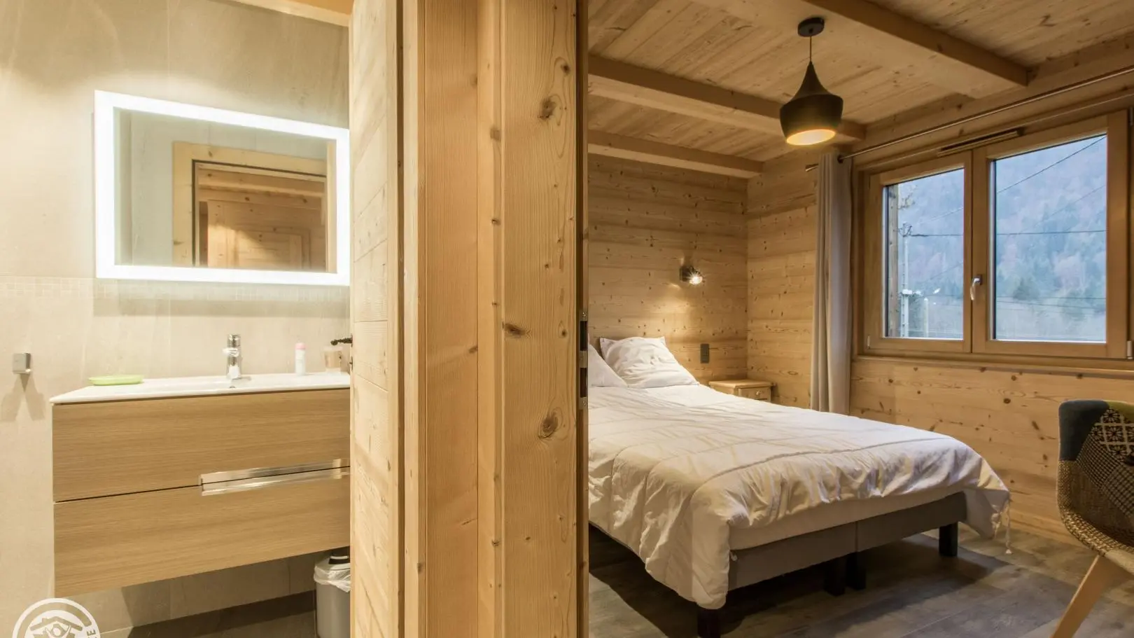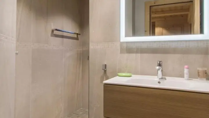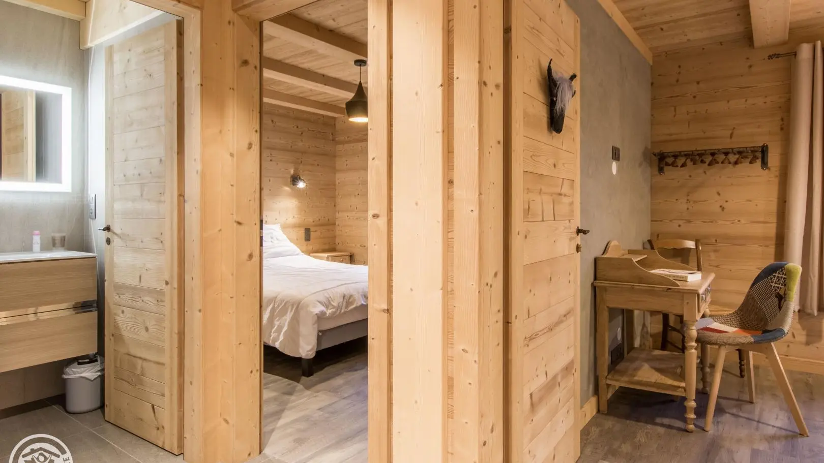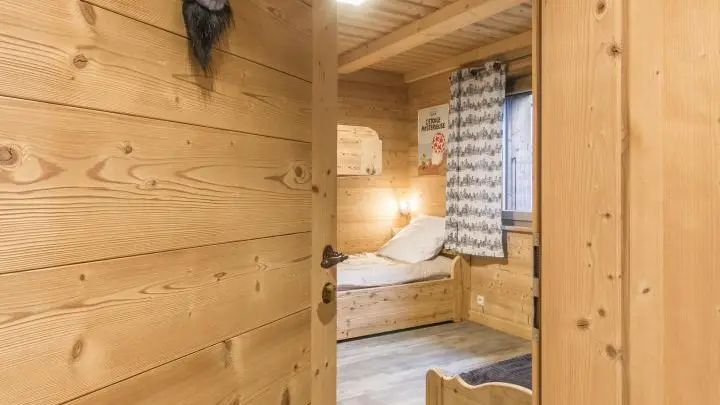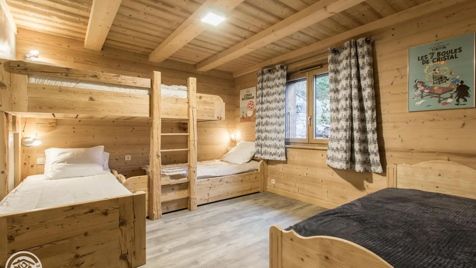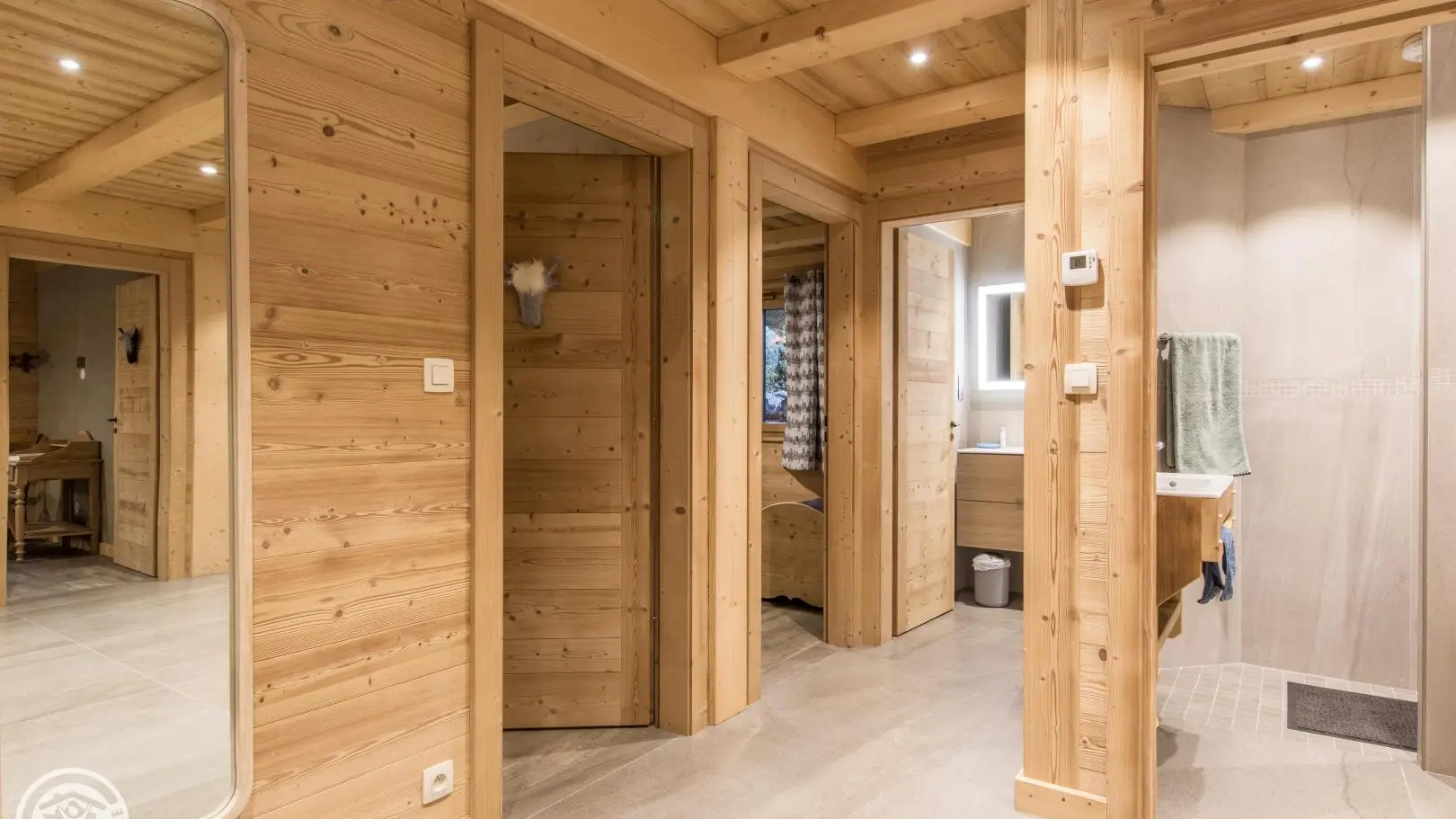 Piano terra dello chalet: camera 1 (1 letto 160x200cm), camera 2 (4 letti 90x190cm di cui 1 alto), ambra 3 (1 letto 160x200cm), camere da letto 4 (1 letto 160x200cm). 3 bagni con doccia (di cui 1 con wc) dotati di cabina doccia. 1 WC indipendente.