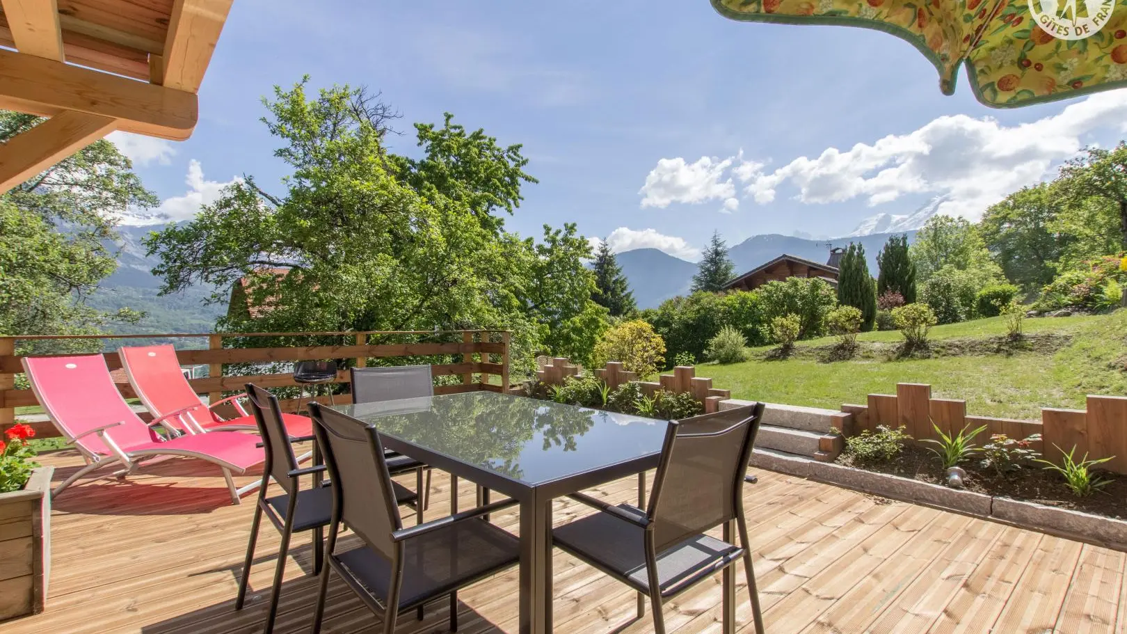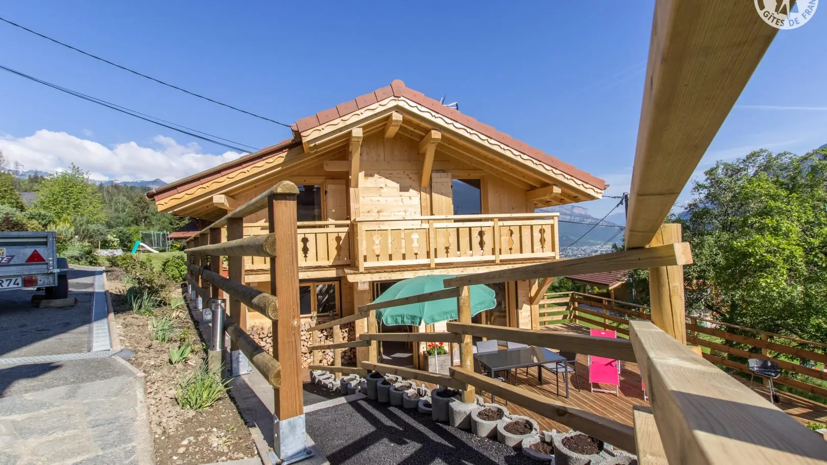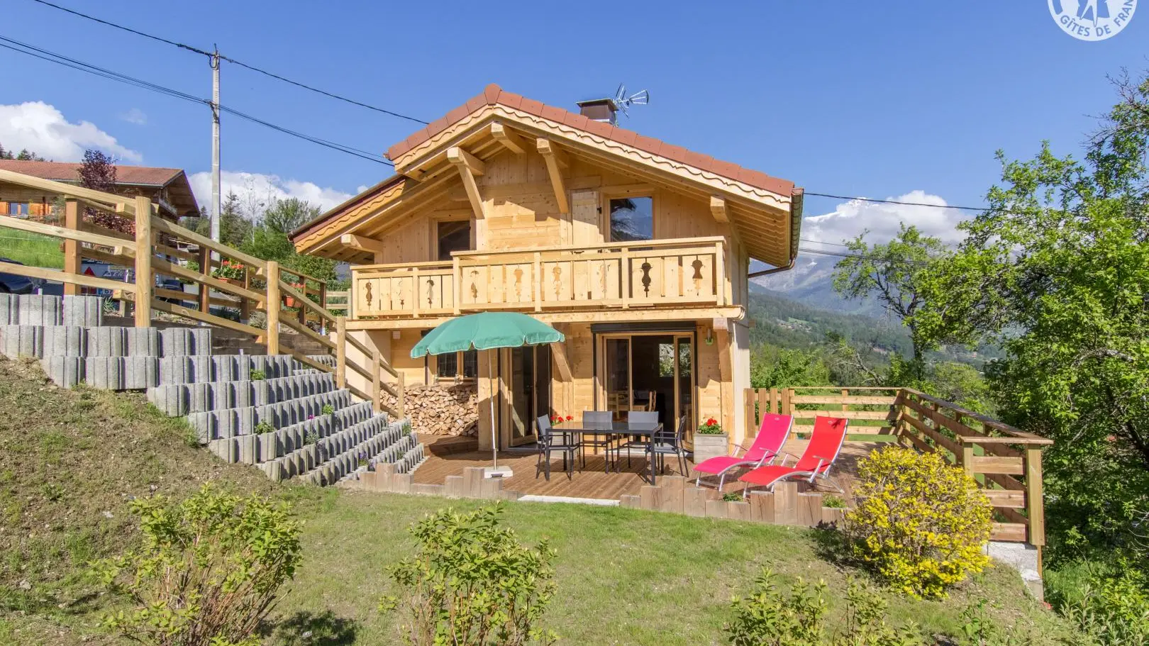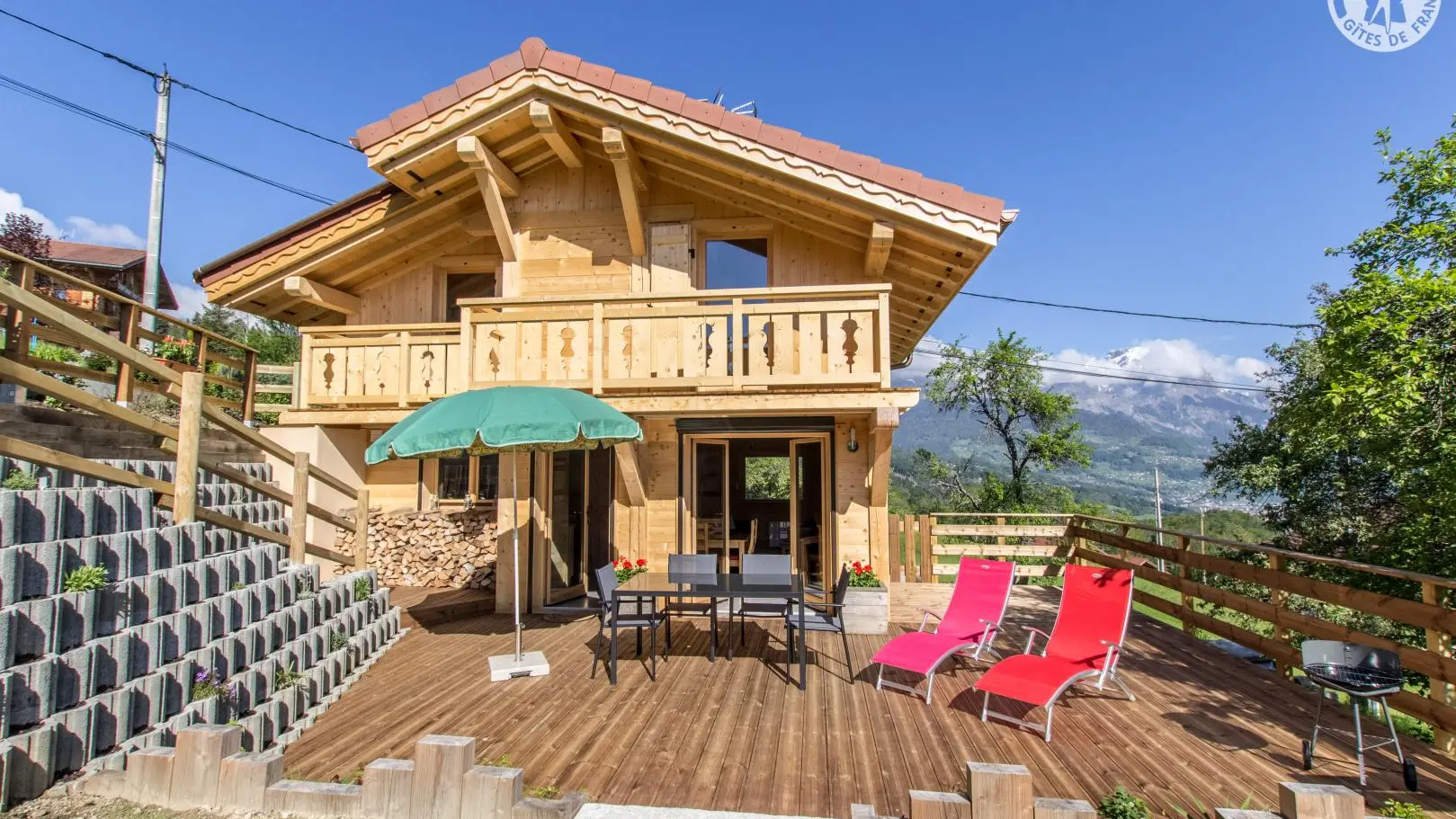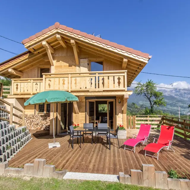 Piacevole terrazza in legno con mobili da giardino, ombrellone, sedie a sdraio e barbecue. Parcheggio in comune Accesso allo chalet dal parg tramite una sicura rampa di discesa.