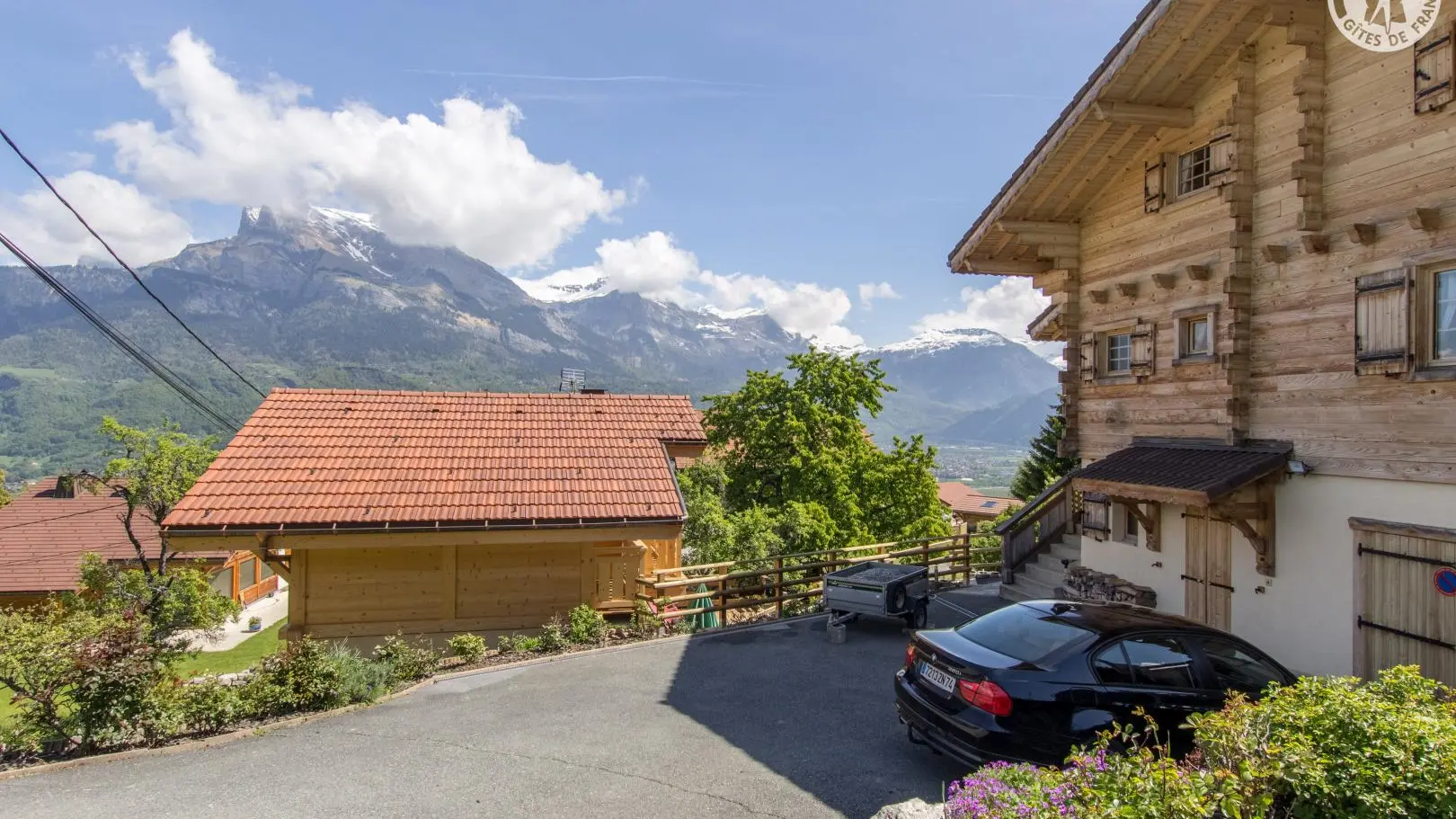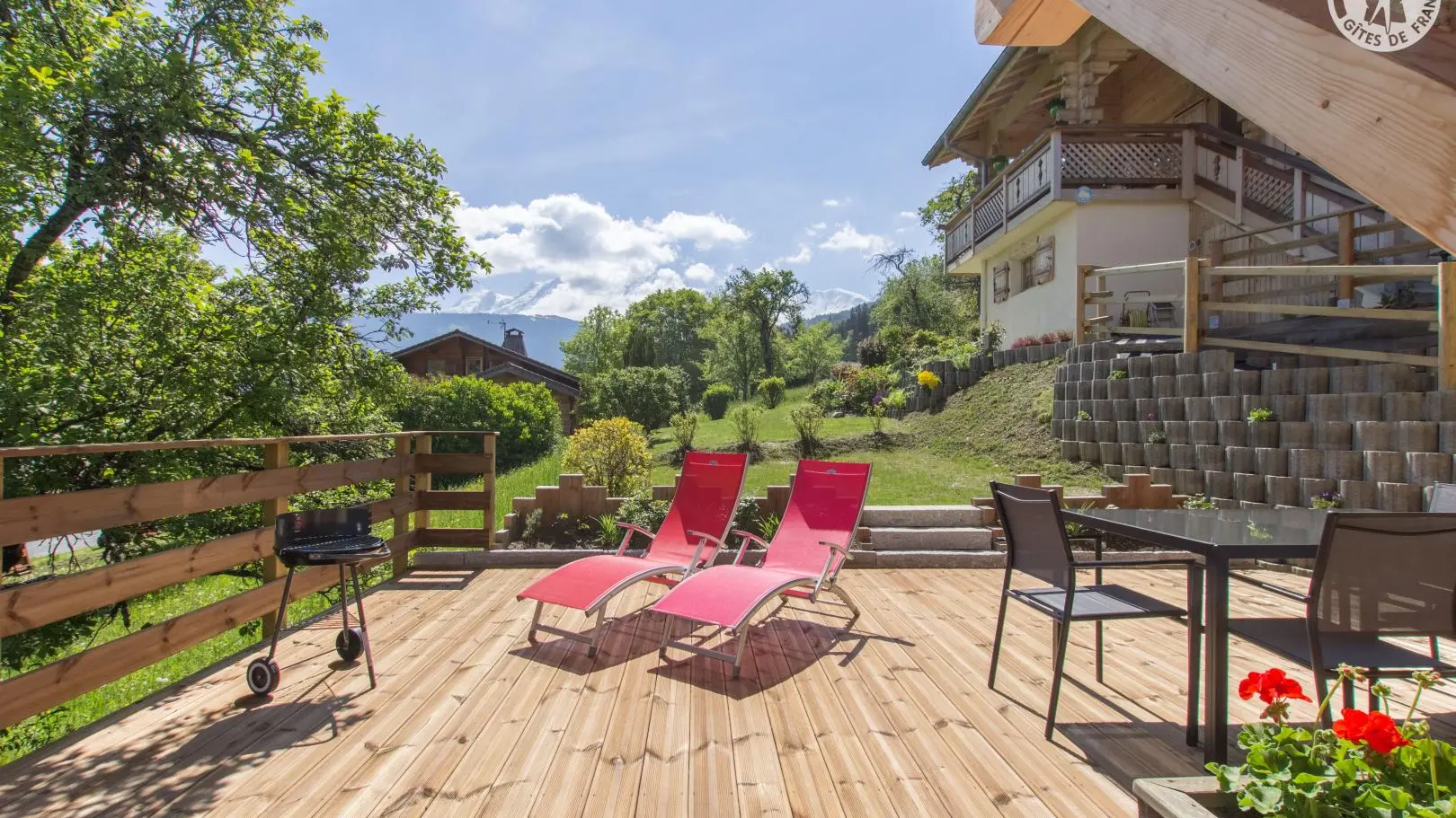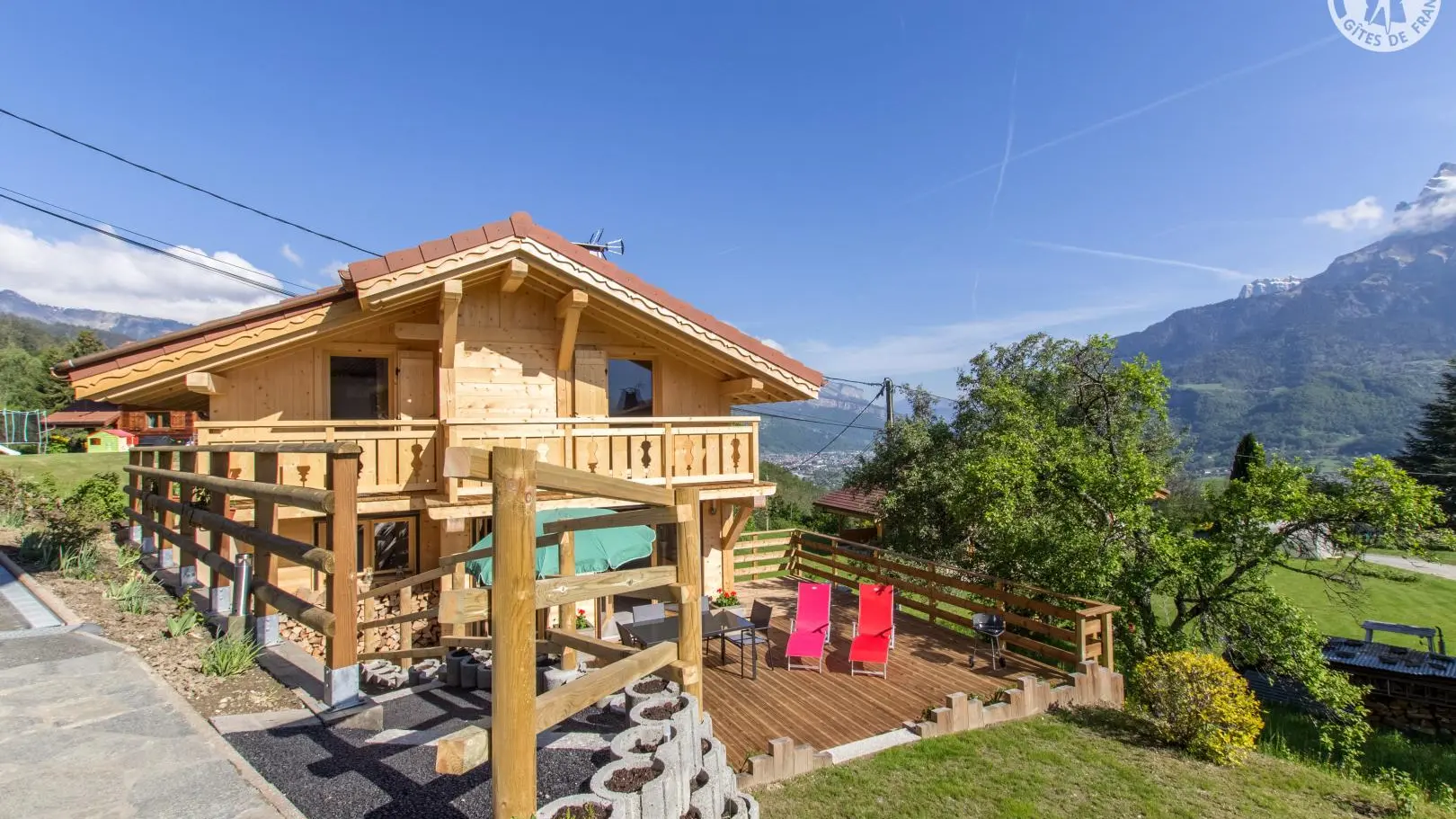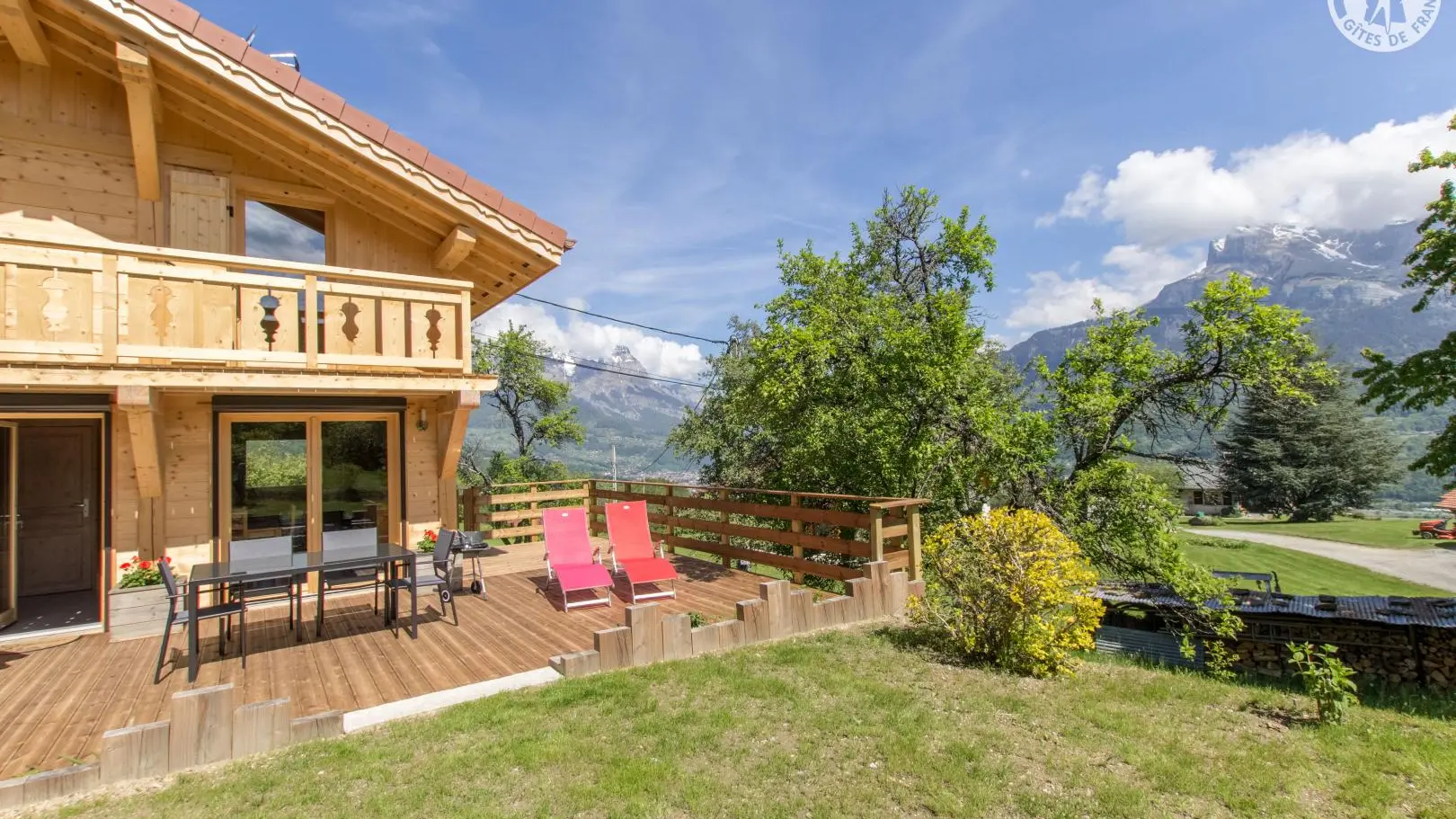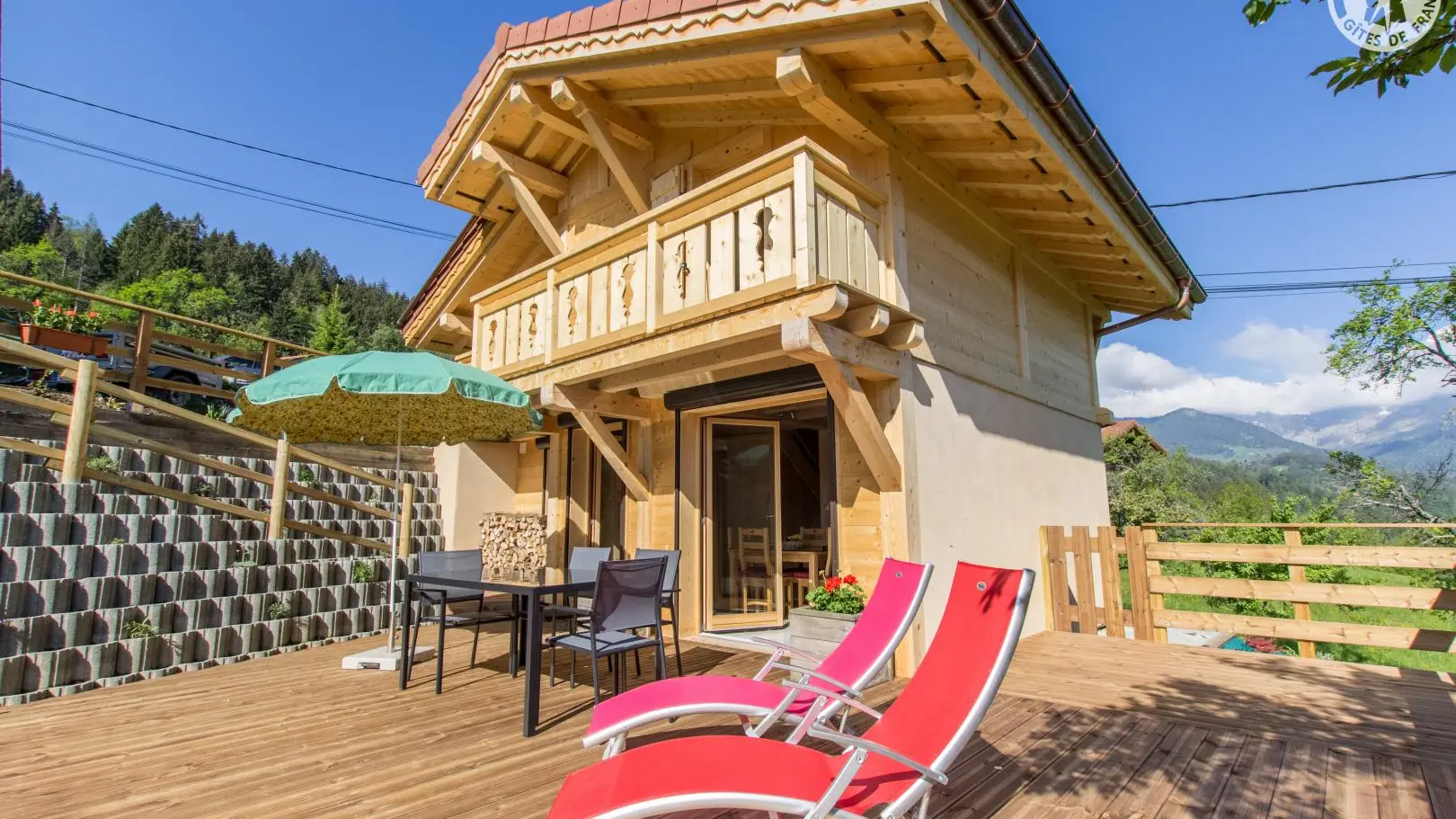 Piacevole terrazza in legno con mobili da giardino, ombrellone, sedie a sdraio e barbecue. Parcheggio in comune Accesso allo chalet dal parg tramite una sicura rampa di discesa.