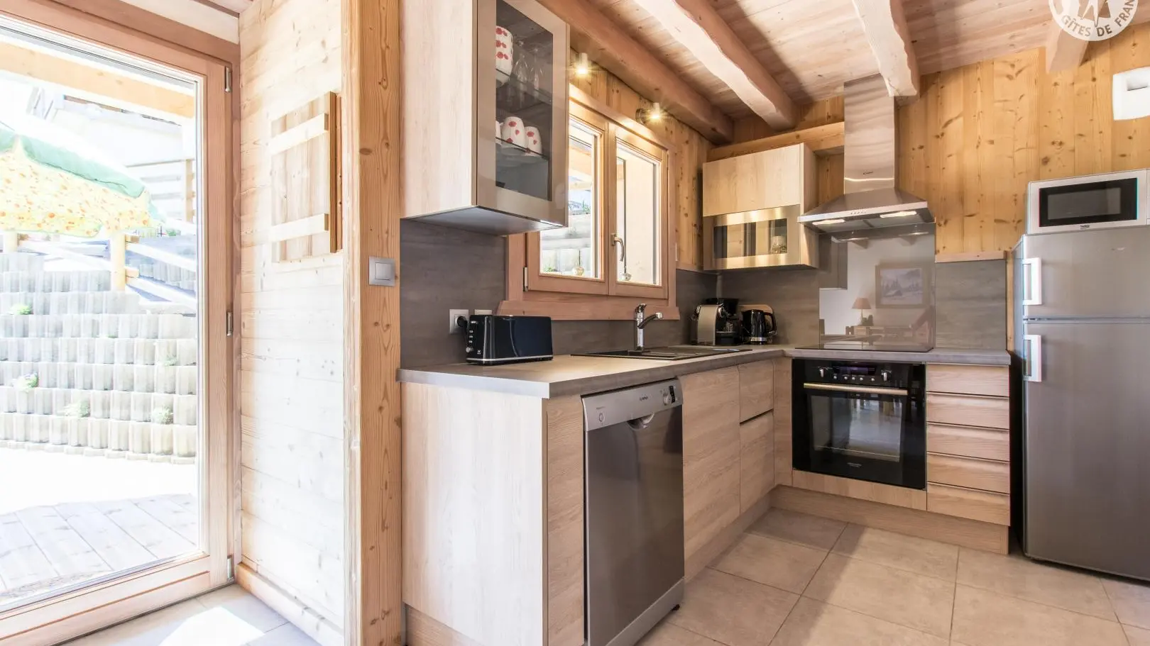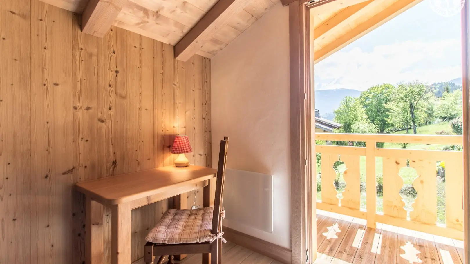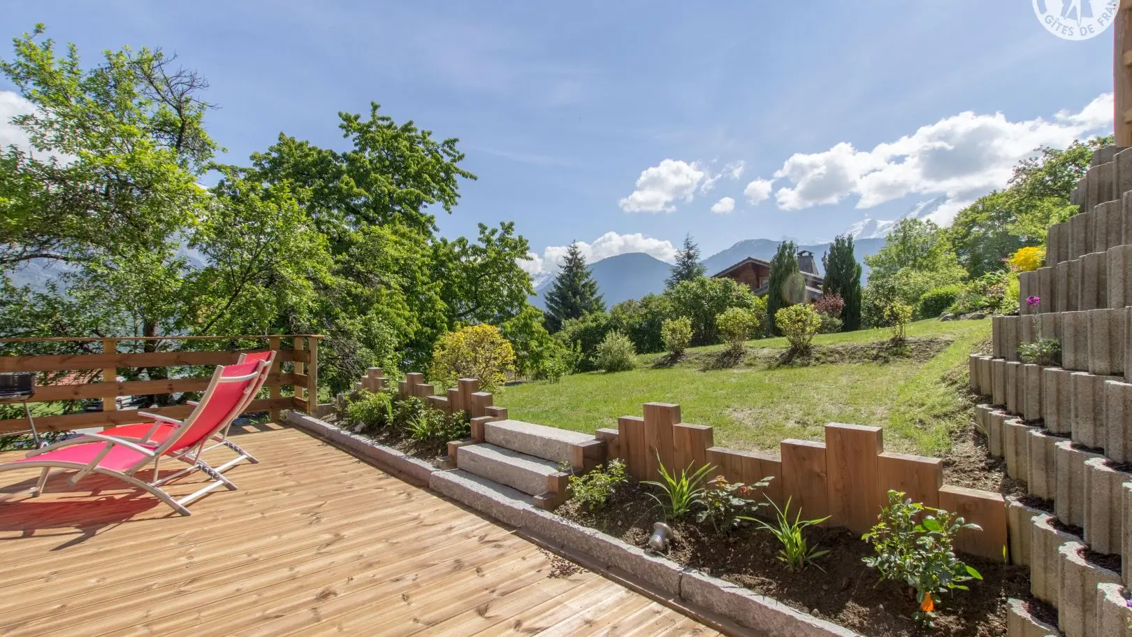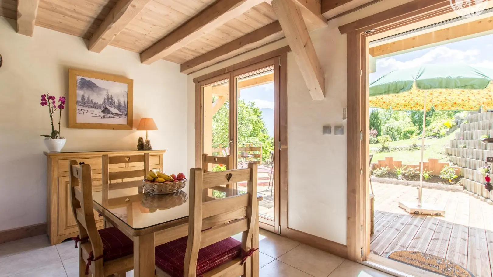 Piacevole terrazza in legno con mobili da giardino, ombrellone, sedie a sdraio e barbecue. Parcheggio in comune Accesso allo chalet dal parg tramite una sicura rampa di discesa.