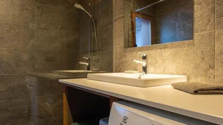 Al piano superiore: camera 2 (1 letto 140x190 cm), camera 3 (2 letti 90x190 cm), camera 4 (1 letto 140x190 cm), camera 5 (2 letti 90x200 cm abbinabili). Piccolo soppalco con mansarda (accesso tramite scala, 1 letto 80x190 cm). Bagno con doccia (cabina doccia). WC separato. Lavatrice.