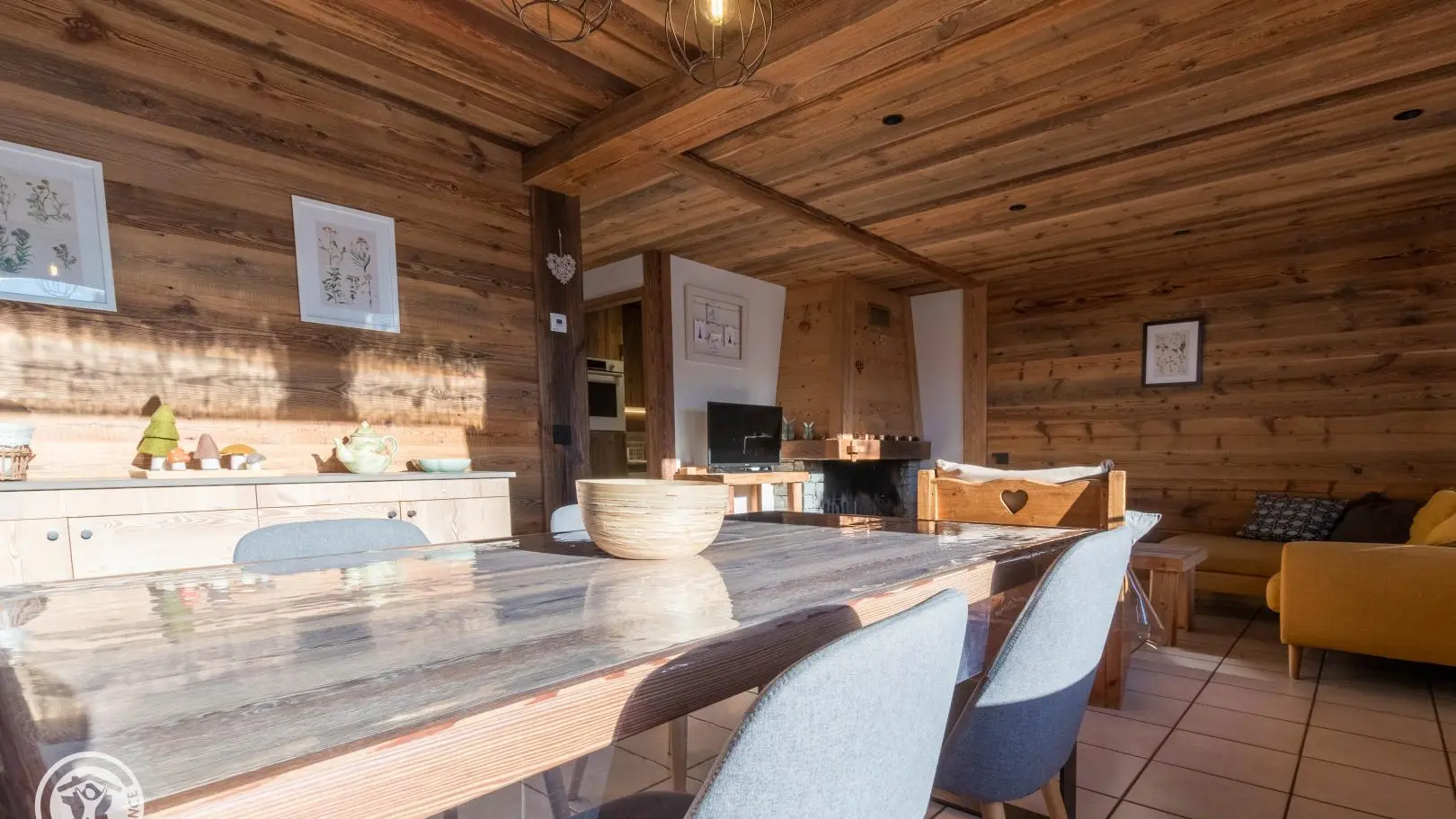 Cucina attrezzata, soggiorno - sala da pranzo con camino (legna non fornita), televisione, divano letto tipo BZ, tavolo da pranzo. Accesso alla terrazza e al giardino.