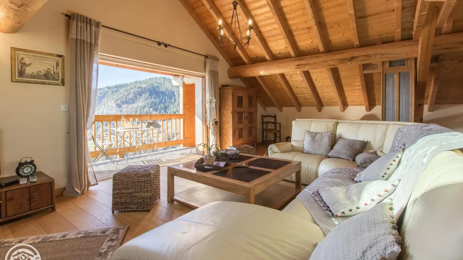Terrazza nella parte inferiore dello chalet / giardino di terra: mobili da giardino, sedie a sdraio, barbecue. Balcone. Splendido panorama sulle montagne. Giardino + terreno in pendenza sul davanti della casa. 2 posti auto vicino alla casa + parcheggio privato a 50m dalla casa.