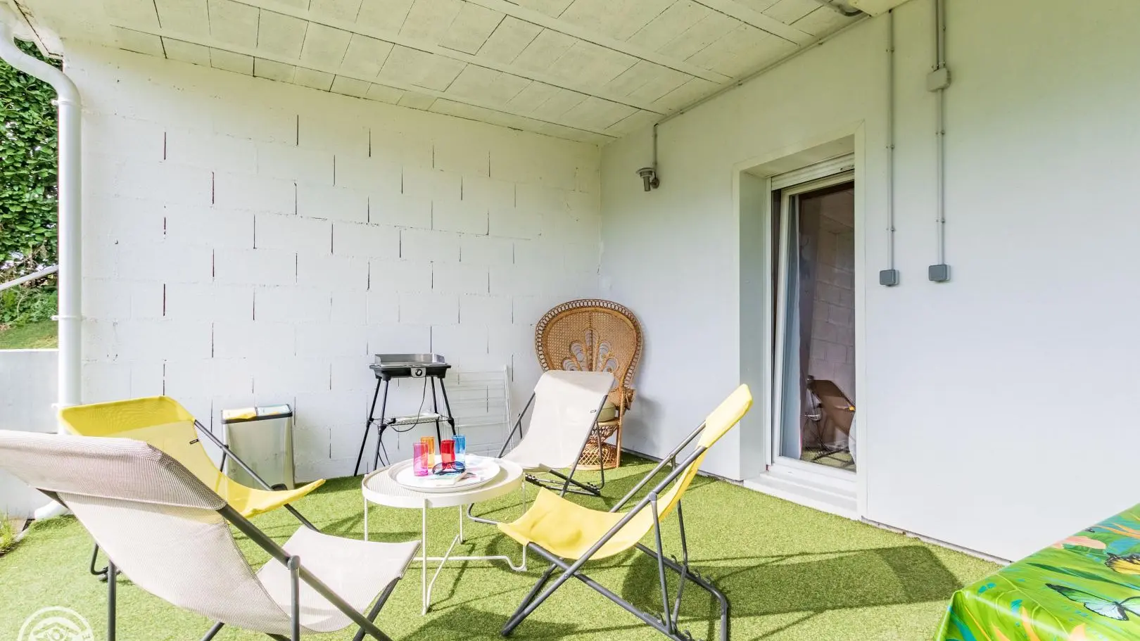 Terrazzo arredato e coperto di 30 mq, con giardino privato e relative attrezzature (mobili da giardino, sdraio, ecc.) accessibile dal soggiorno e dalla camera da letto. Non trascurato. Lenzuola, lenzuola e asciugamani sono forniti. Lavatrice comune con il proprietario in un ripostiglio accessibile direttamente dall'esterno. Arrivi possibili tra le 16:00 e le 20:00