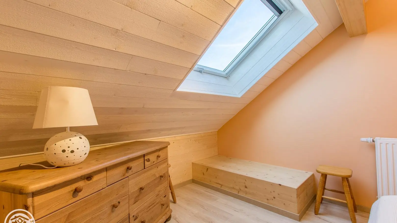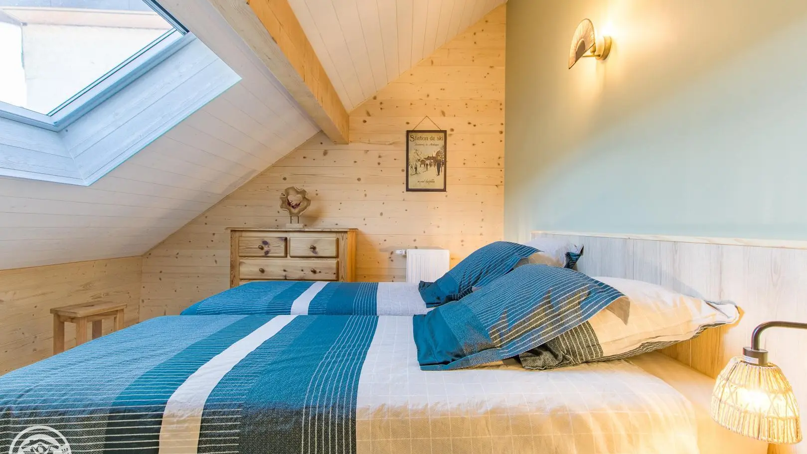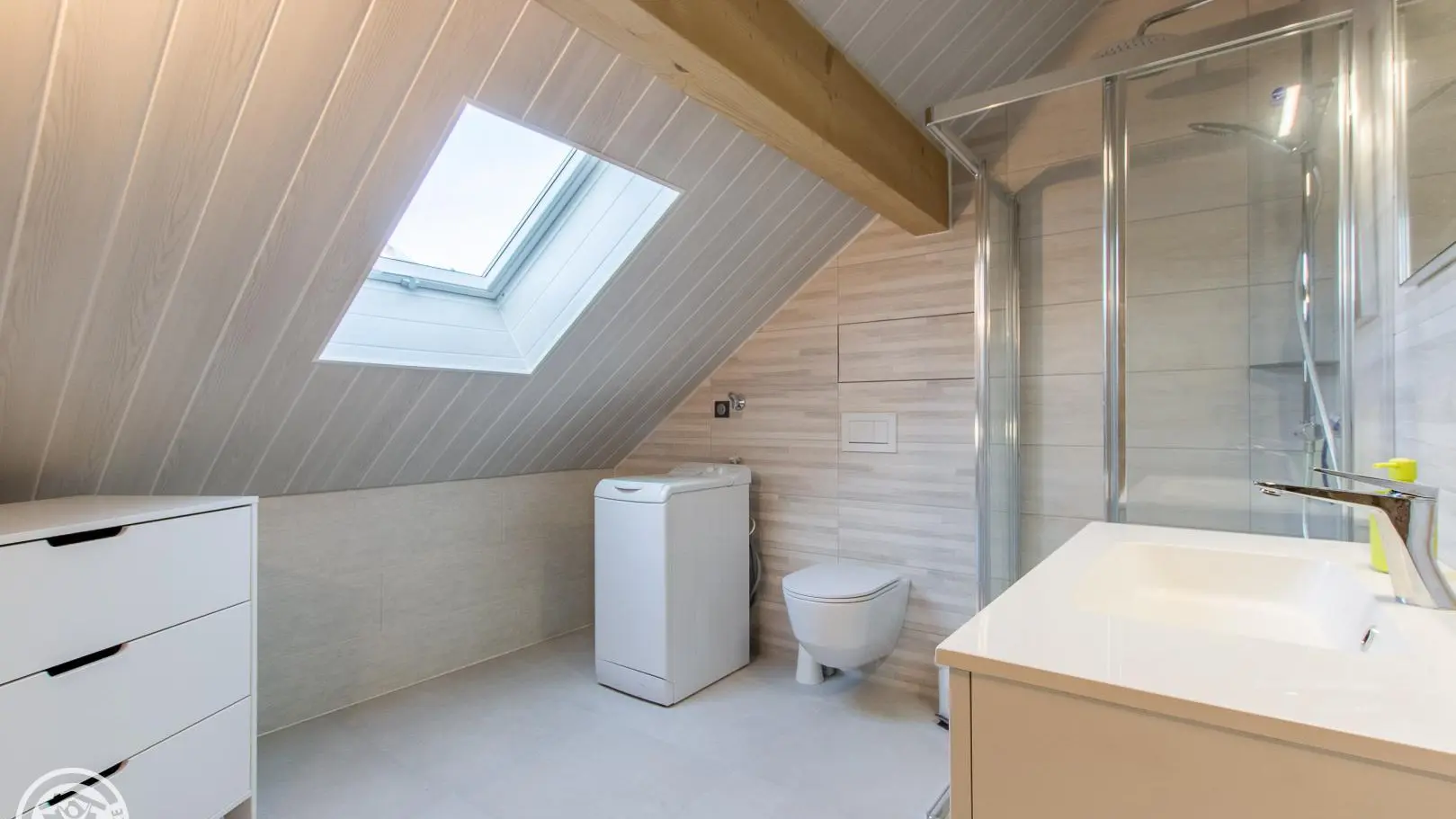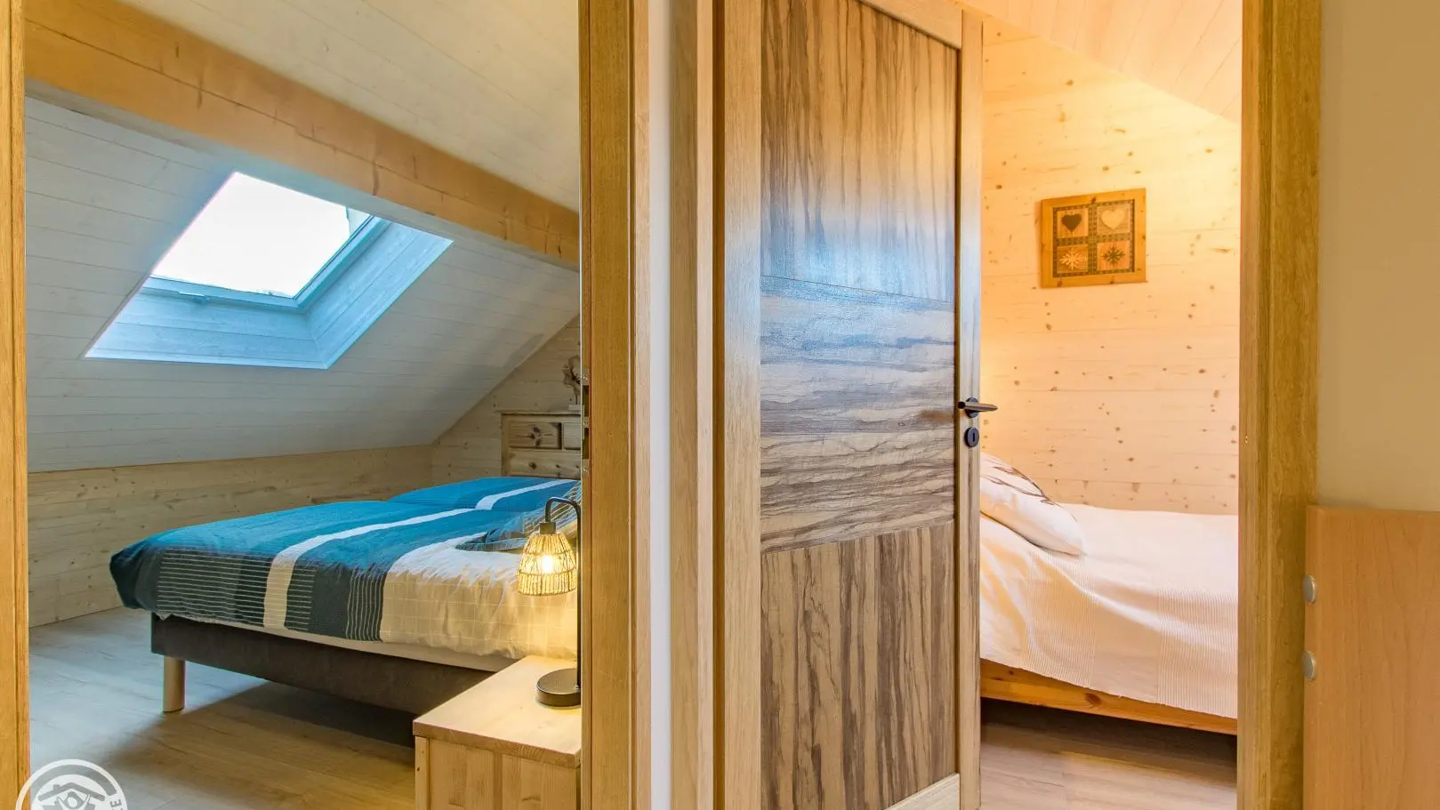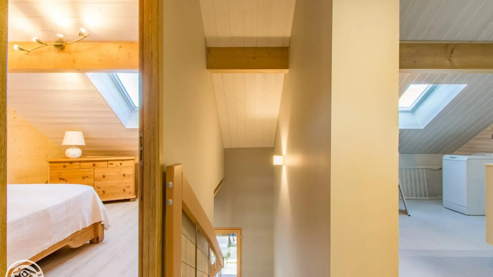 Al piano superiore: camera 1 (1 letto 140x190 cm), camera 2 (2 letti gemelli 80x200 cm che possono creare 1 letto 160x200 cm), bagno con doccia, mobile lavabo, lavatrice e WC.