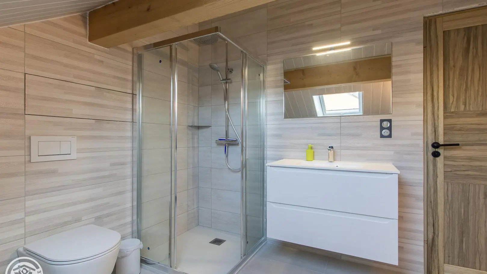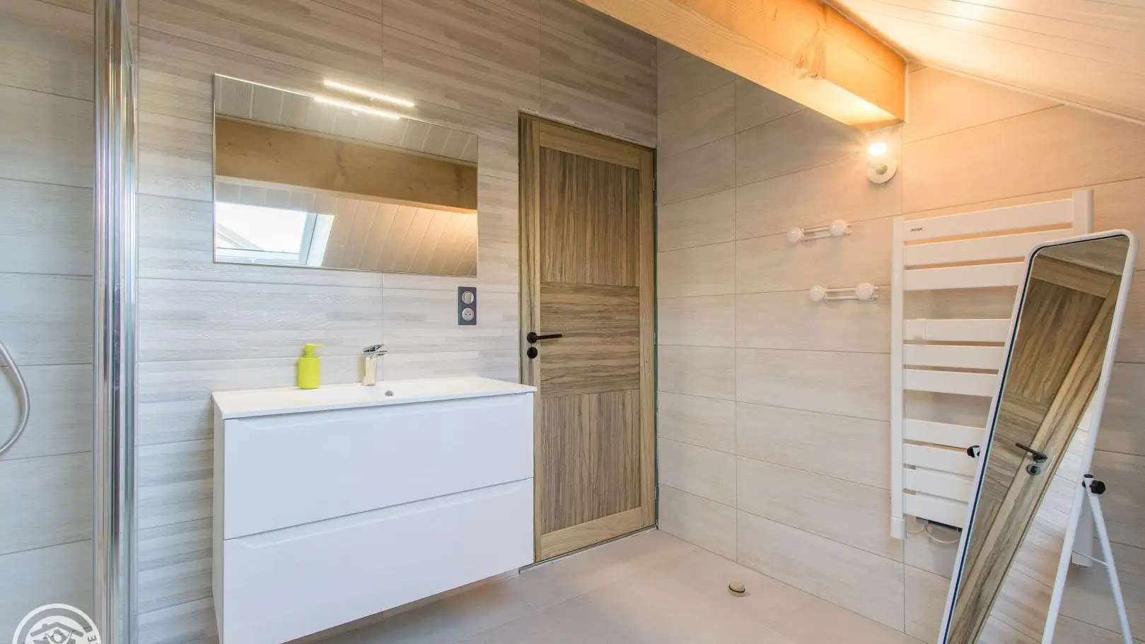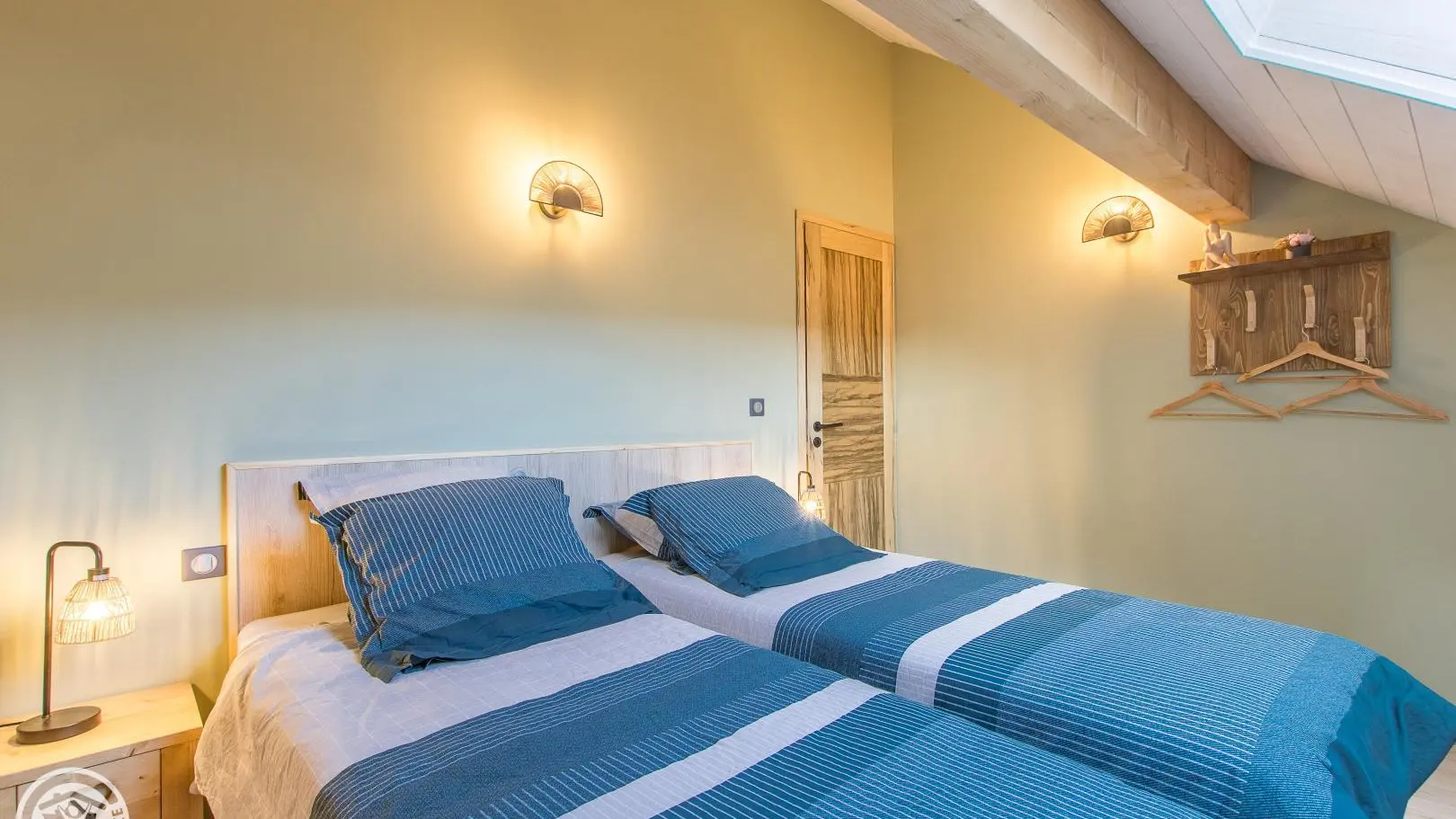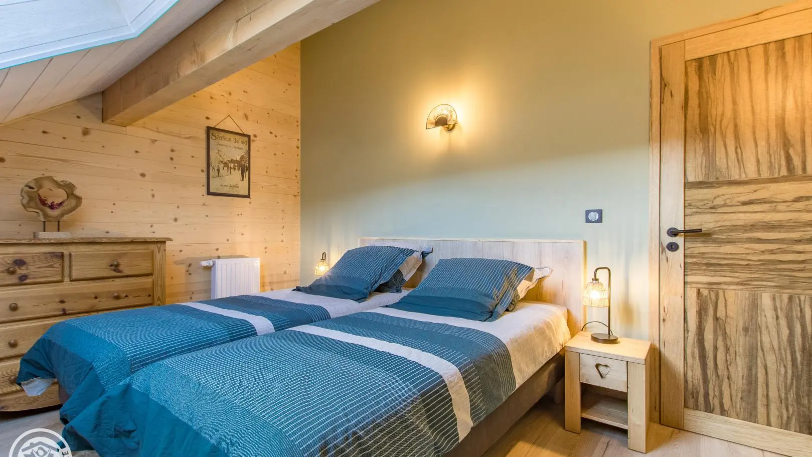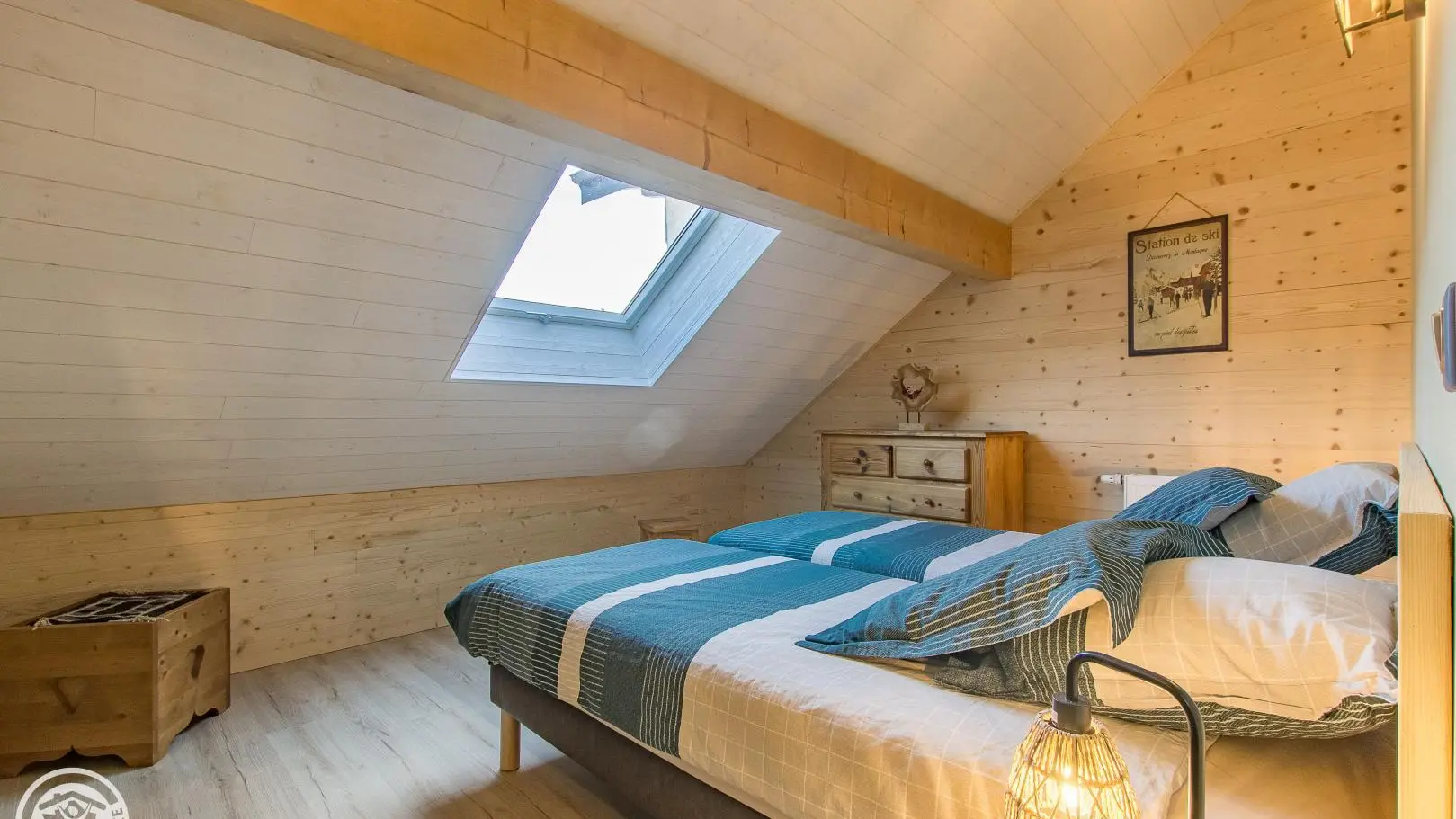 Al piano superiore: camera 1 (1 letto 140x190 cm), camera 2 (2 letti gemelli 80x200 cm che possono creare 1 letto 160x200 cm), bagno con doccia, mobile lavabo, lavatrice e WC.