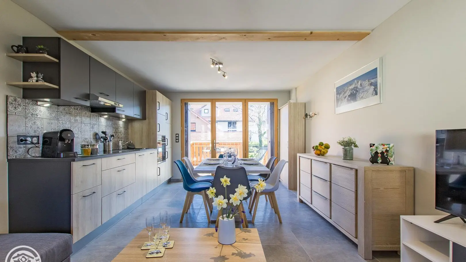Cucina attrezzata aperta sul soggiorno (tavolo da pranzo, divano, televisione), accesso al balcone-terrazzo.