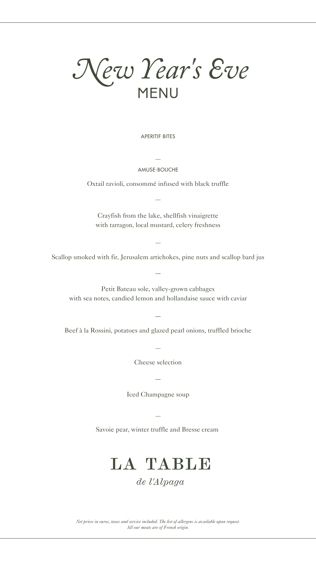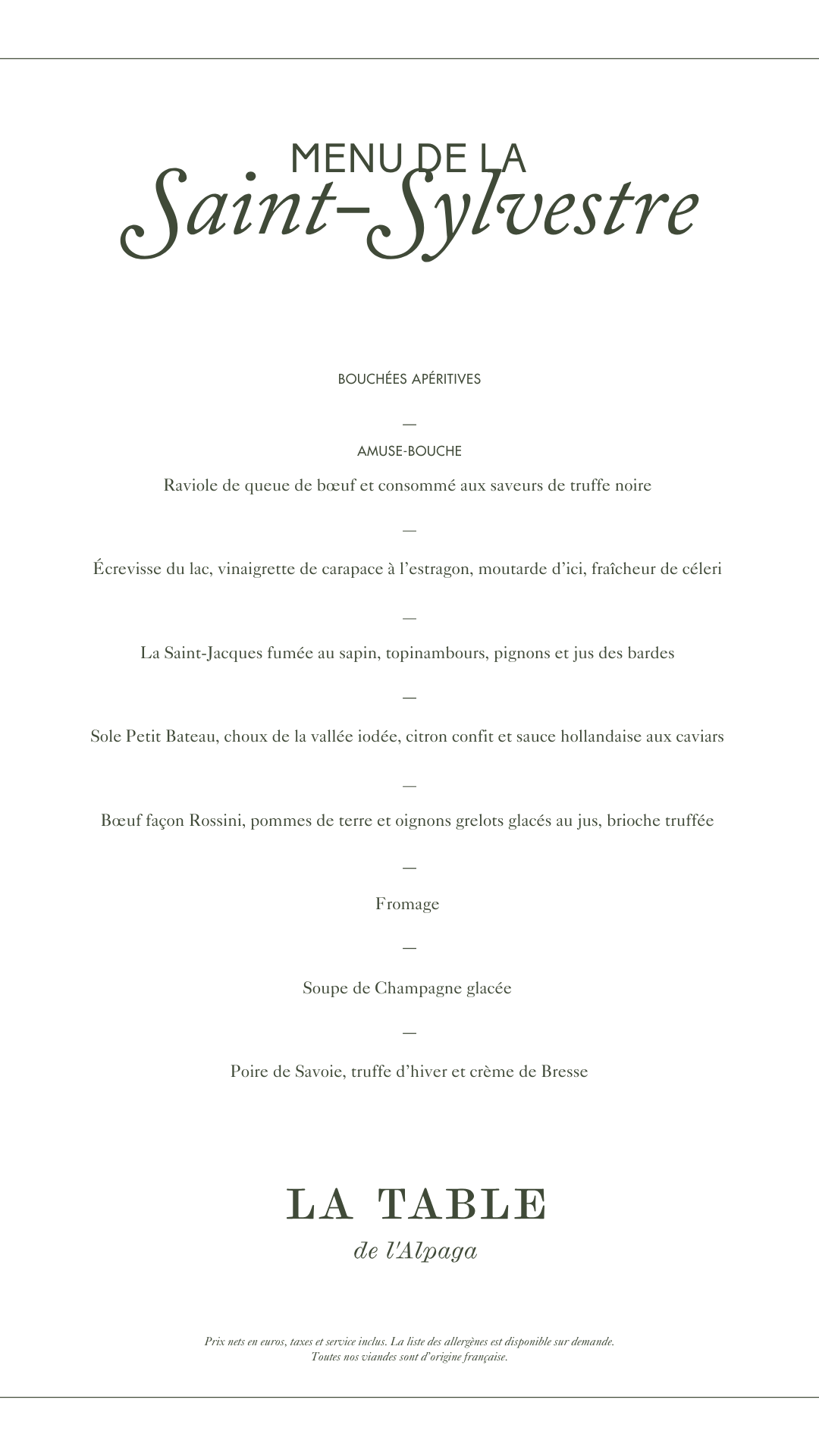 Alla Table de L'Alpaga, ogni piatto rende omaggio alla natura circostante. Verdure invernali accuratamente selezionate, erbe aromatiche, radici e tuberi di stagione riflettono l'abbondanza che ispira lo chef. Qui, le verdure occupano il posto d'onore, mentre il pesce e la carne hanno un ruolo secondario. L'ordine culinario tradizionale viene rivisitato per mettere in risalto l'essenza della regione, espressa con precisione e creatività in ogni boccone. Creazioni che celebrano con rispetto e ingegnosità le ricchezze del territorio.