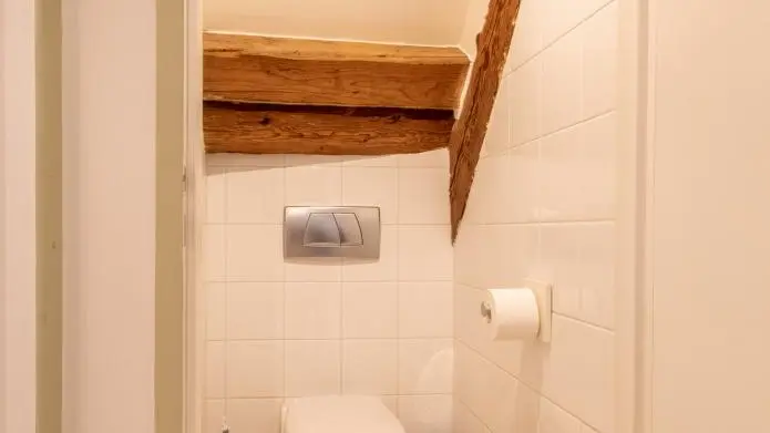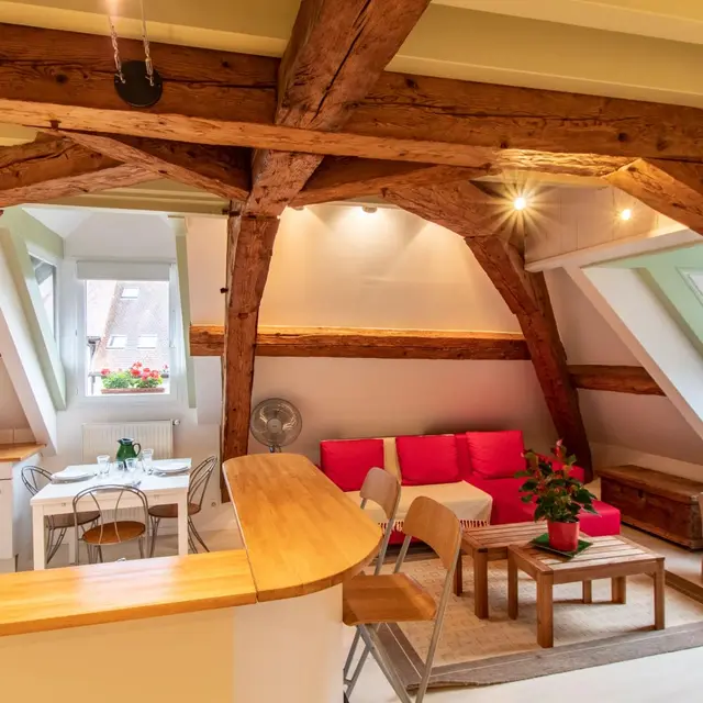 Gîte completamente mansardato di 50 m² al 2° piano di una casa con un secondo gîte sullo stesso livello e l'alloggio dei proprietari nel resto dell'edificio. Vecchie travi visibili nel soggiorno e nell'alloggio. Ingresso indipendente, accesso tramite scala esterna ed interna, comune ad entrambi gli alloggi.