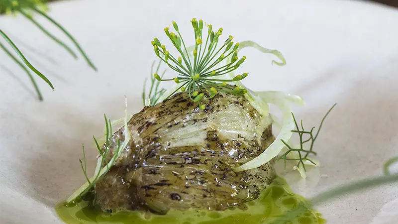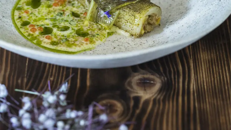 Lo Chef scrive una magica partitura lacustre e vegetale, rivelando il potenziale culinario dei laghi di Annecy, Le Bourget e del lago di Ginevra. Salmerino alpino, féra, gambero, luccio... assumono qui una dimensione insospettabile, divisa tra raffinatezza e profondità di sapori e consistenze.