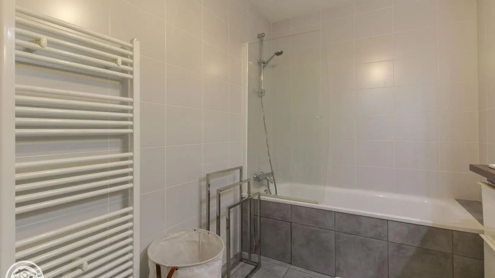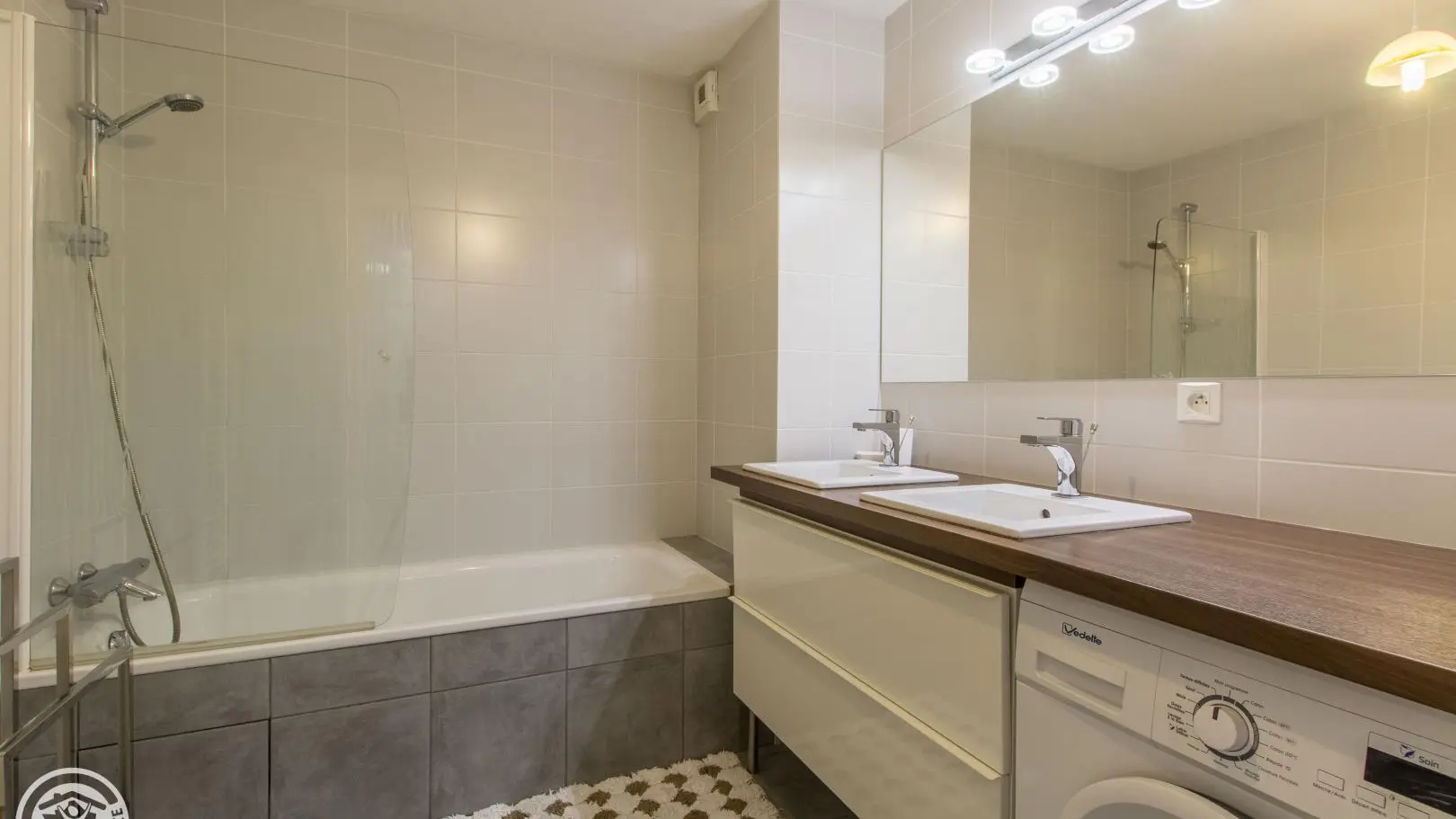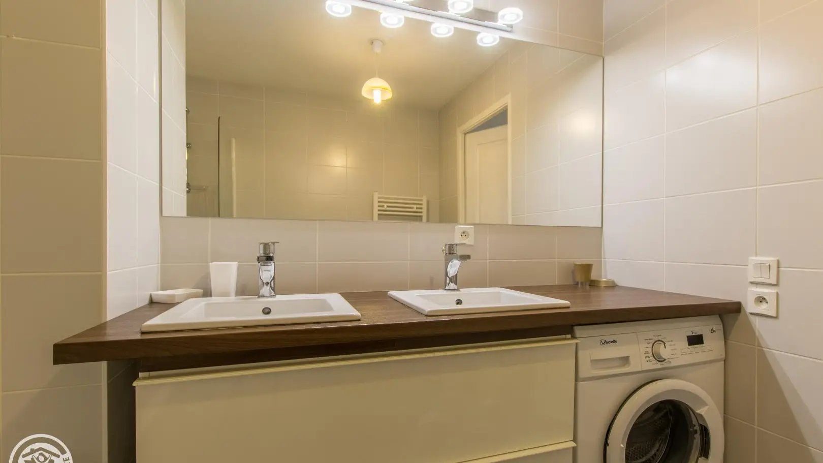 Bagno con vasca, 2 lavandini, scalda asciugamani, lavatrice. 1 WC separato.