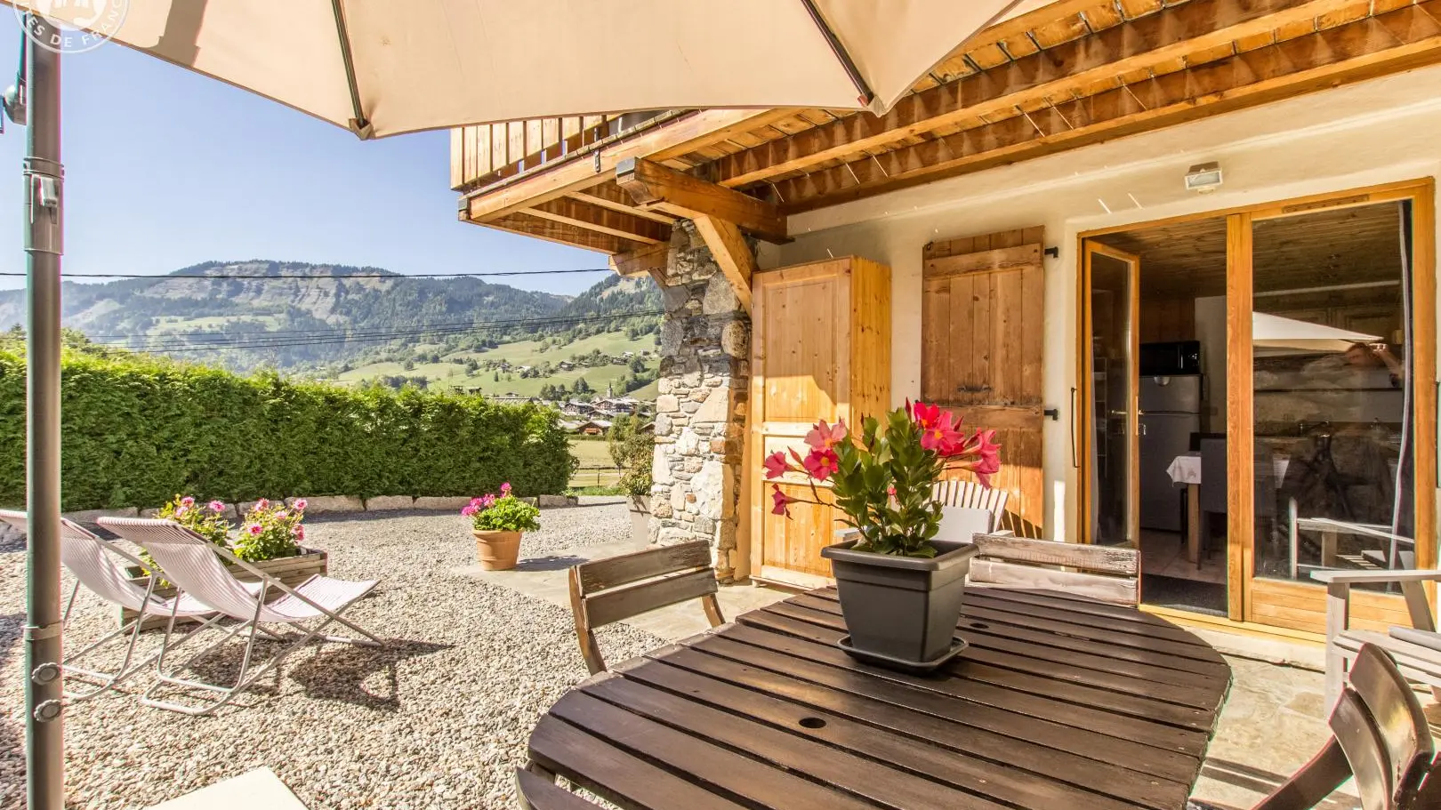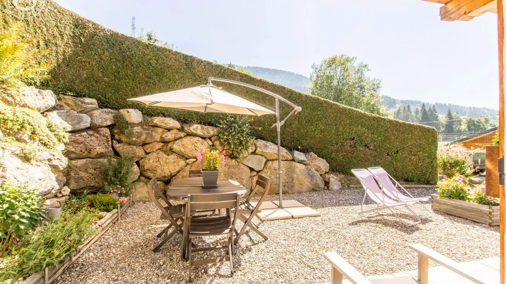 Terrazza privata con mobili da giardino, sdraio, ombrellone e barbecue. Parcheggio nel cortile davanti al gîte.