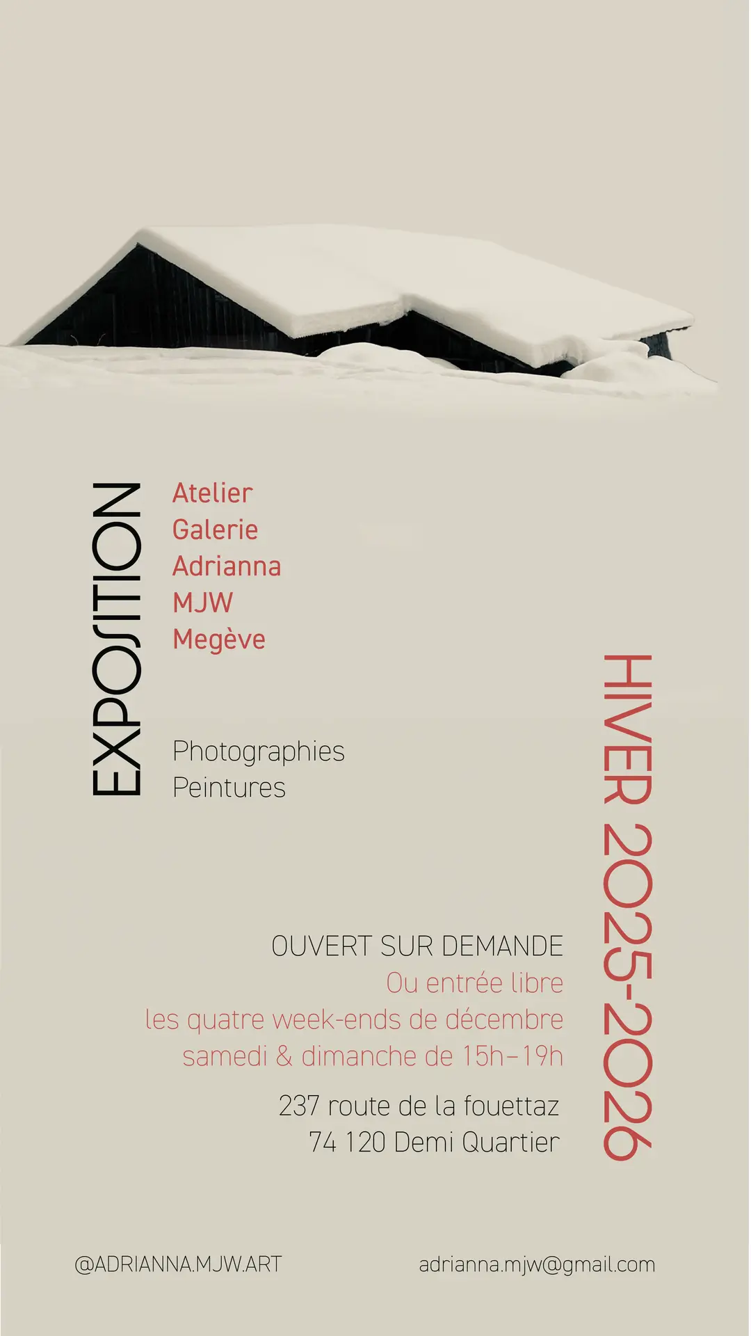 Scoprite il mondo artistico di Adrianna MJW, pittrice e fotografa di Megève. Situato nell'autentico borgo di Vauvray (Demi-Quartier), il suo studio-galleria è un luogo unico e stimolante, incastonato di fronte al Monte Bianco.