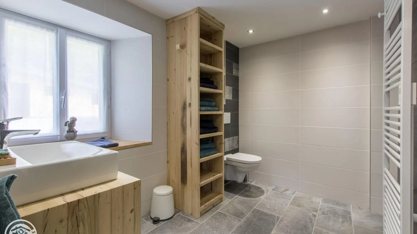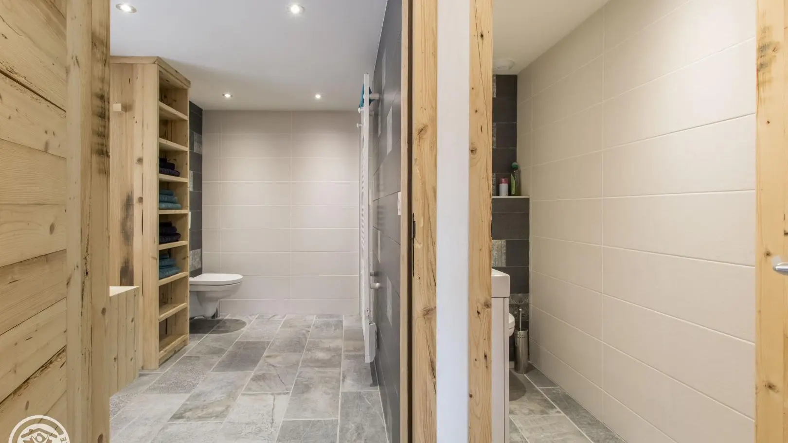 Ampio bagno con doccia, lavabo su armadio, wc. 1 WC separato.