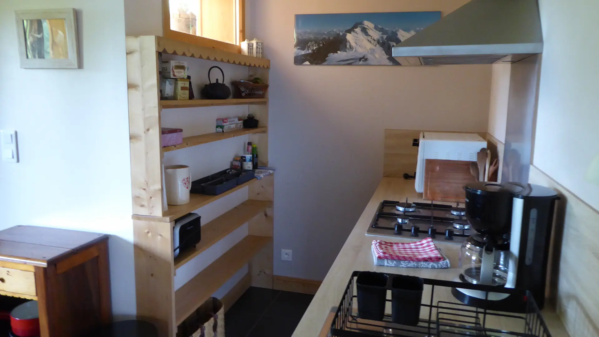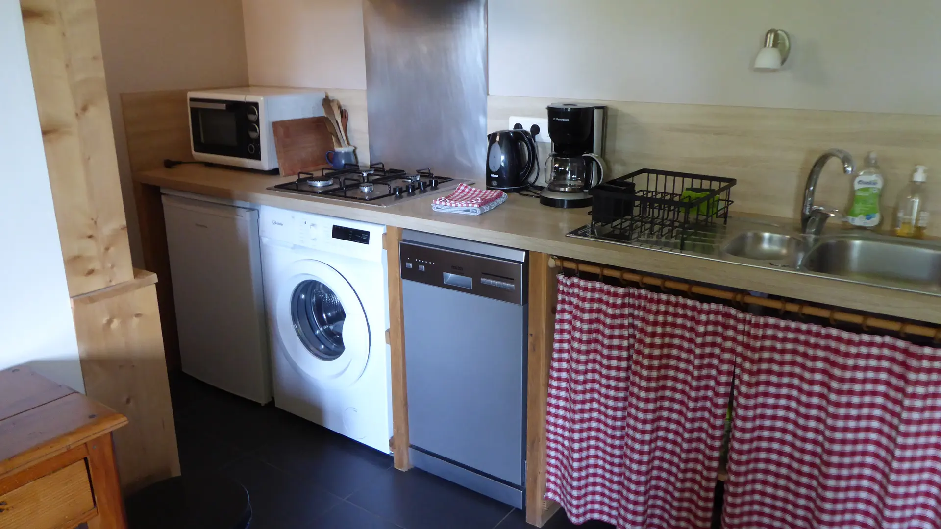 4 gaspitten, 1 mini-oven, vaatwasser, koelkast met vriesvak, wasmachine, waterkoker en koffiezetapparaat, raclette machine, fondue pan, mini-crêpe party, servies en bestek.