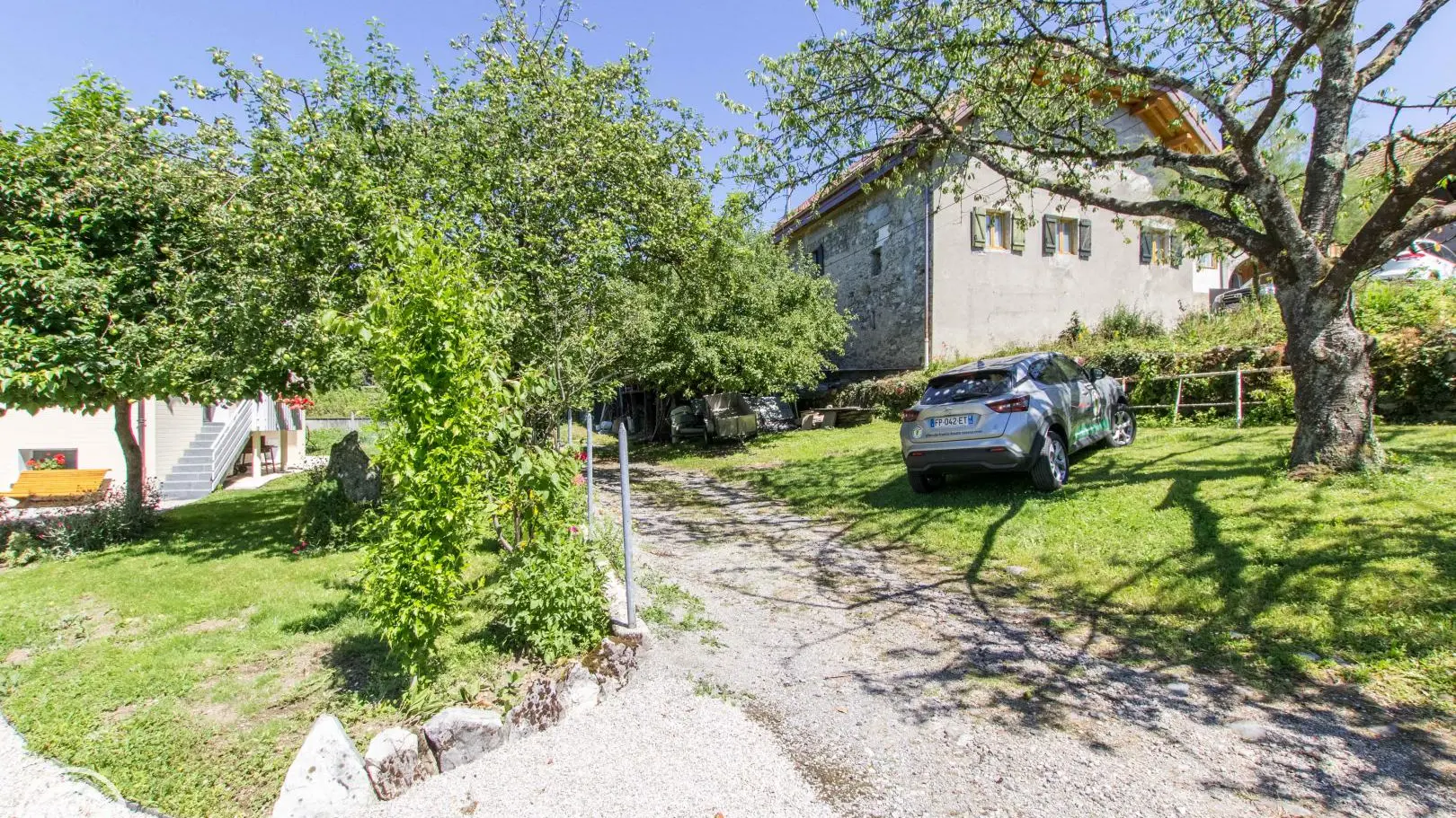 Tuin met uitzicht op het meer van Genève en Zwitserland, tuinmeubelen, parasol, relax, barbecue. Binnenplaats, eigen parkeerplaats op het terrein.