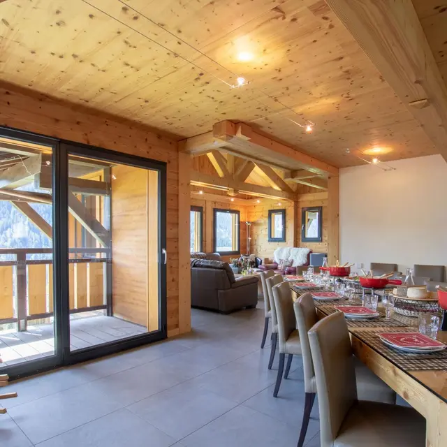 Vrijstaand chalet op het zuiden (230m² + 10m² zolderruimte) met hoogwaardige inrichting, verdeeld over 3 verdiepingen. Begane grond: inkomhal + winteringang met veel bergruimte, ruime woonkamer met keuken die uitgeeft op eetkamer en salon (pelletkachel) die uitgeeft op terras/balkon, aparte WC. Bovenverdieping: 3 slaapkamers; slaapkamer 1 (1 x 160cm bed + eigen doucheruimte), slaapkamer 2 (2 x 90cm lits-jumeaux), slaapkamer 3 (2 x 90cm lits-jumeaux), doucheruimte, aparte WC. Tuinniveau: 2 slaapkamers: slaapkamer 4 (1 x 160cm bed + 2 x 90cm stapelbedden, badkamer met douche en bad), slaapkamer 5 (3 x 90cm bedden, waarvan 2 aparte bedden, kleedkamer, badkamer met douche), aparte WC. Bedden van 200 cm. Wellnessruimte (sauna, douche, fiets), terras met jacuzzi. Wasruimte, ski faciliteiten (droger voor schoenen, ski rek). Tuinmeubels en barbecue. Carport en oplaadpunt voor elektrische auto's.
