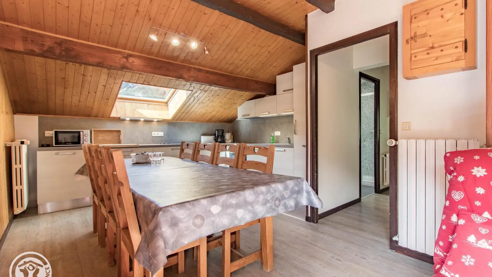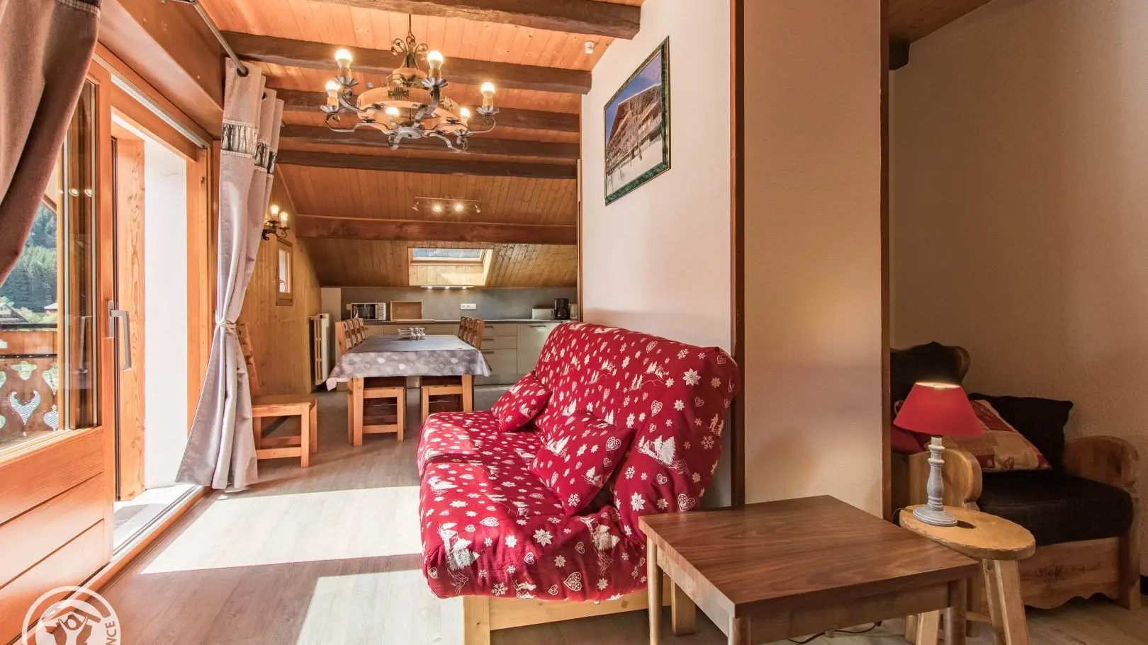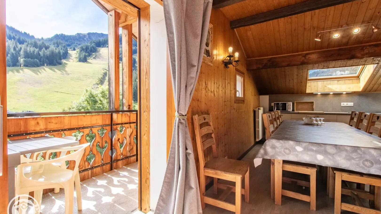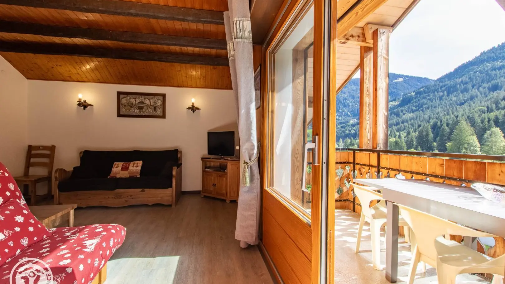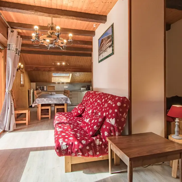 Ingerichte keuken met eethoek, uitgevend op de woonkamer (2 zitbanken waarvan 1 rapido, televisie 80cm), toegang tot het balkon op het zuiden (zicht op de pistes in de winter). 4 slaapkamers, waarvan 2 communicerend: slaapkamer 1 (1 bed van 160x200cm), slaapkamer 2 (zolder) communicerend / toegang via slaapkamer 1 (2 bedden van 90x190cm die dichter bij elkaar geschoven kunnen worden), slaapkamer 3 (3 bedden van 90x190cm), slaapkamer 4 (zolder) (1 bed van 140x190cm). 1 badkamer (met bad, douche, wc) + 1 kleine doucheruimte (compact type met douche, wc), aparte wc. Wifi internettoegang. Gemeenschappelijke wasmachine voor alle 5 de gîtes. Eigen skilocker. Optioneel: beddengoed, handdoeken, eindschoonmaak. Privé parkeerplaats voor het chalet. Fietsenstalling. Skilockers. Balkon met tuinmeubelen, uitzicht op de bergen (en skipistes in de winter).