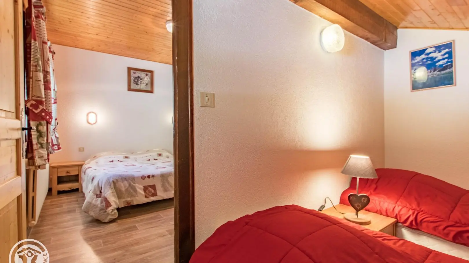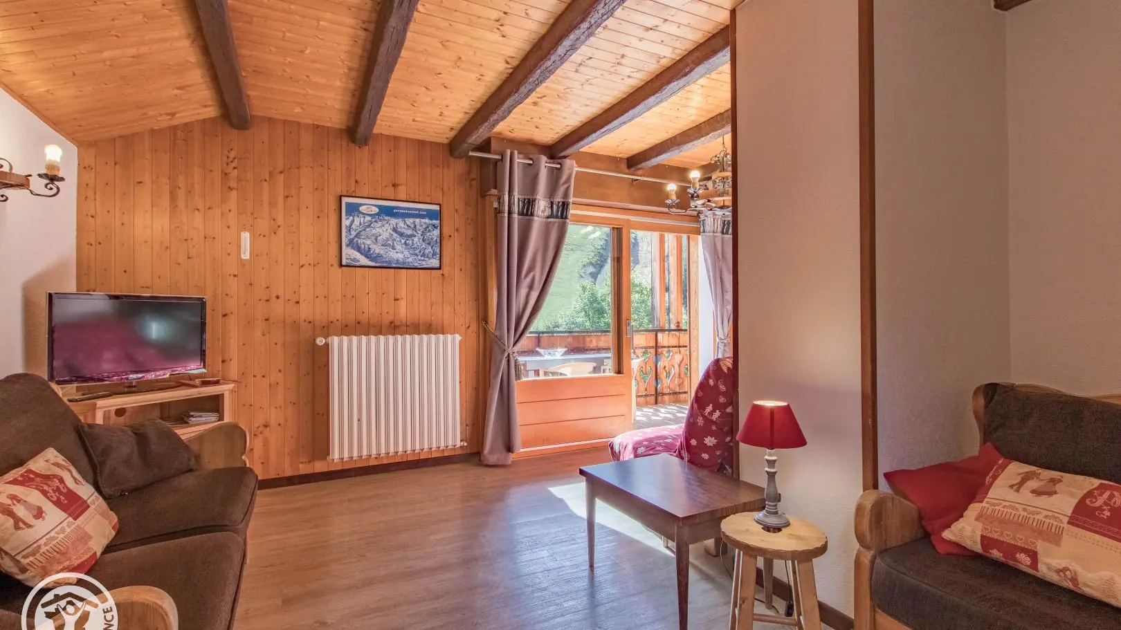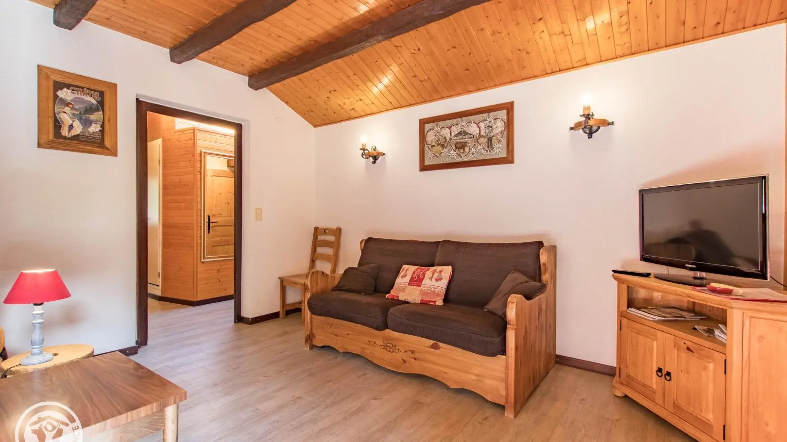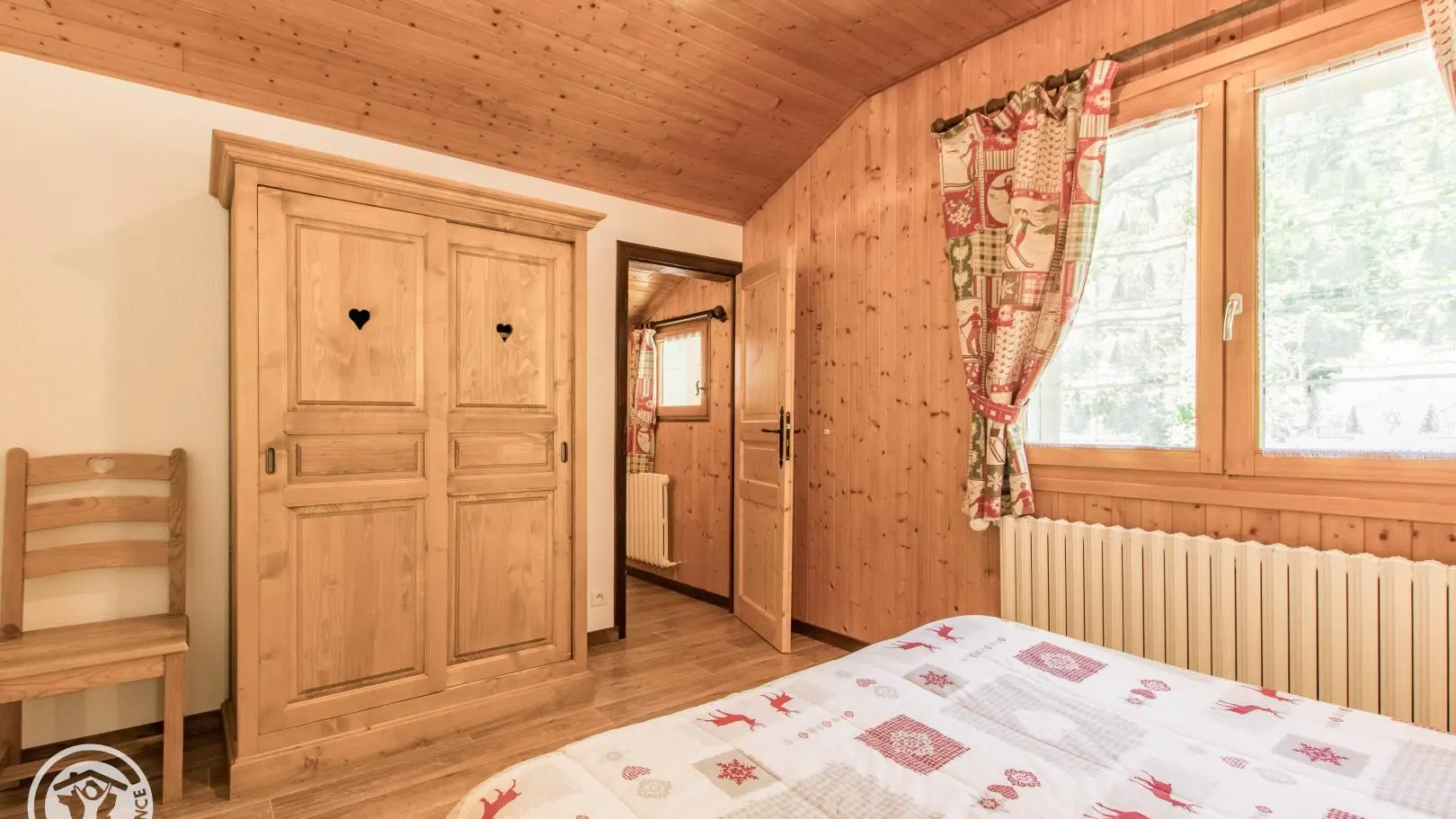 Ingerichte keuken met eethoek, uitgevend op de woonkamer (2 zitbanken waarvan 1 rapido, televisie 80cm), toegang tot het balkon op het zuiden (zicht op de pistes in de winter). 4 slaapkamers, waarvan 2 communicerend: slaapkamer 1 (1 bed van 160x200cm), slaapkamer 2 (zolder) communicerend / toegang via slaapkamer 1 (2 bedden van 90x190cm die dichter bij elkaar geschoven kunnen worden), slaapkamer 3 (3 bedden van 90x190cm), slaapkamer 4 (zolder) (1 bed van 140x190cm). 1 badkamer (met bad, douche, wc) + 1 kleine doucheruimte (compact type met douche, wc), aparte wc. Wifi internettoegang. Gemeenschappelijke wasmachine voor alle 5 de gîtes. Eigen skilocker. Optioneel: beddengoed, handdoeken, eindschoonmaak. Privé parkeerplaats voor het chalet. Fietsenstalling. Skilockers. Balkon met tuinmeubelen, uitzicht op de bergen (en skipistes in de winter).
