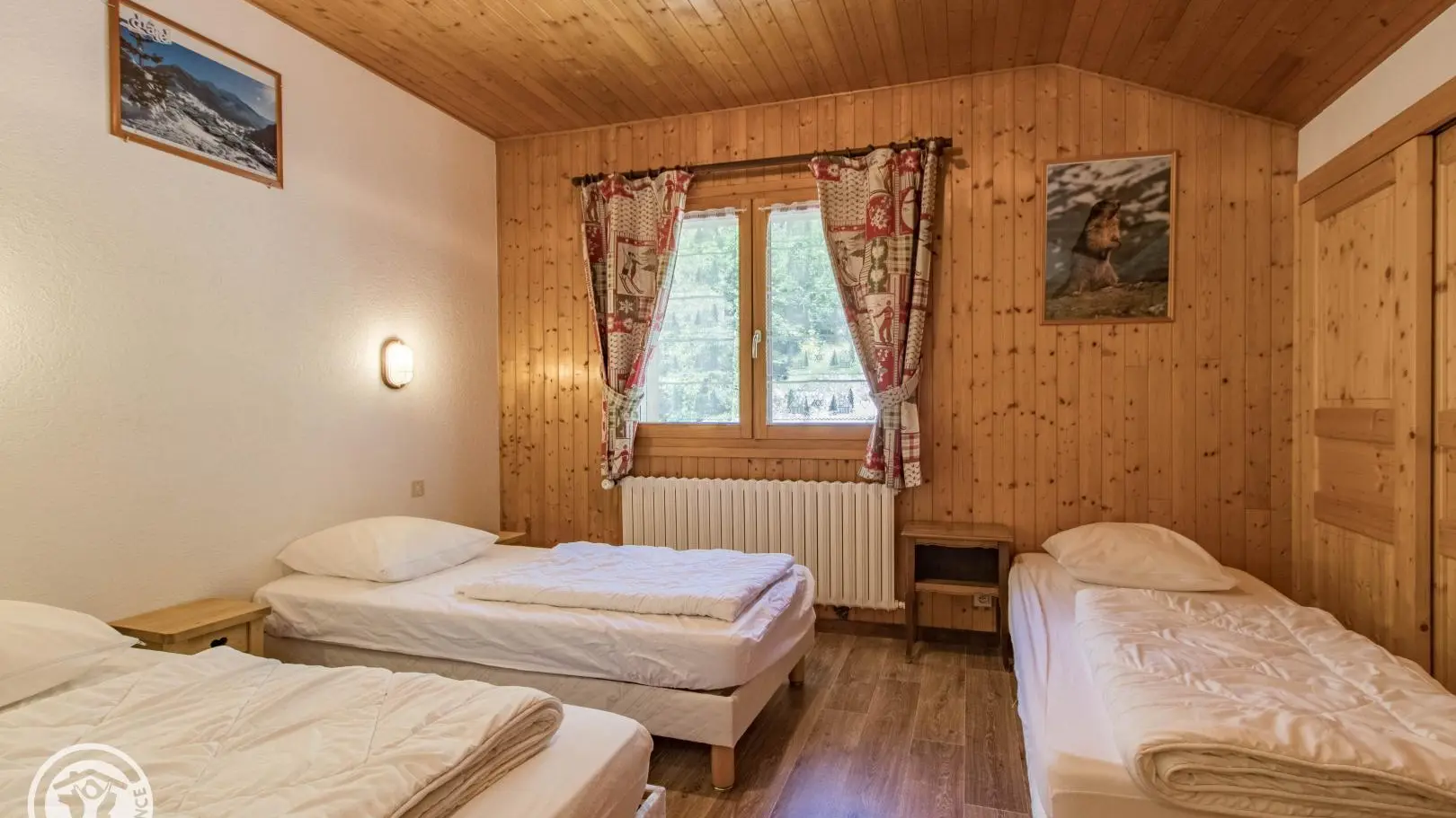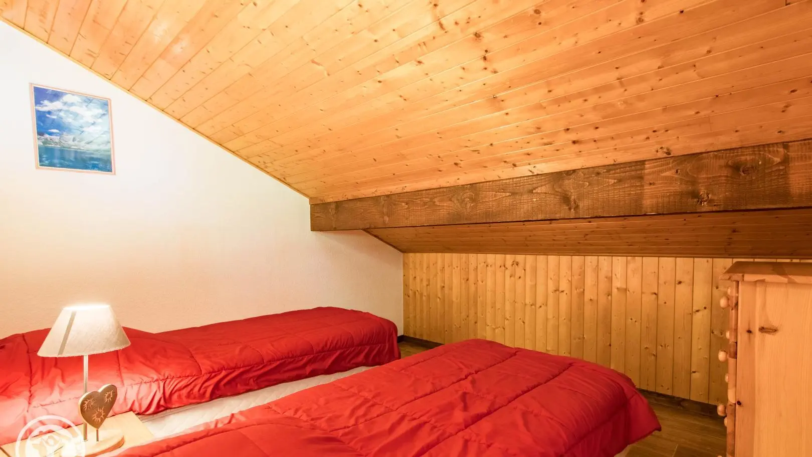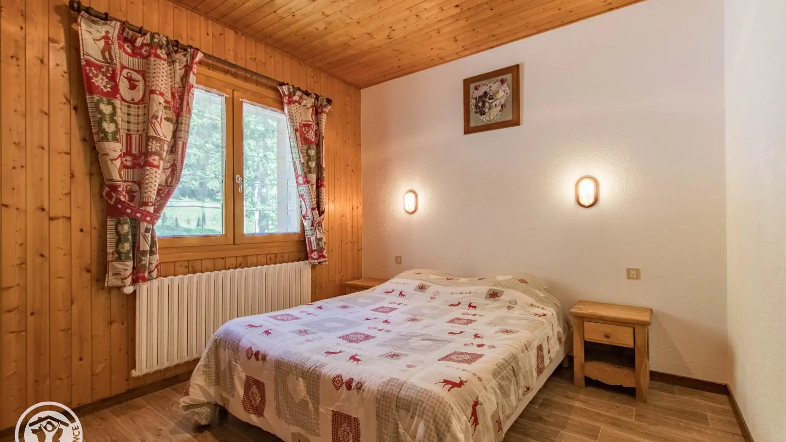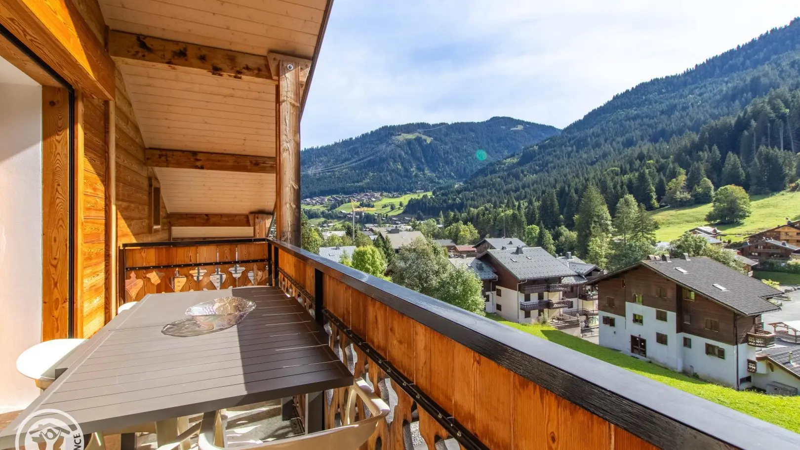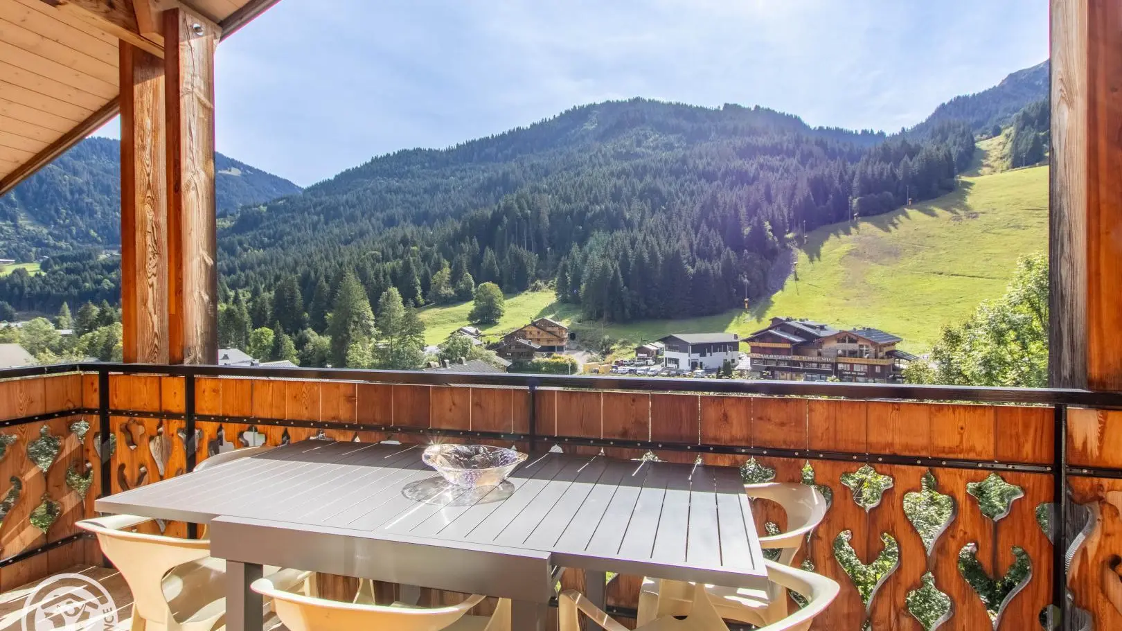 Ingerichte keuken met eethoek, uitgevend op de woonkamer (2 zitbanken waarvan 1 rapido, televisie 80cm), toegang tot het balkon op het zuiden (zicht op de pistes in de winter). 4 slaapkamers, waarvan 2 communicerend: slaapkamer 1 (1 bed van 160x200cm), slaapkamer 2 (zolder) communicerend / toegang via slaapkamer 1 (2 bedden van 90x190cm die dichter bij elkaar geschoven kunnen worden), slaapkamer 3 (3 bedden van 90x190cm), slaapkamer 4 (zolder) (1 bed van 140x190cm). 1 badkamer (met bad, douche, wc) + 1 kleine doucheruimte (compact type met douche, wc), aparte wc. Wifi internettoegang. Gemeenschappelijke wasmachine voor alle 5 de gîtes. Eigen skilocker. Optioneel: beddengoed, handdoeken, eindschoonmaak. Privé parkeerplaats voor het chalet. Fietsenstalling. Skilockers. Balkon met tuinmeubelen, uitzicht op de bergen (en skipistes in de winter).