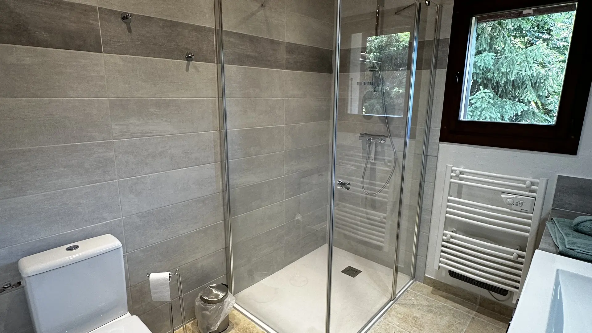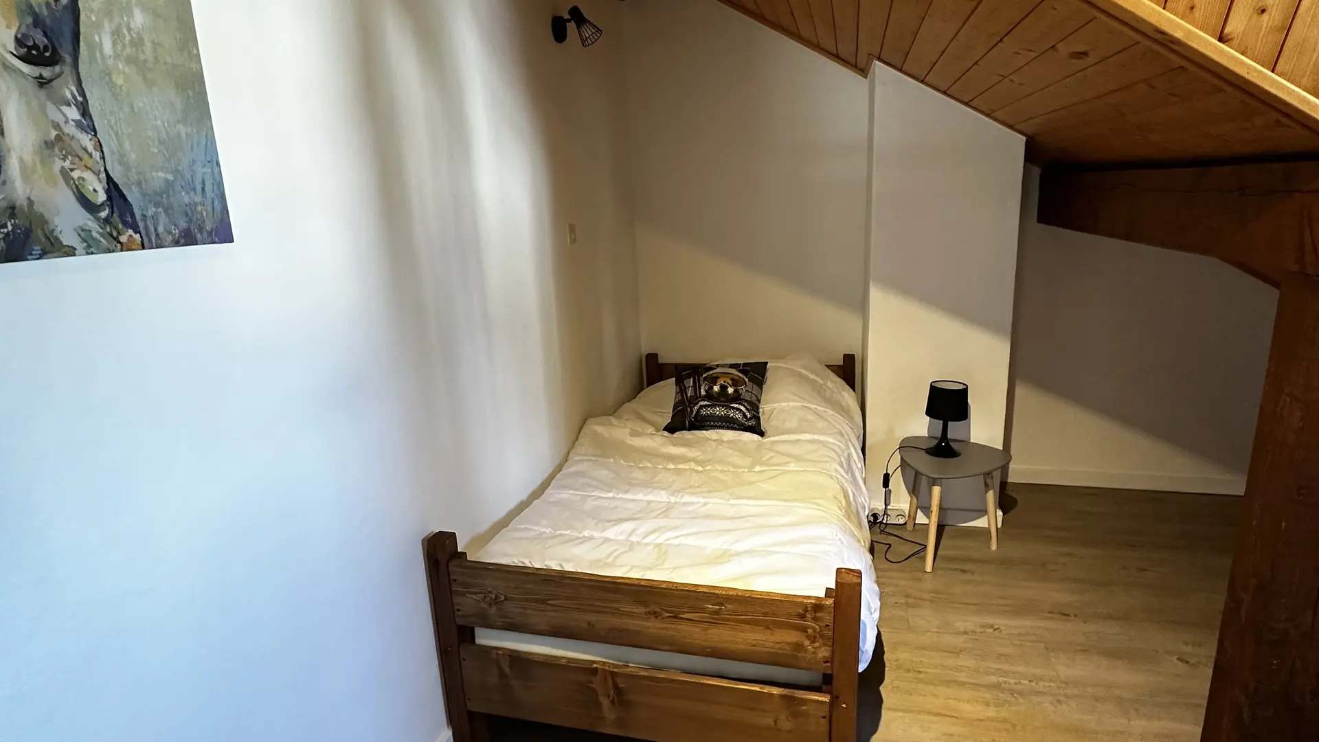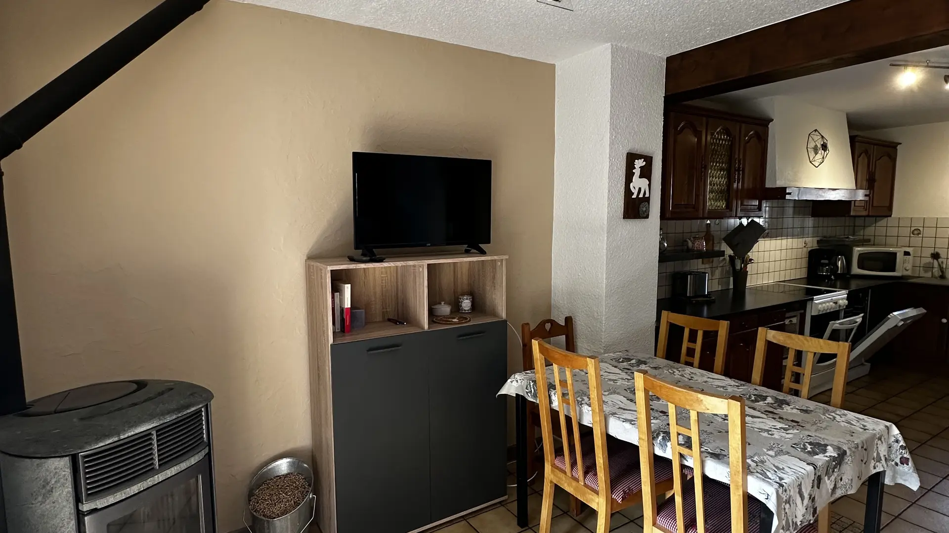 - in de woonkamer geniet je van de warmte van een pelletkachel naast de elektrische verwarming, en een tv-scherm