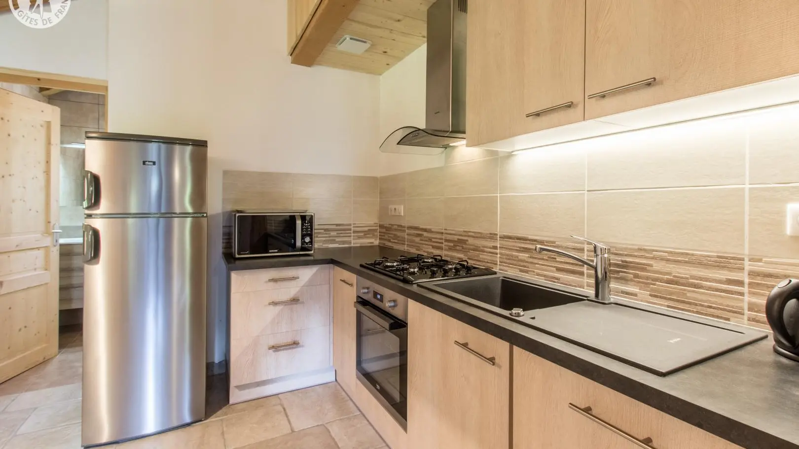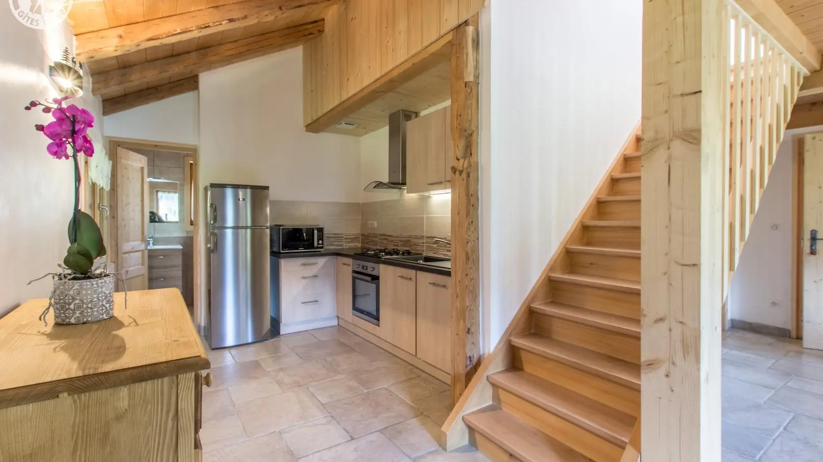 Gedeelde ingang aan de achterkant van het huis voor alle 4 de gîtes. Ingerichte keuken die uitgeeft op een grote woonkamer (tv, bank), slaapkamer 1 (1 bed van 160x200cm), doucheruimte, aparte wc. Boven: slaapkamer 2 (1 bed 160x200cm), slaapkamer 3 (2 bedden 90x190cm). Beddengoed inbegrepen. Wifi internettoegang. Balkon op het zuiden met ligstoelen (uitzicht op de bergen en de waterval). Gemeenschappelijk terrein met 2 bostafels en gasbarbecue.