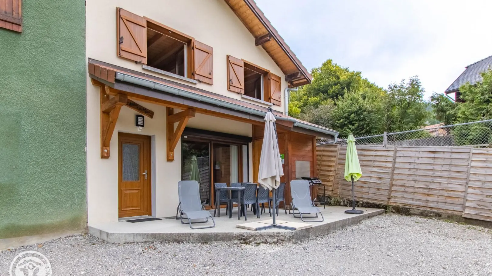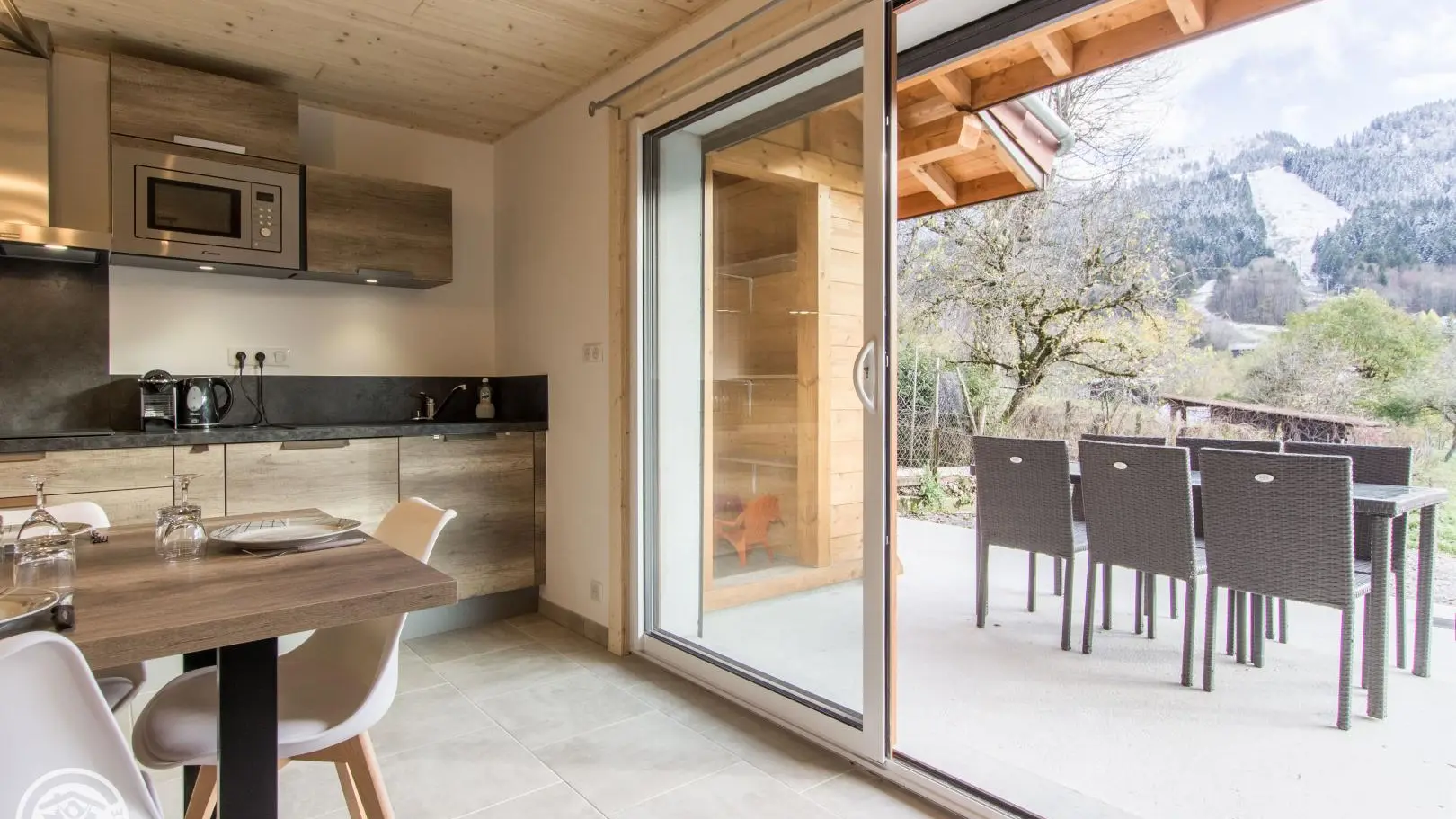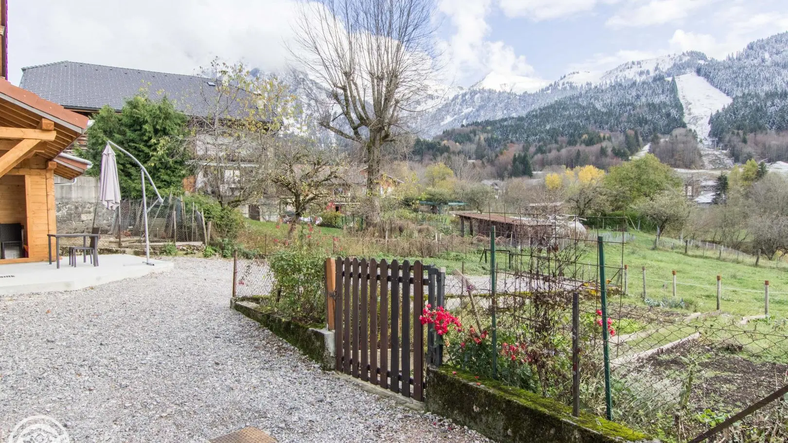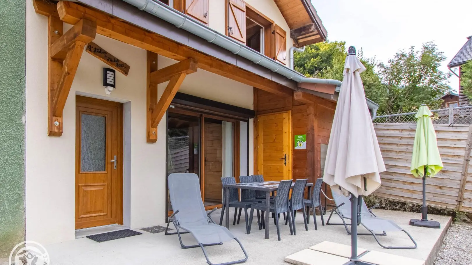 Privé-terras op het zuiden met uitzicht op de bergen (en uitzicht op de skipistes in de winter), tuinmeubelen, ligstoelen, parasol, barbecue. Binnenplaats, privé parkeerplaats.
