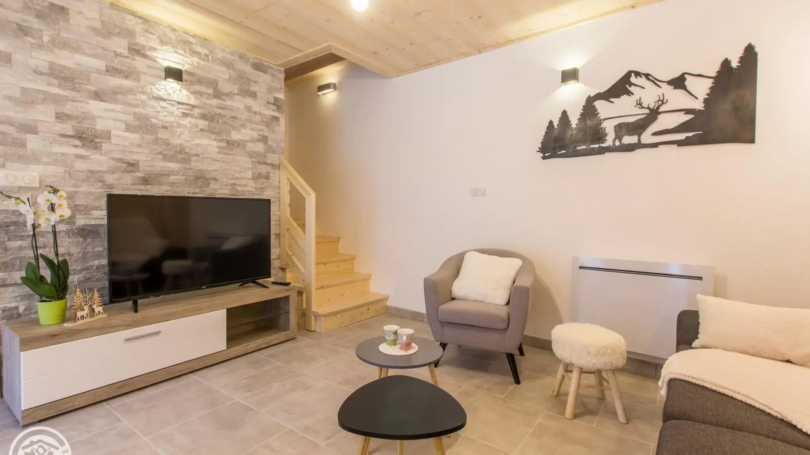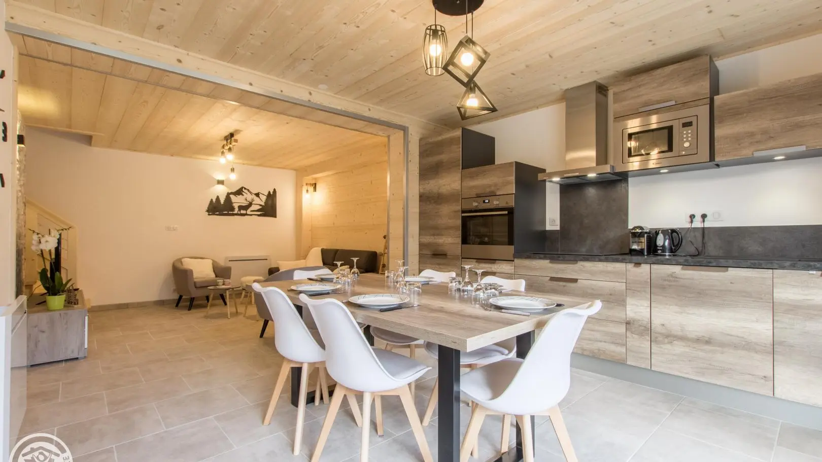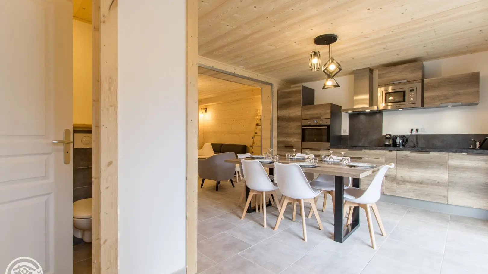 Smaakvol verbouwde halfvrijstaande dorpswoning van 3 verdiepingen van 88m² (+15m² zolderruimte), op het zuiden. Aparte ingang. Begane grond: ingerichte keuken uitgevend op woonkamer (eettafel, bank, fauteuils, televisie 123cm), erker uitgevend op privé-terras (uitzicht op de bergen). Wasruimte met wasmachine. Aparte WC met wastafel.