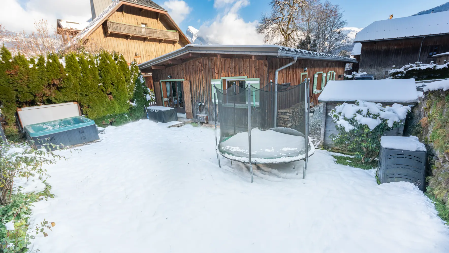 Le jardin privé comprend une terrasse ensoleillée et un espace gazonné, et il est équipée de table et chaises. L’extérieur est idéal pour des moments de détente entouré du panorama alpin avec, en bonus, un trampoline pour s’amuser en famille.