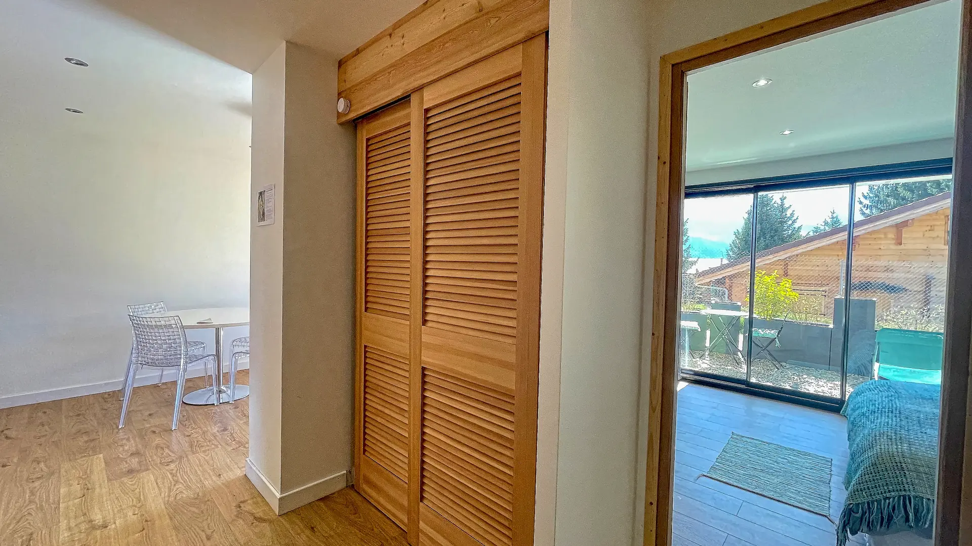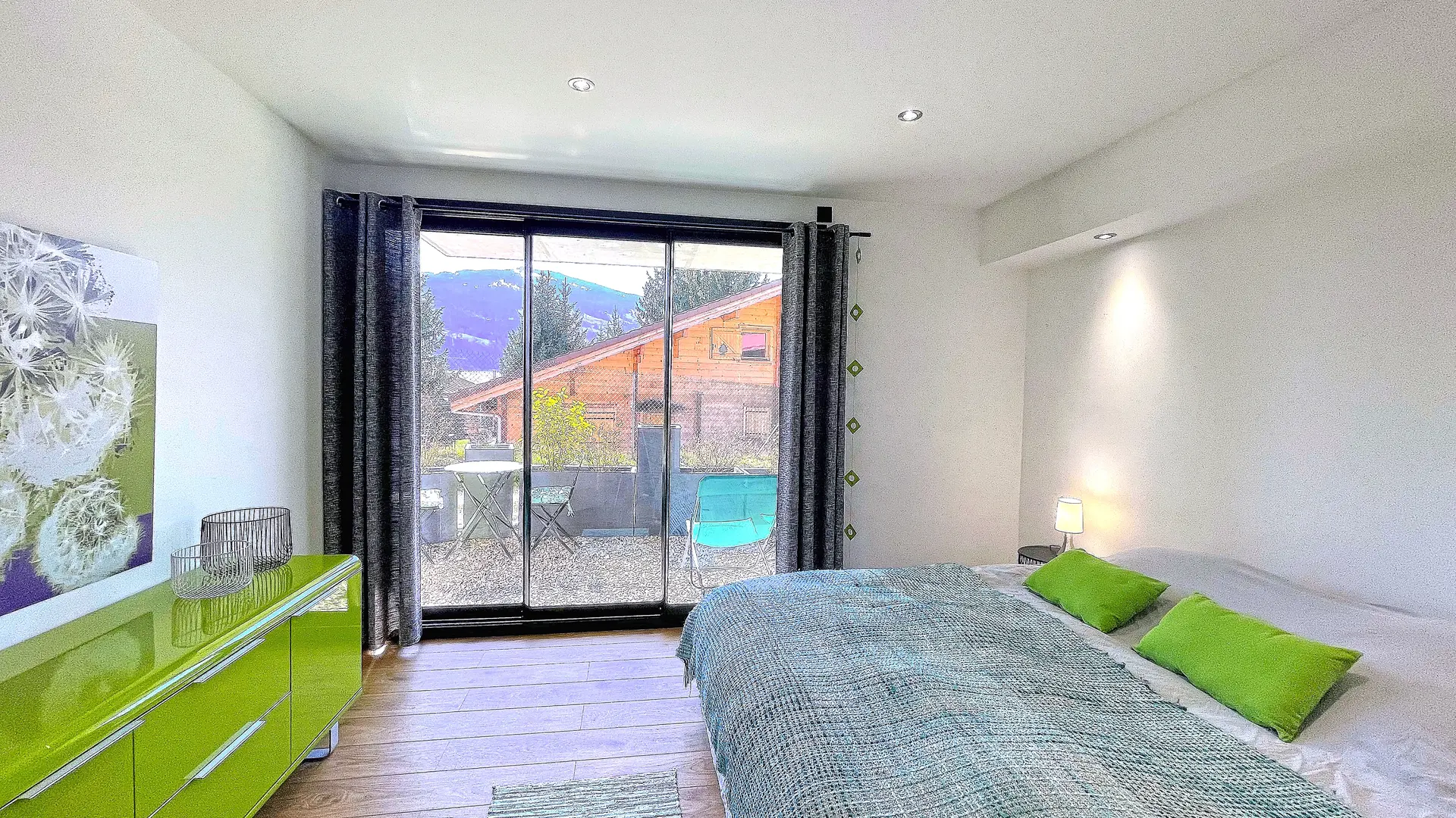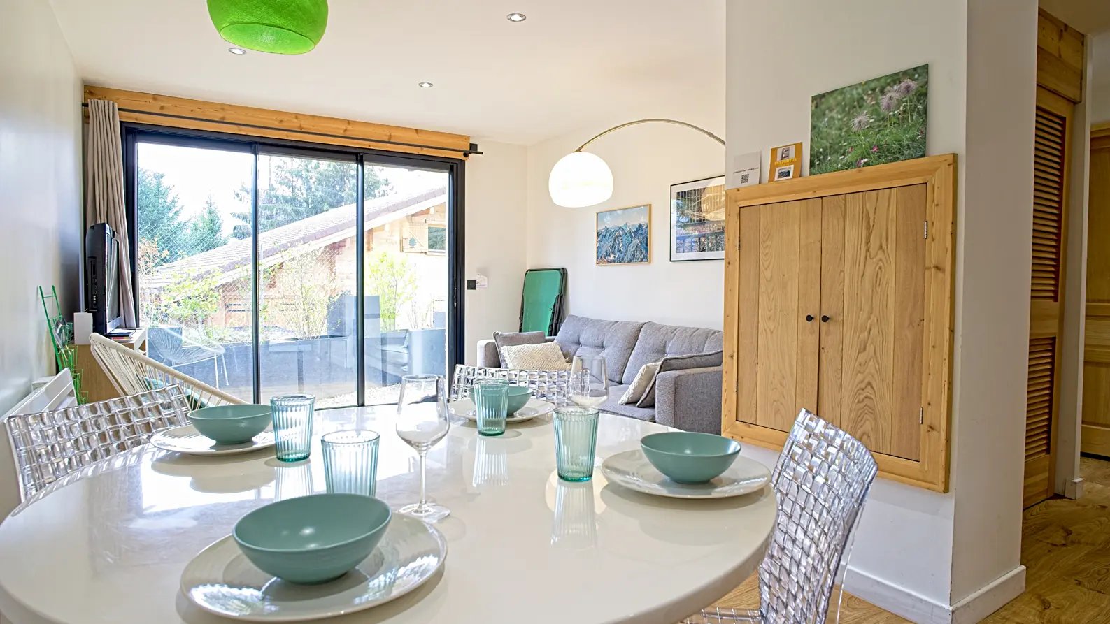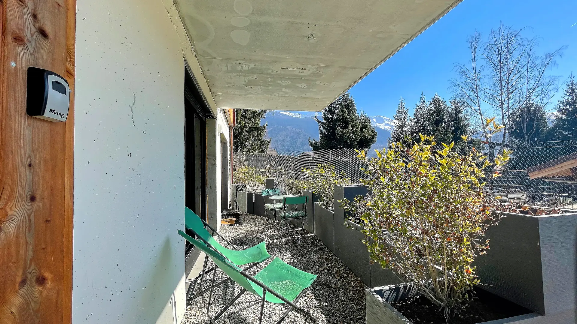 Terrasse privative abritée, avec 1 table et 2 chaises, 2 chaises longues, 1 parasol. Au calme. Vue sur les montagnes.
