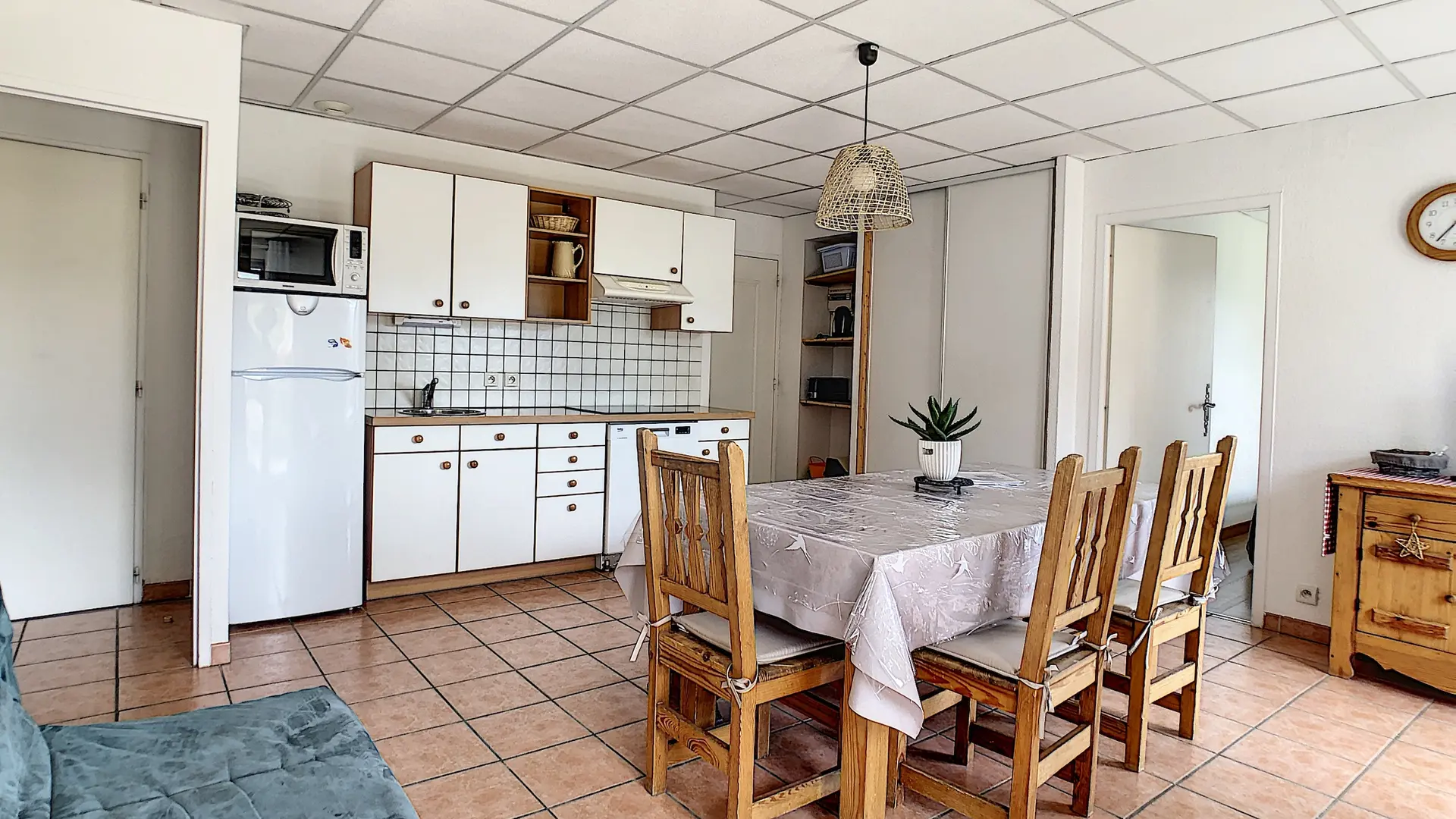 La cuisine de cet appartement est ouverte sur la pièce principale, avec une table à manger, un coin canapé/télévision.