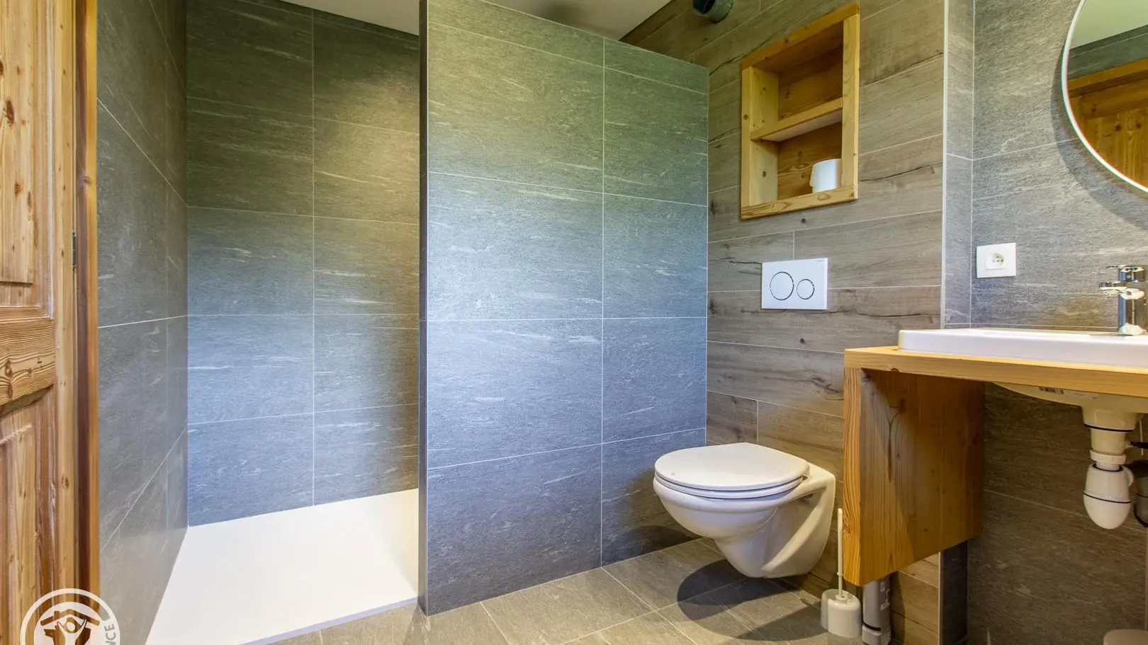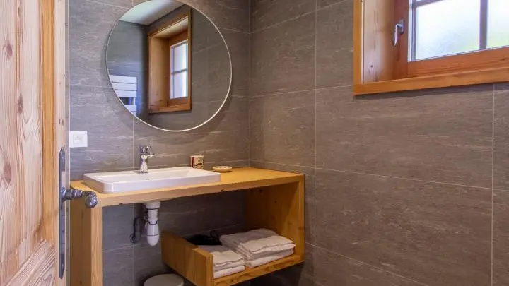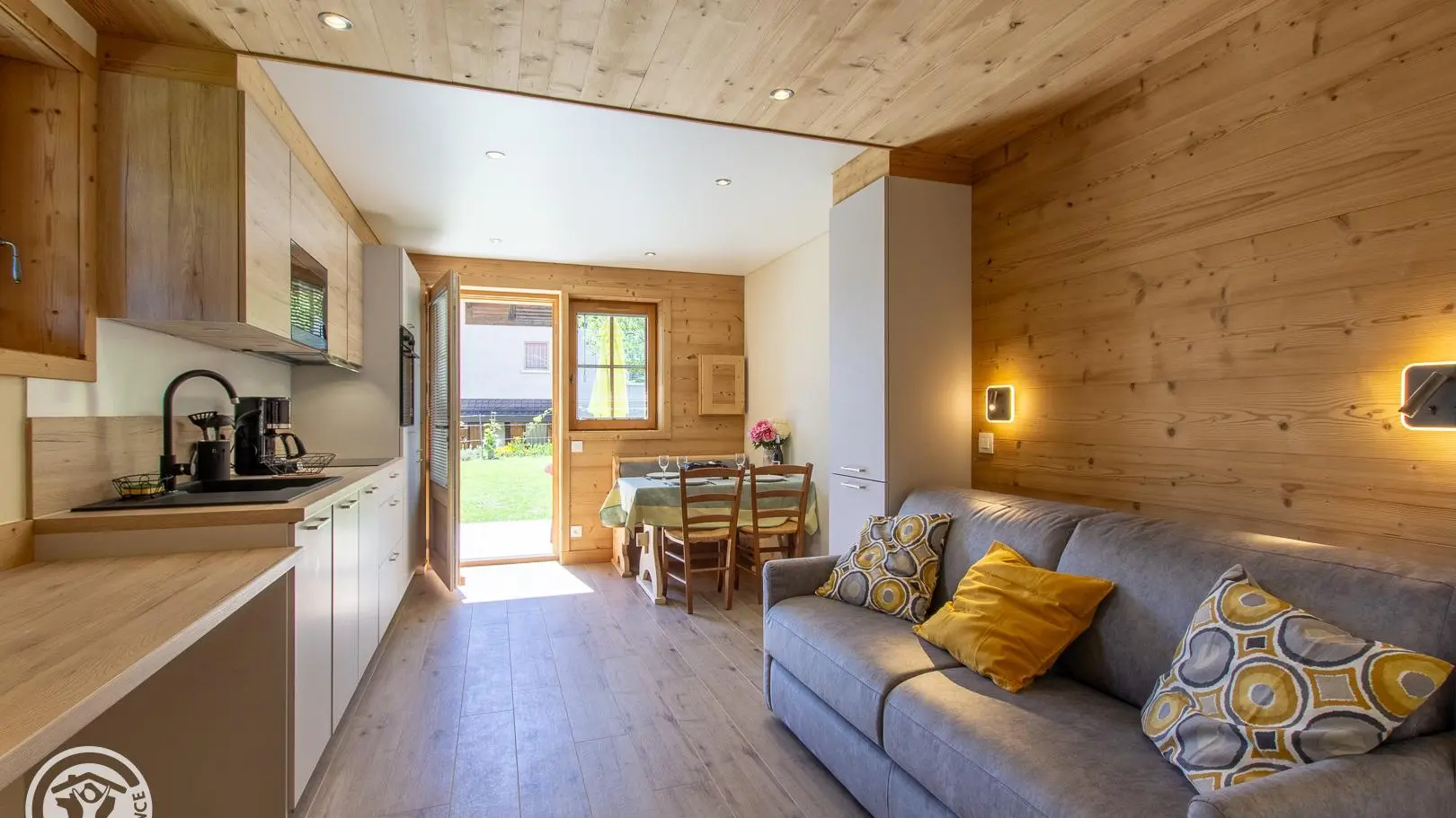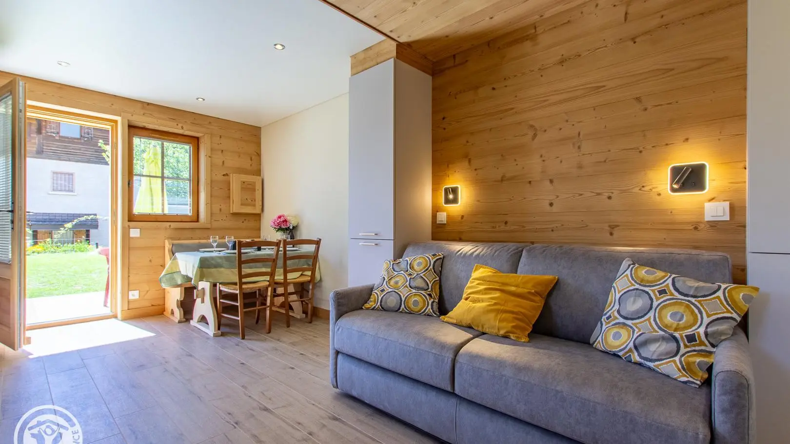 Gîte de 22m2 aménagé au rez-de-jardin d'un vaste chalet de caractère comprenant également un autre gîte (mitoyen), ainsi que 2 logements propriétaires.