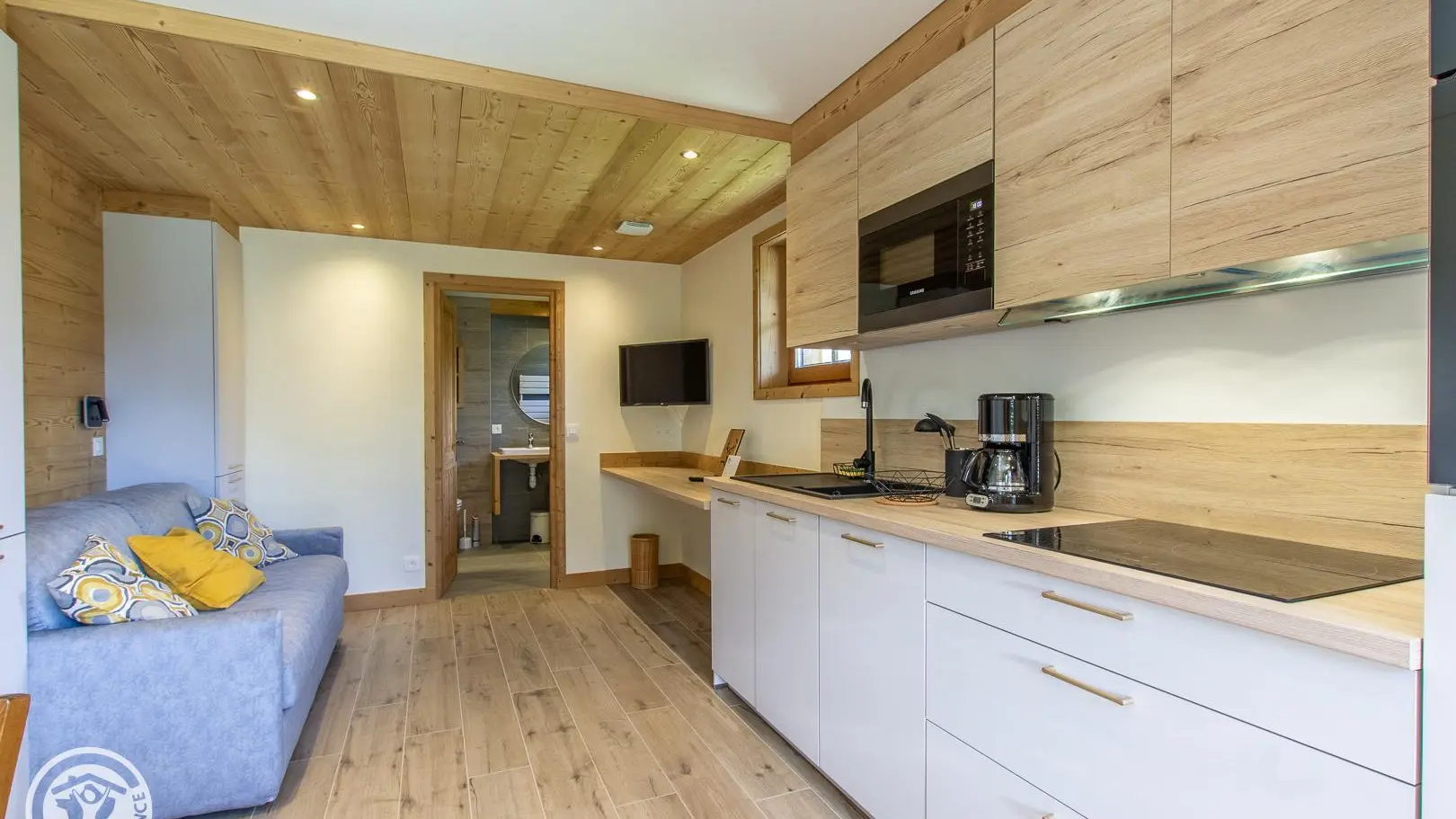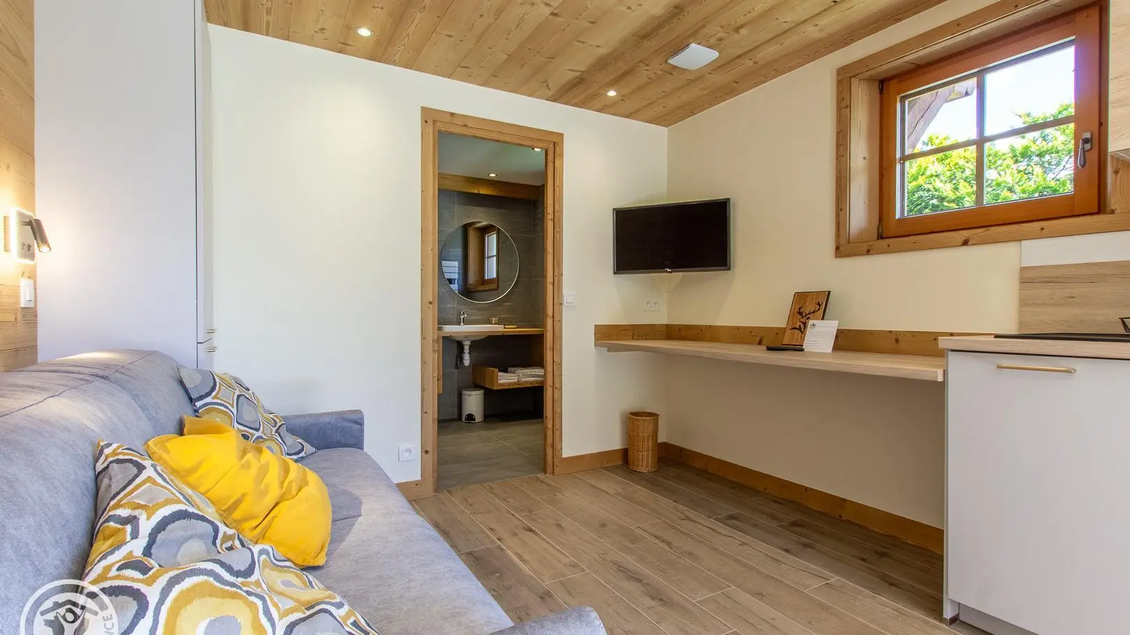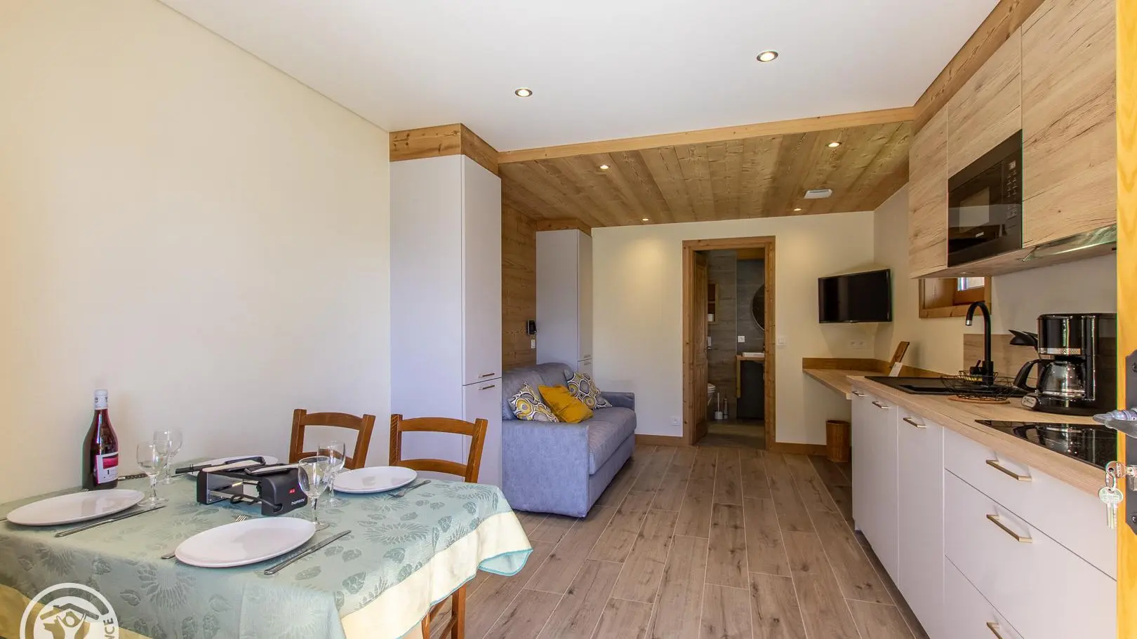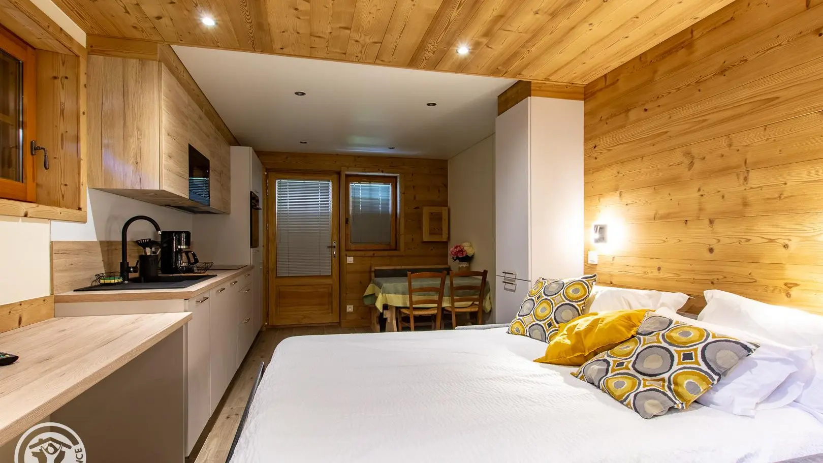 Le studio se compose : d'une pièce de vie avec cuisine intégrée, coin repas (table, chaises et banc) et espace salon/couchage (Tv, canapé convertible rapido offrant un confortable couchage 140x190cm), salle d'eau (avec douche à l'italienne et wc).