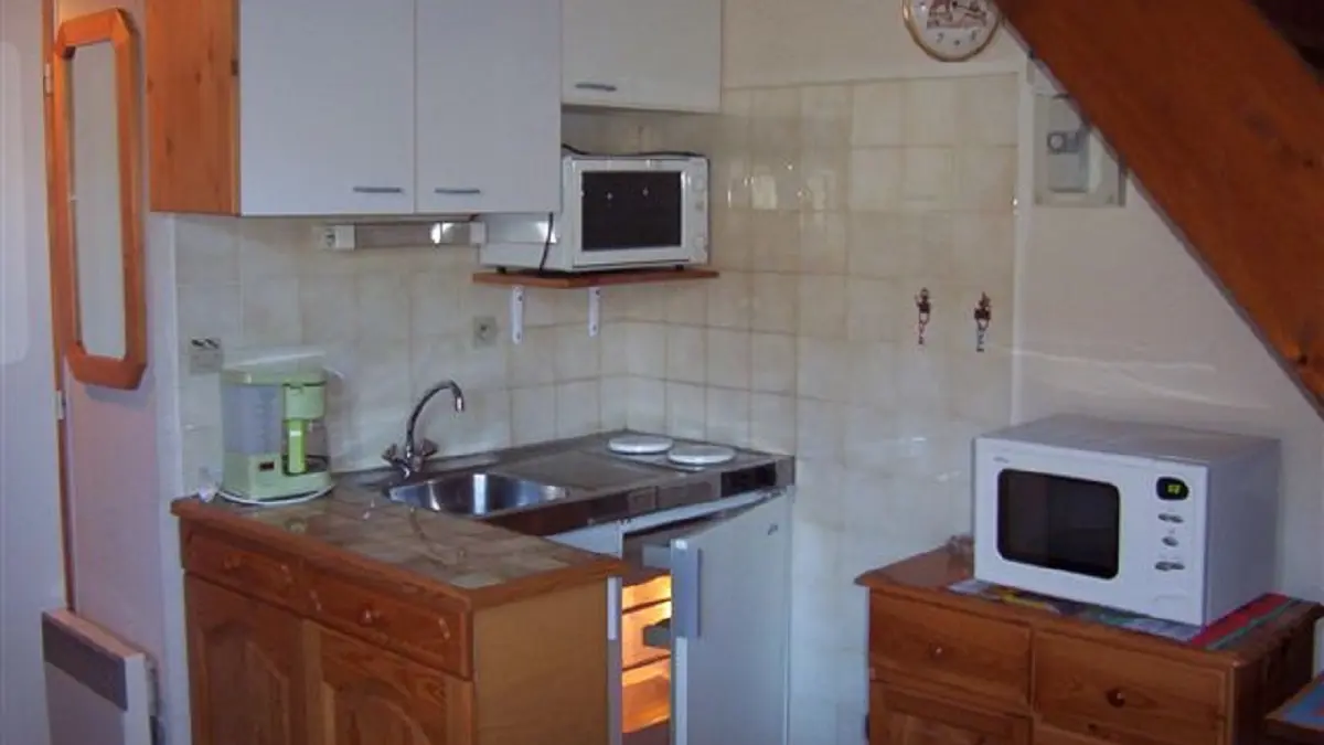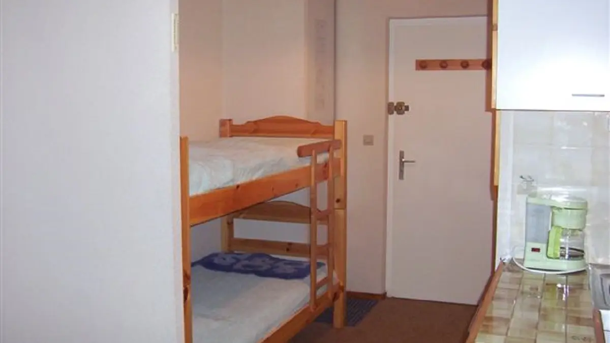 Dans une résidence, au pied des pistes et proche des commerces, appartement avec 2 chambres : une mezzanine avec 2 lits d'une personne avec velux et une chambre avec un lit double.