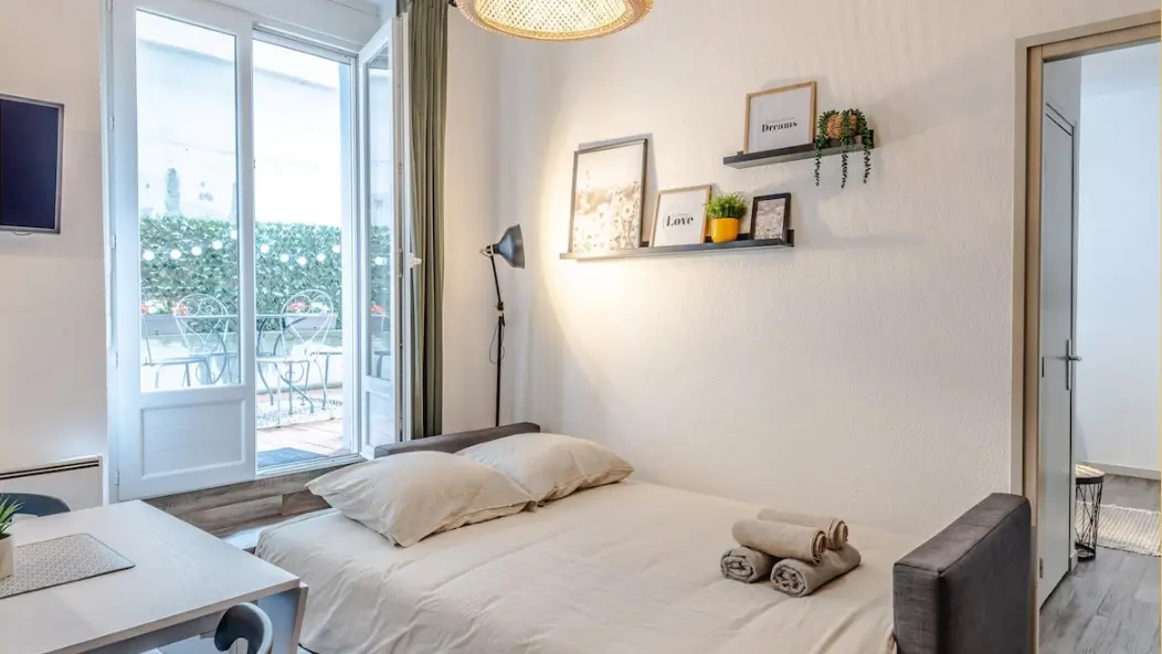 Proche des Thermes et des commerces, il propose une cuisine ouverte sur salon avec convertible 2 personnes, une chambre grand lit, une salle de bain avec baignoire et WC.