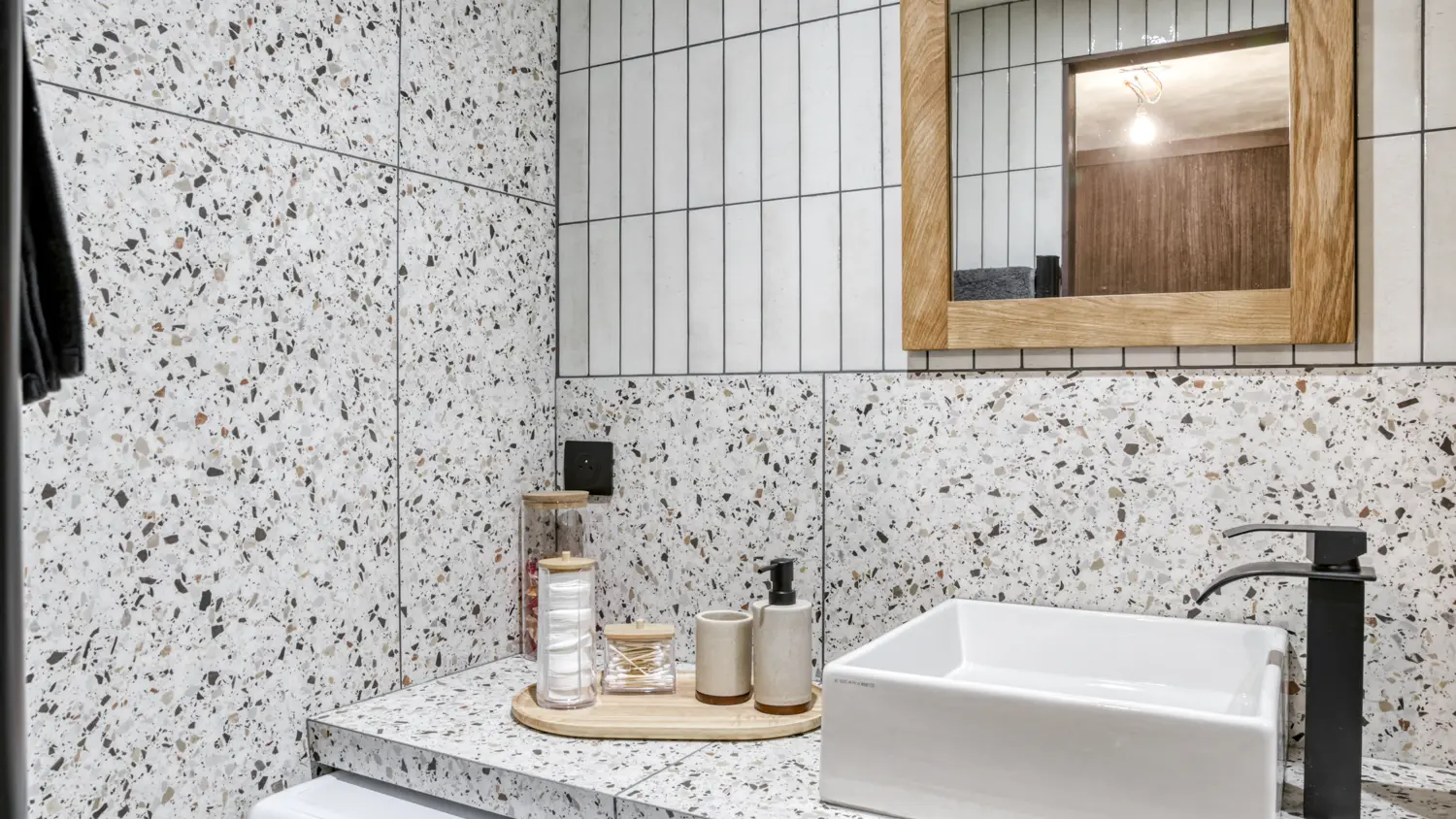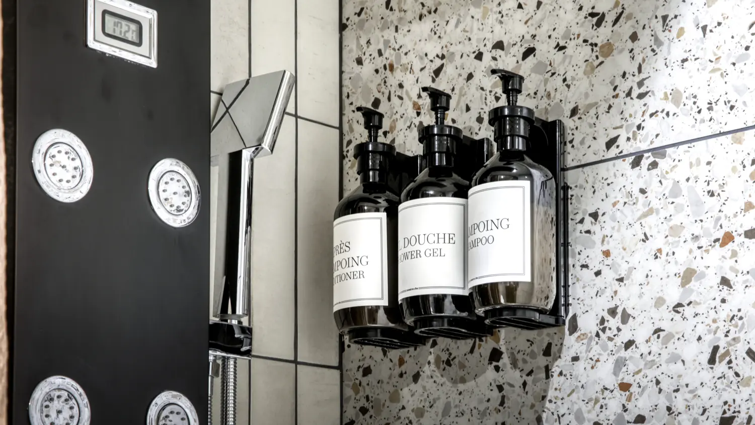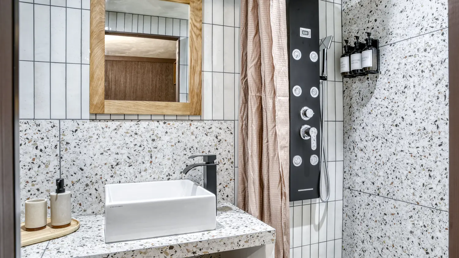 - La salle de bain moderne offre une douche avec jets pour un moment de détente après la montagne.