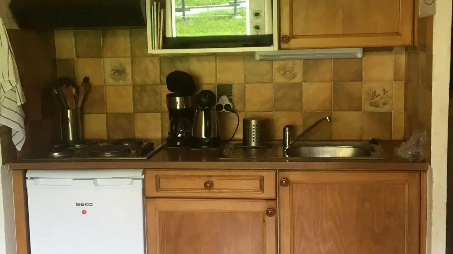 - Coin cuisine : cuisinière 4 feux électrique, four électrique, four micro-ondes, réfrigérateur, cafetière Nespresso, bouilloire électrique, grille pain, mixeur, batteur