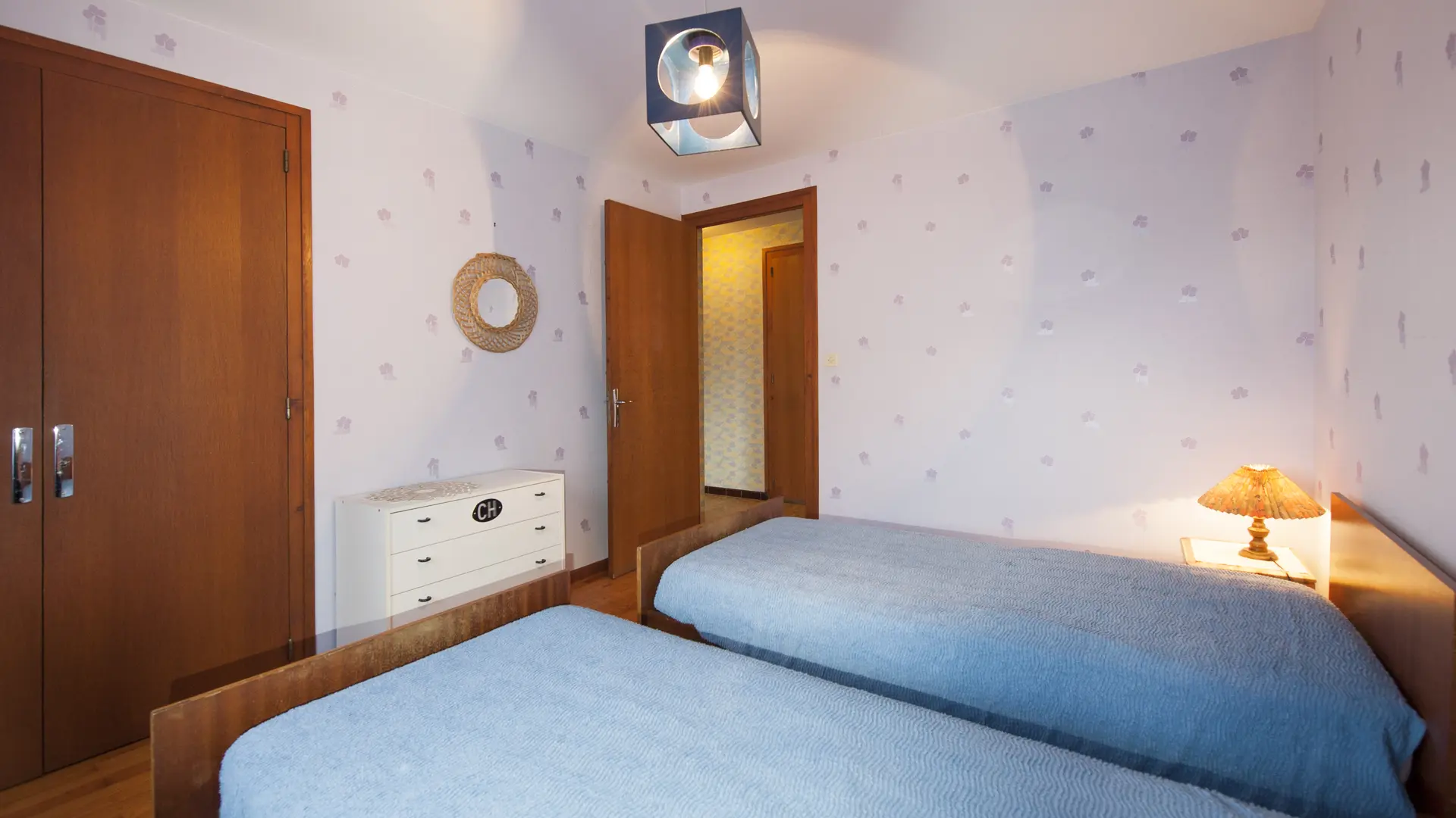Salon avec 1 canapé convertible 2 personnes, télévision, cuisine fermée avec four, lave vaisselle, salle de bain, wc. 1 chambre avec 2 lits 1 personne, 1 chambre avec 1 lit 2 places + lavabo. Balcon expo sud, vue sur la chaîne du Mont-Blanc,cour jardin,parking,garage,local à skis et vélos. dans un village très calme