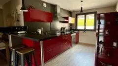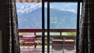 1 cuisine équipée (four, micro-ondes, réfrigérateur/congélateur, lave-vaisselle, plaque induction) ouverte sur un grand séjour-salon avec TV, baie vitrée donnant sur un balcon (vue massif du Mont Blanc)