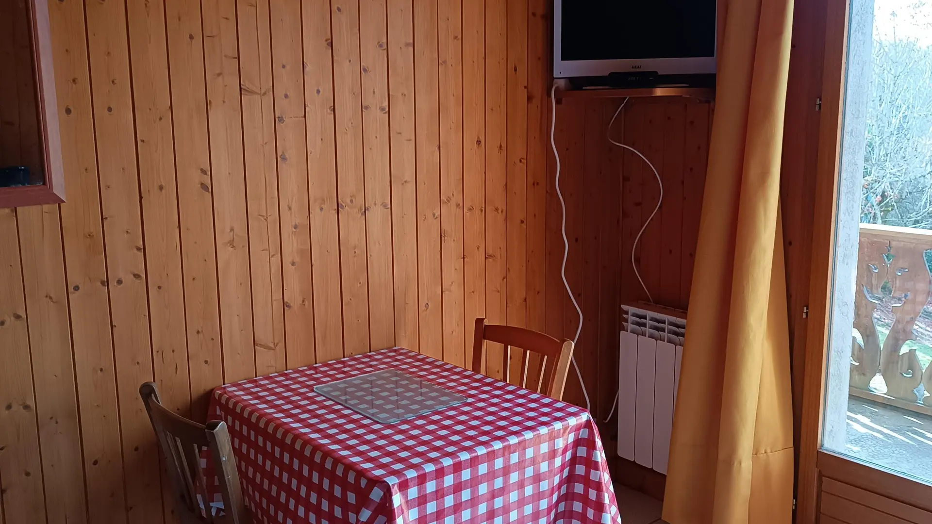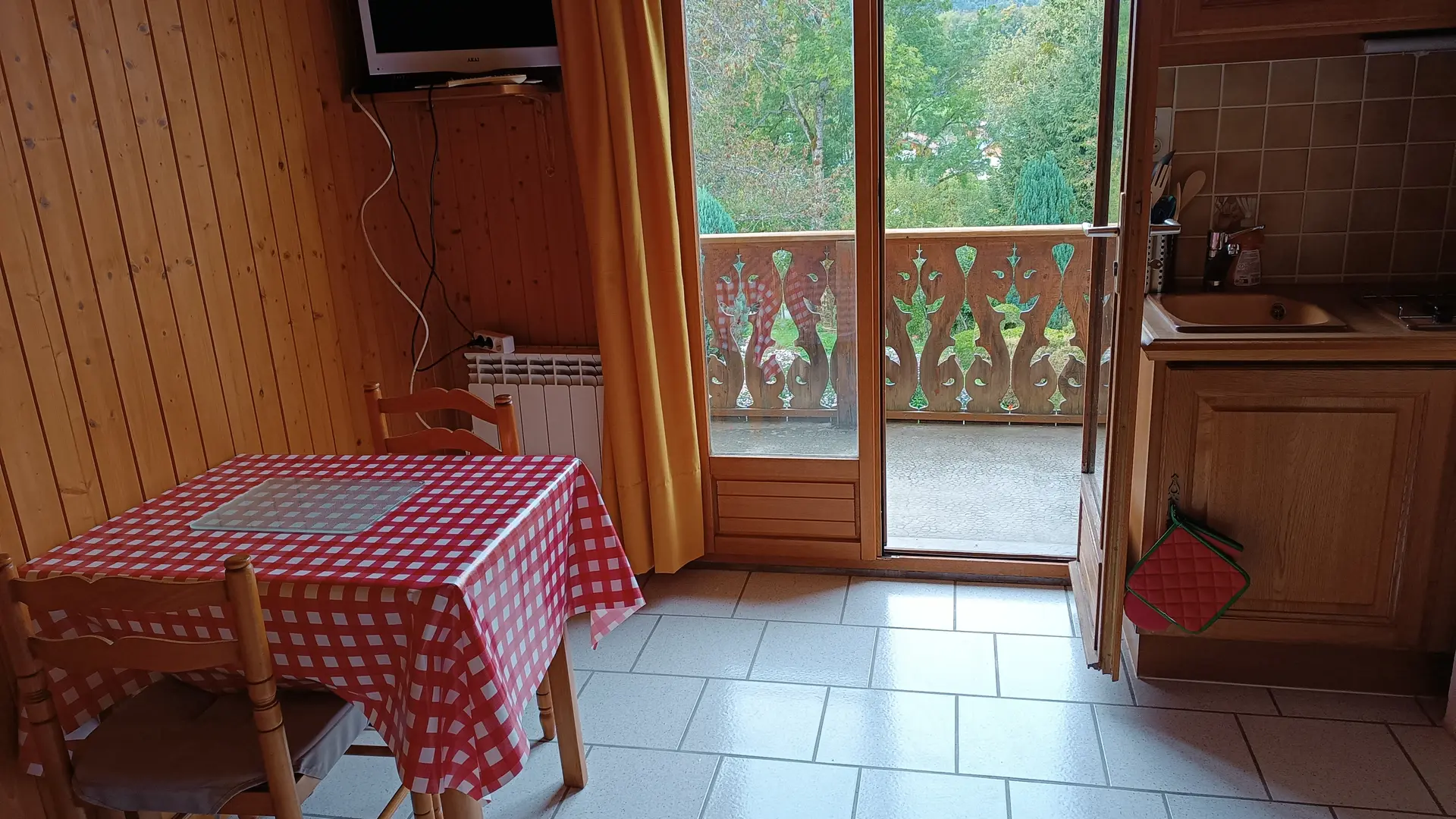 Studio de 15 m2, équipé entièrement avec micro-onde, réfrigérateur, lave-linge... Situé au 1er étage d'une ancienne ferme rénovée, l'accès est indépendant. Le couchage est constitué d'un lit double. Le balcon permet de prendre ses repas dehors avec vue sur les montagnes. La ferme est située dans un hameau calme et facile d'accès.