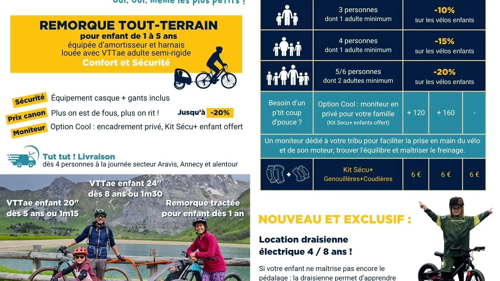 Notre pack famille a été conçu pour permettre aux familles de parcourir la montagne à VTT, même avec les plus petits, en toute sécurité :