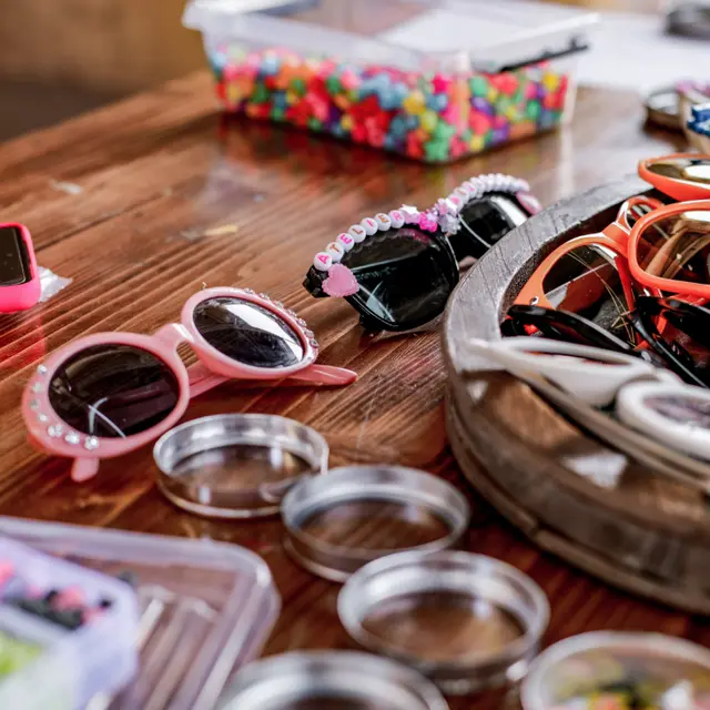 Tout est fourni, Strass, Fleurs, Cœurs, Papillons, Perles, Vernis et paillettes de toutes les couleurs, et même les lunettes. Un moment rigolo et créatif pour petits et grands.