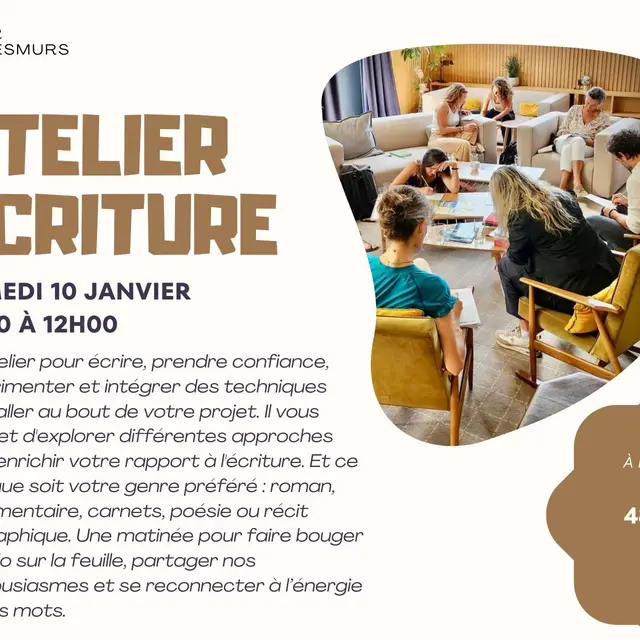 Un atelier pour écrire, prendre confiance, expérimenter et intégrer des techniques pour aller au bout de votre projet. Il vous permet d'explorer différentes approches pour enrichir votre rapport à l'écriture. Et ce quel que soit votre genre préféré : roman, documentaire, carnets, poésie ou récit biographique. Une matinée pour faire bouger le stylo sur la feuille, partager nos enthousiasmes et se reconnecter à l'énergie de nos mots.