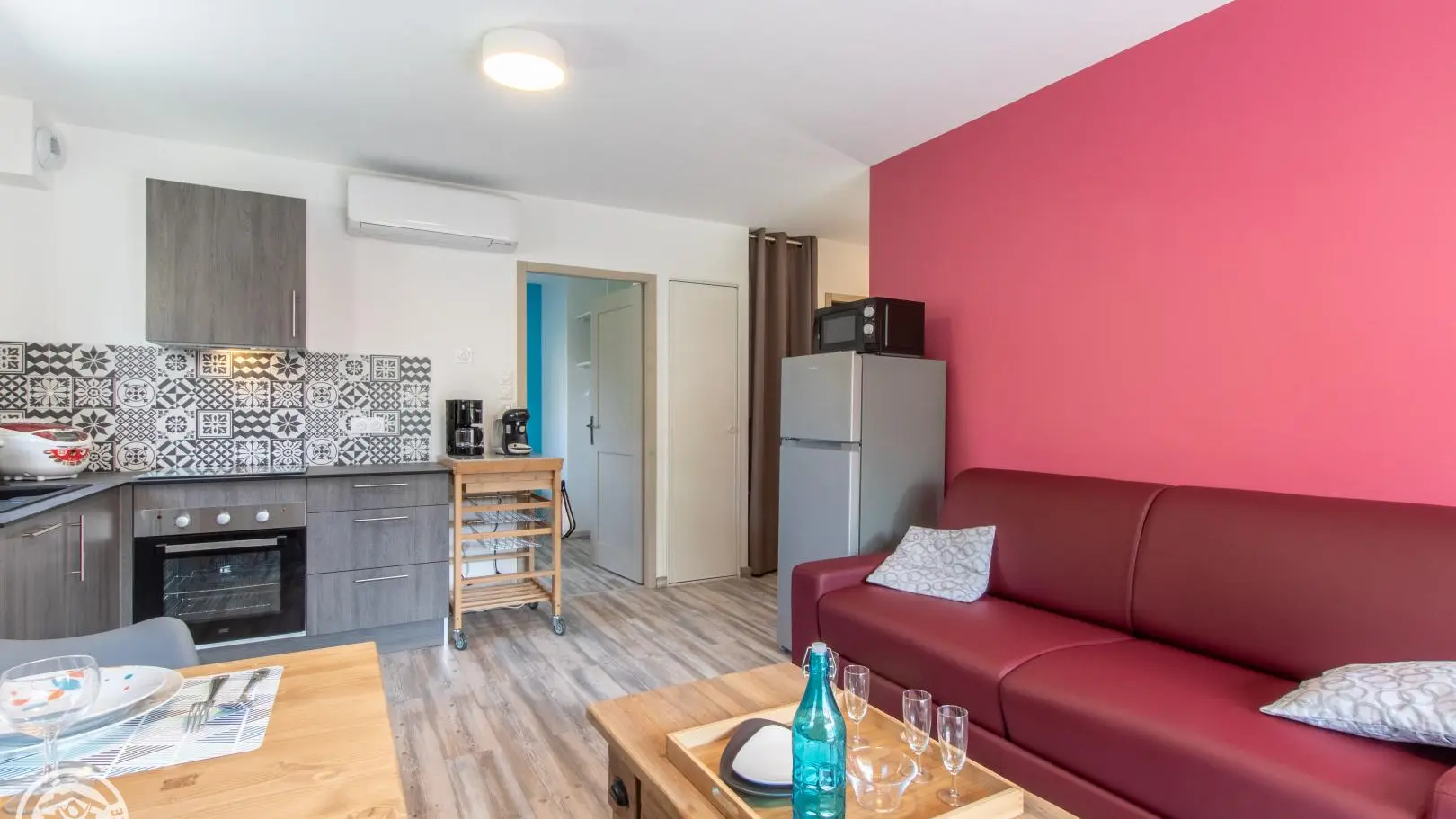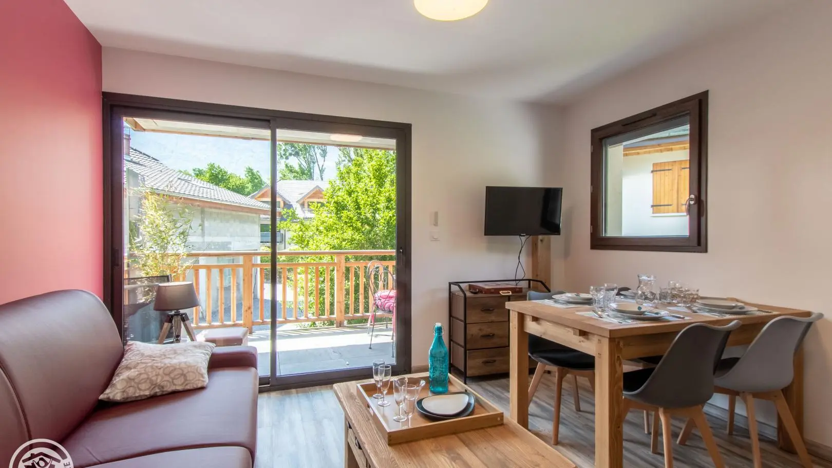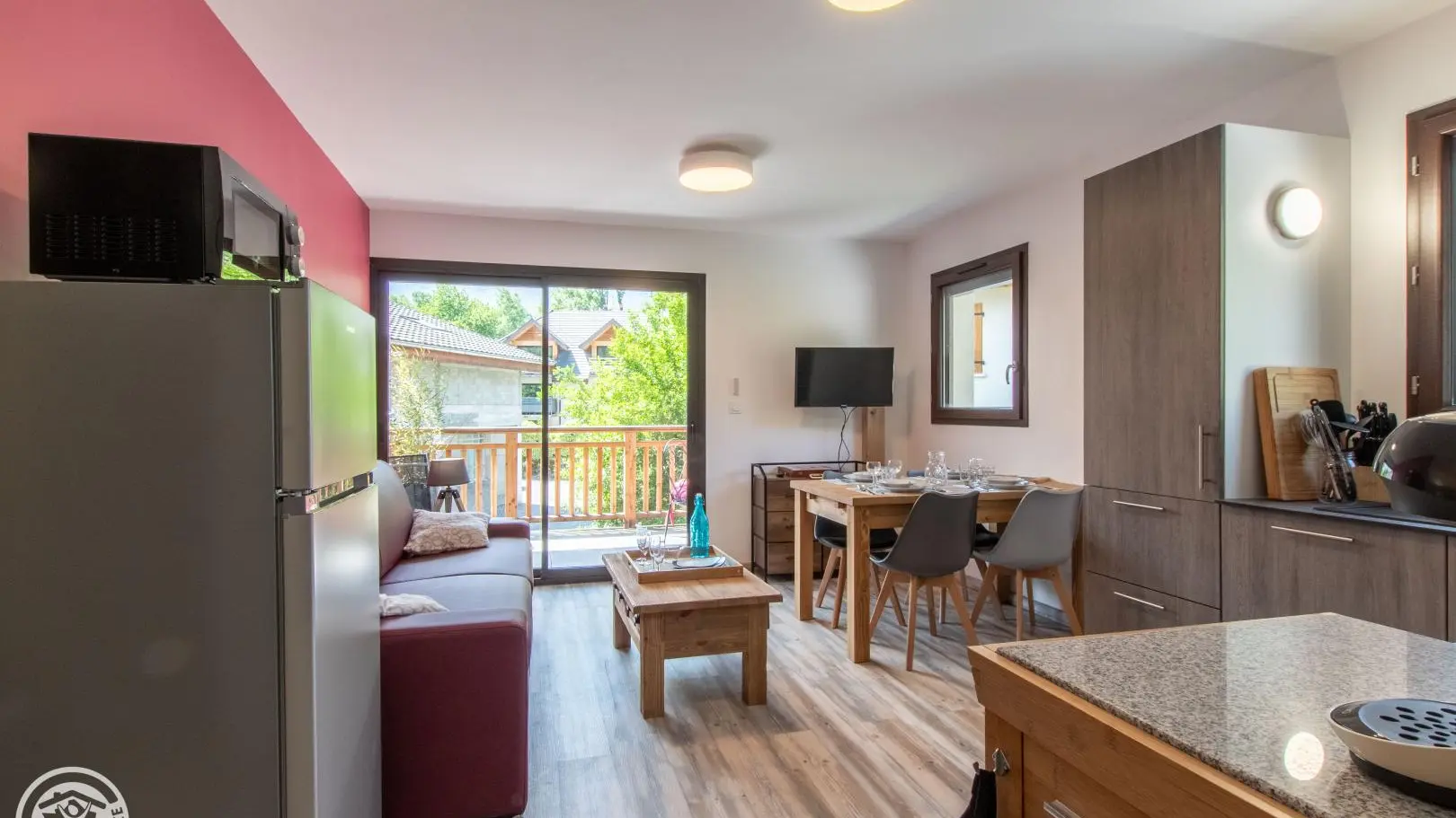 Cuisine équipée ouverte (lave-vaisselle) sur le séjour (table repas 4 personnes, canapé convertible rapido 140x190 cm, télévision murale connectée, climatisation réversible), porte-fenêtre avec accès balcon (table, chaises de jardin, transat).
