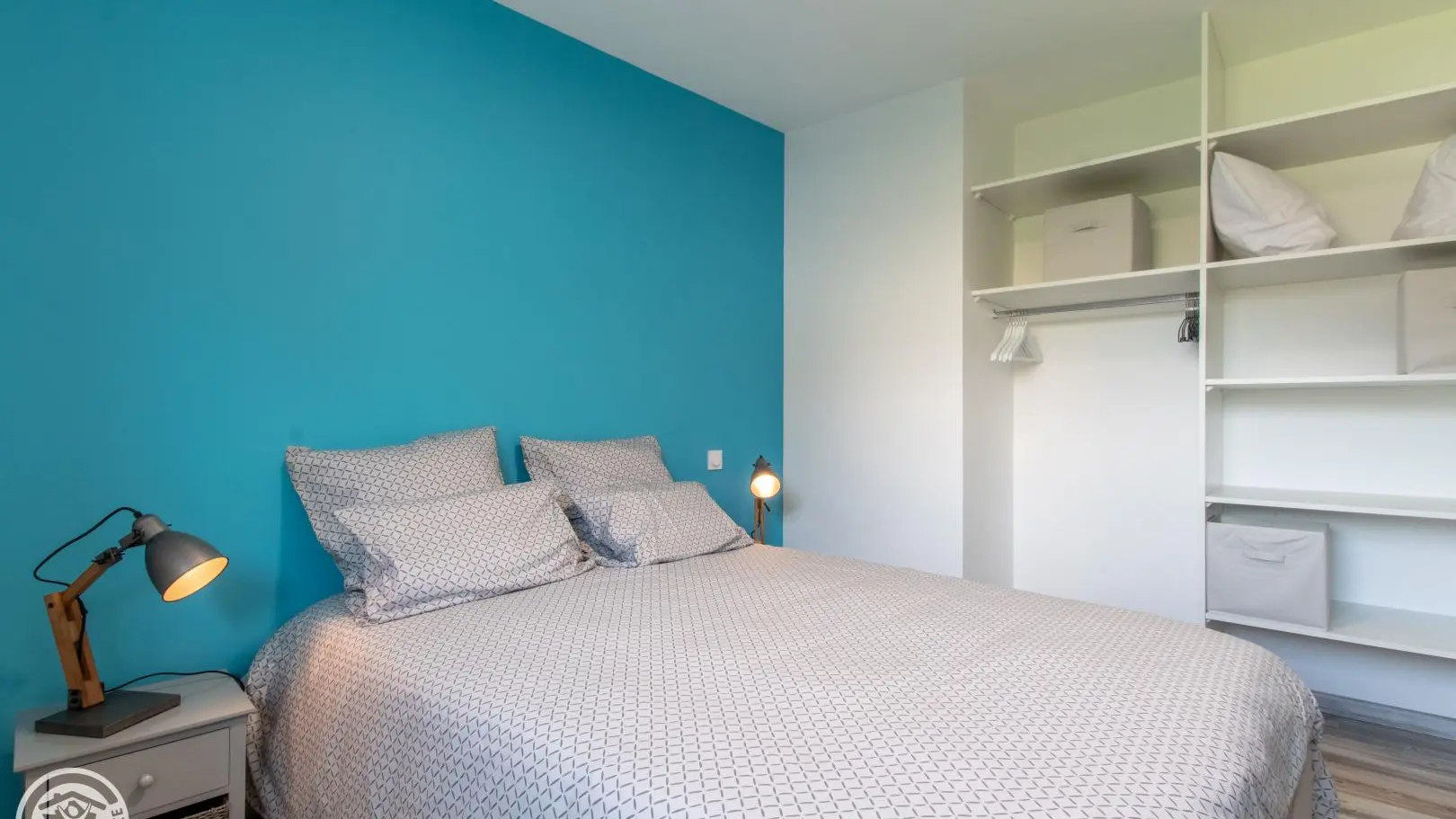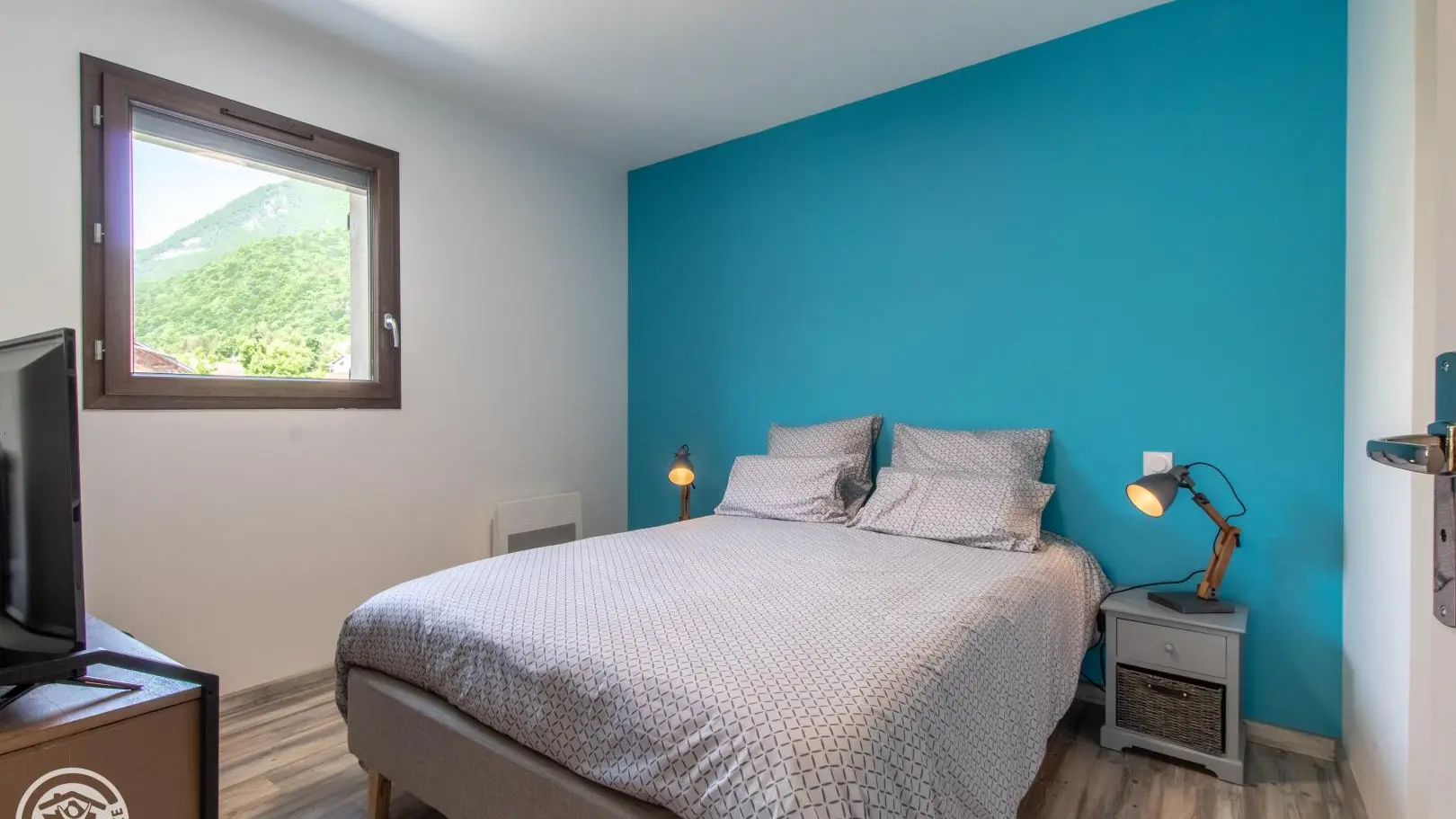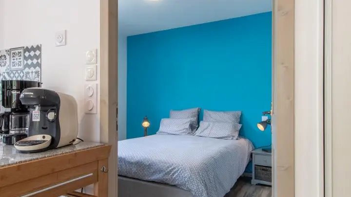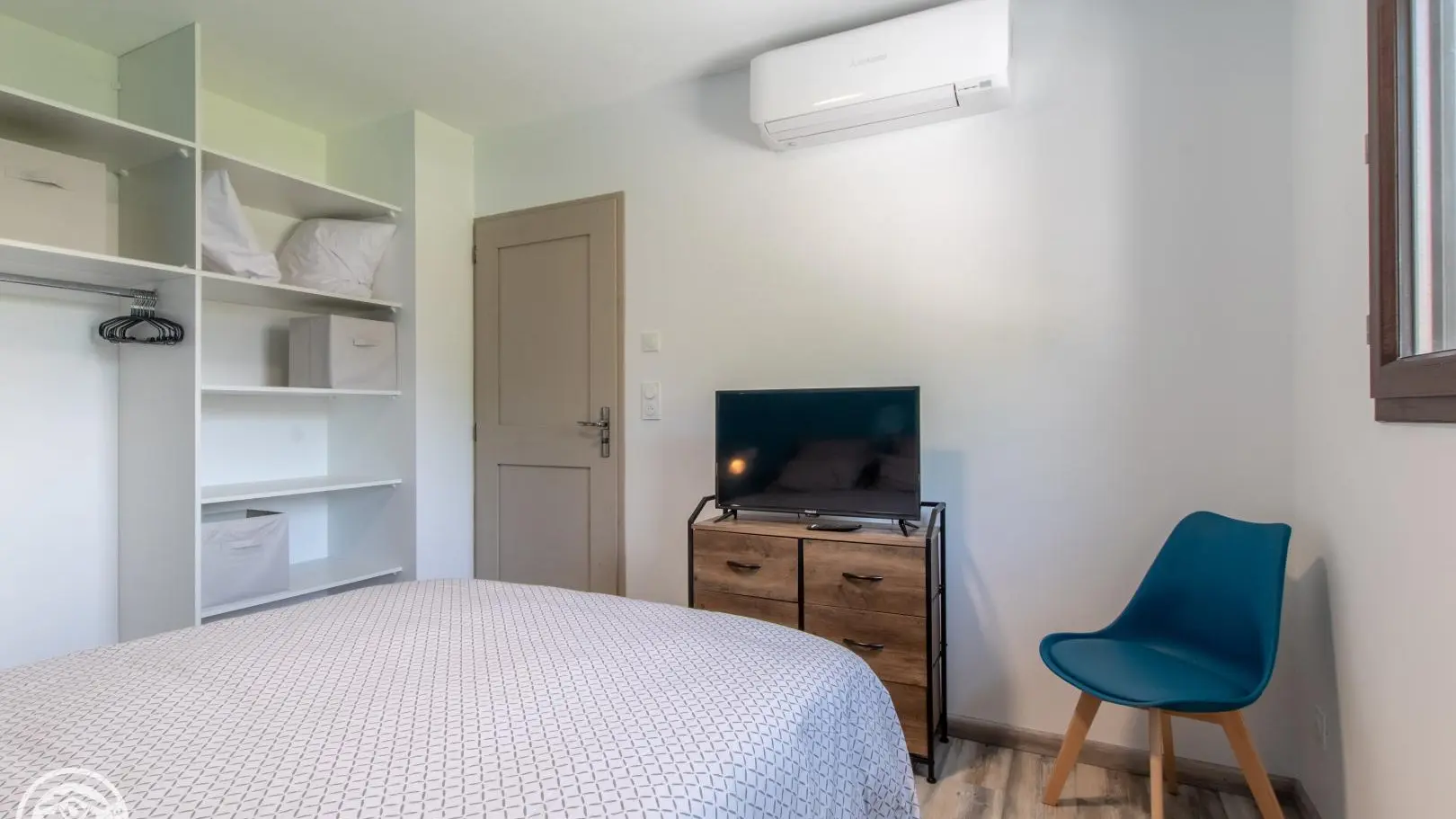 Une chambre avec lit 140x190cm, télévision connectée, armoire-penderie, climatisation réversible.