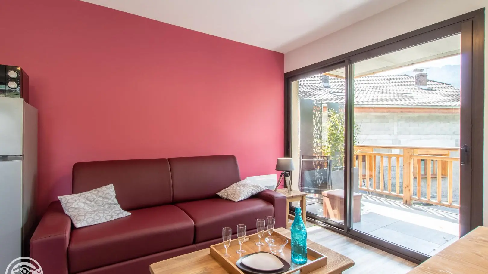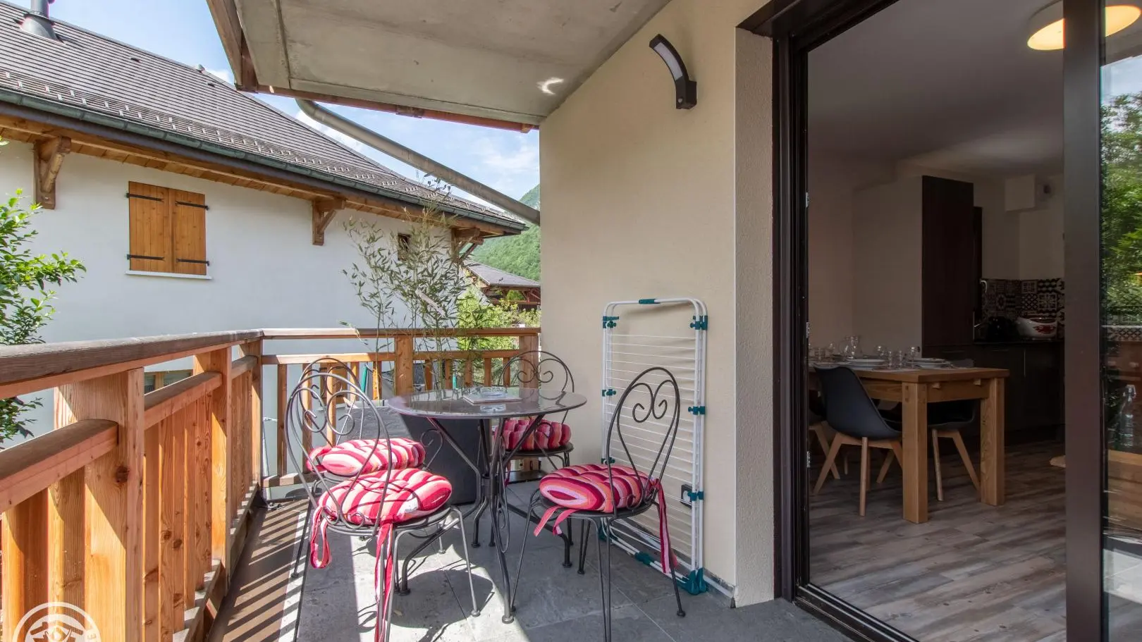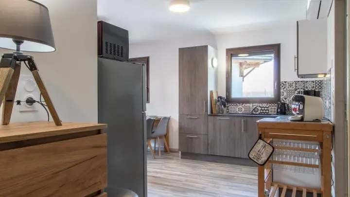 Dans une ancienne grange complétement rénovée en un petit immeuble comprenant quatre autres gîtes (2 au même niveau, 2 au 2ème étage), appartement de 40m² aménagé au 1er étage. Gîte situé dans un hameau calme de Doussard.