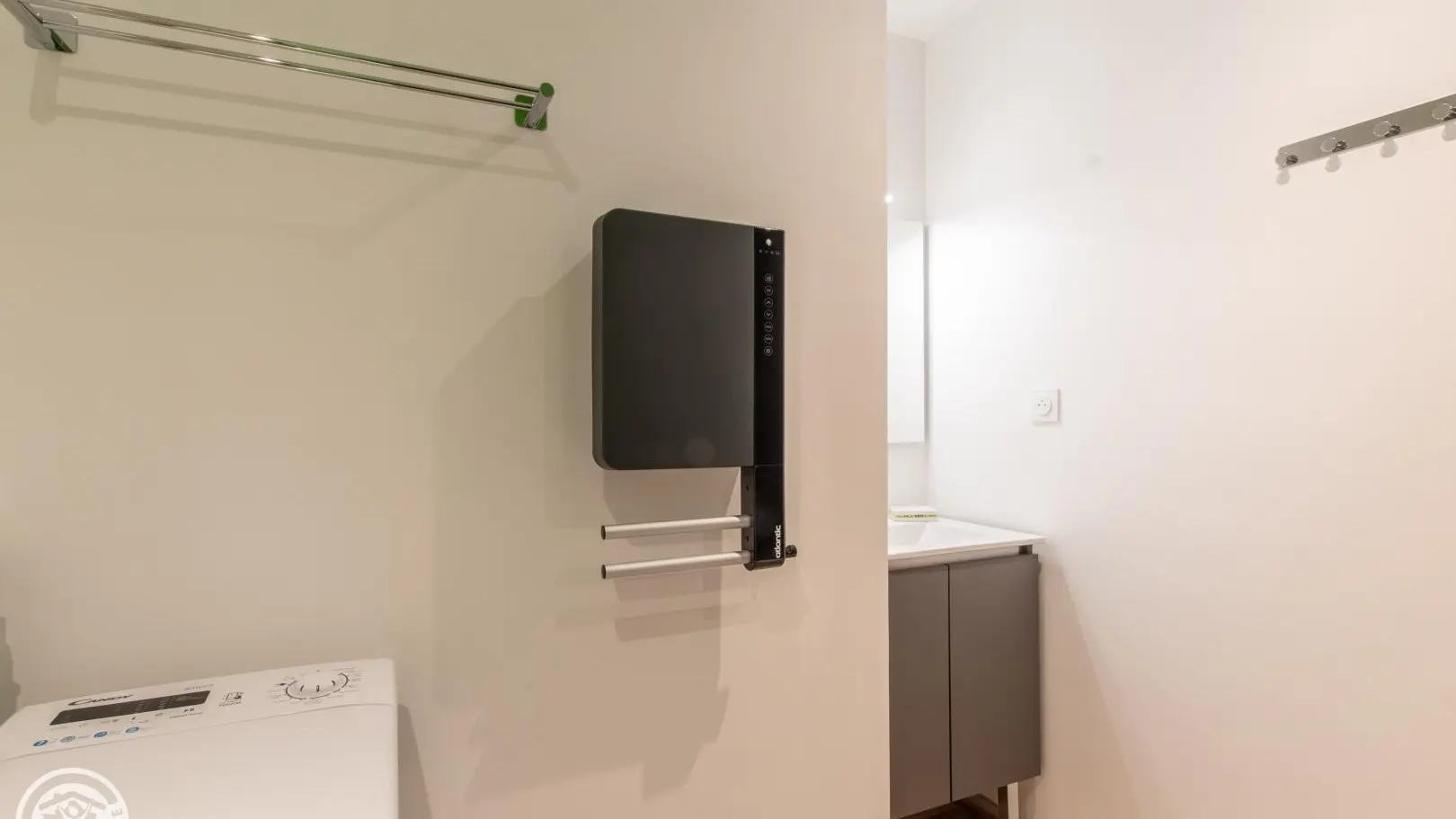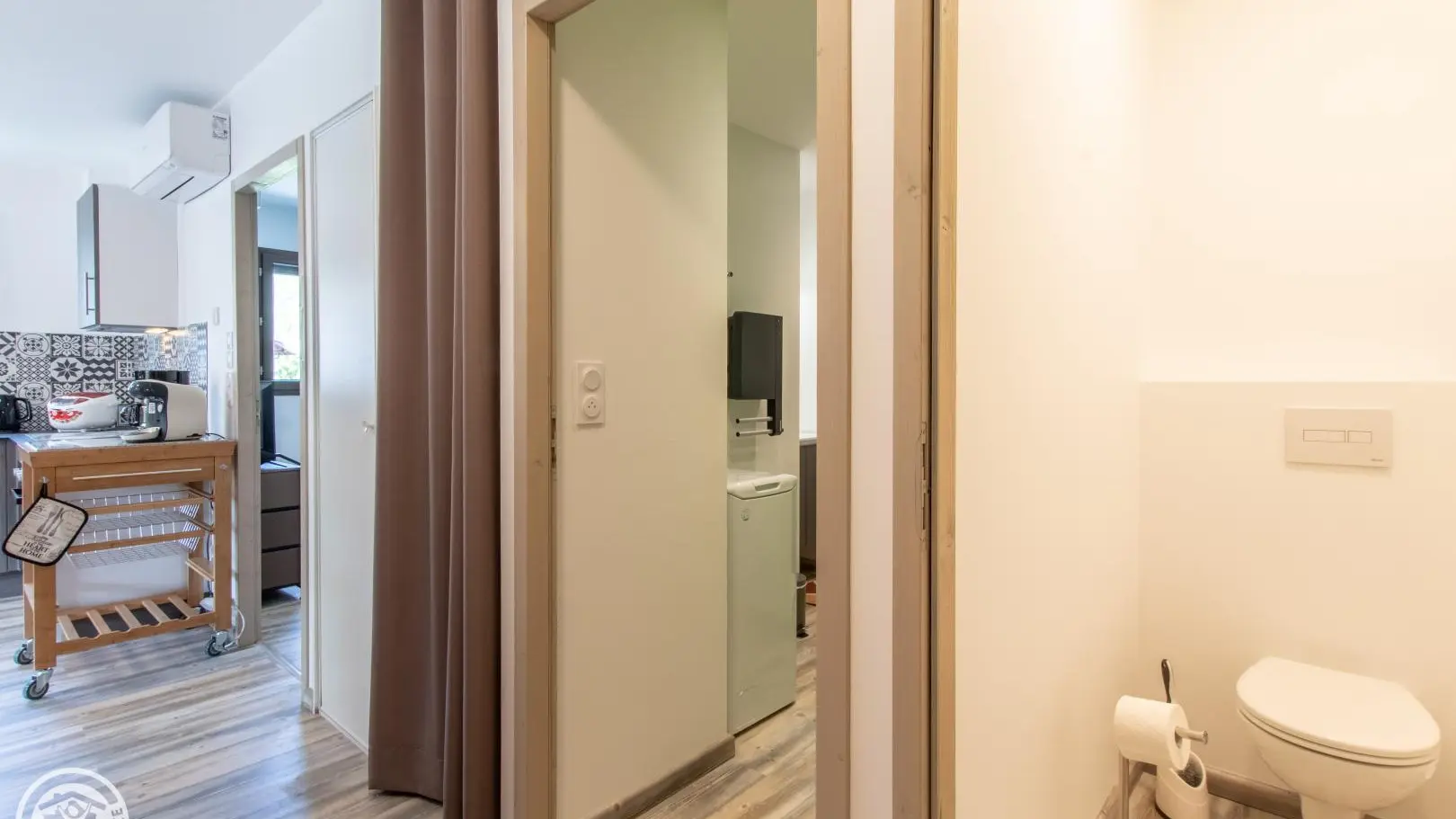 Salle d'eau (douche, vasque sur meuble, radiateur sèche-serviettes, lave-linge). WC indépendant.