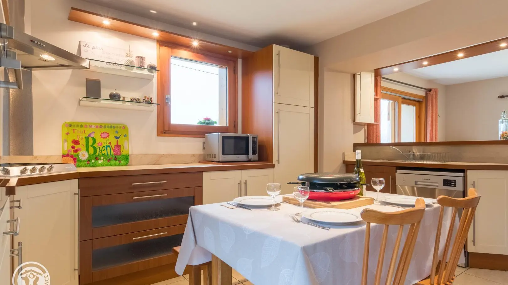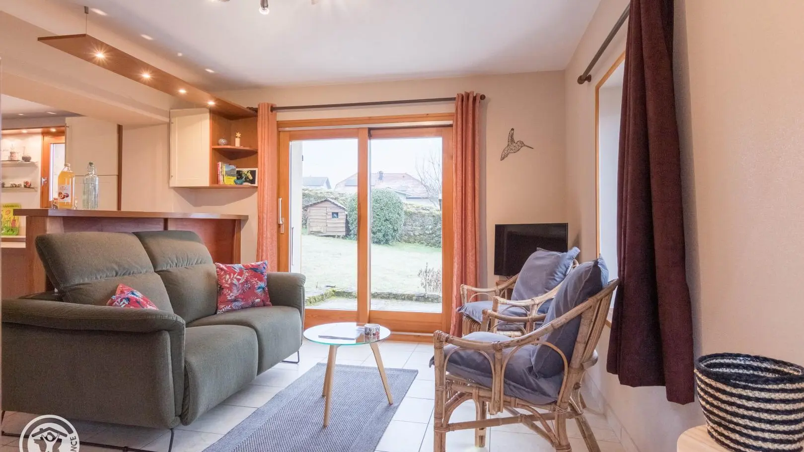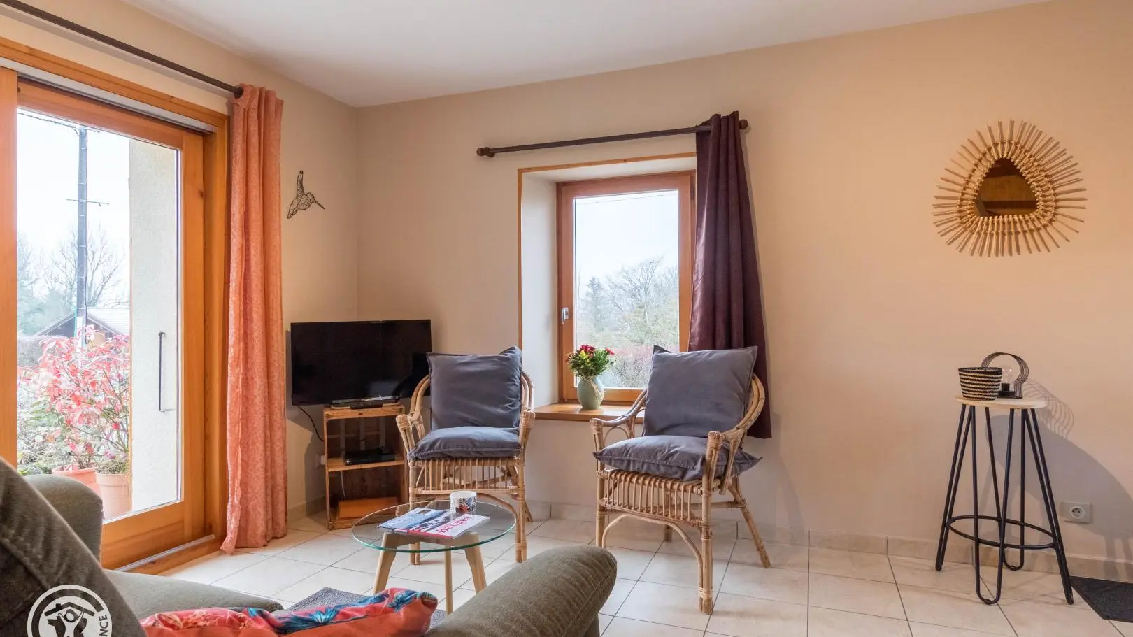 Gîte de 66 m² dont 5 m² sous mansarde dans une maison indépendante sur deux niveaux à proximité d'une petite route du hameau. Accès par escalier extérieur large et abrité. Entrée sur le séjour avec espace détente/TV (canapé, fauteuil, pouf, table basse) et accès terrasse et terrain extérieur privatif. Cuisine ouverte sur séjour avec espace repas et bar séparant la cuisine du séjour. Lave-vaisselle, dans la partie bar, réfrigérateur et congélateur indépendant.
